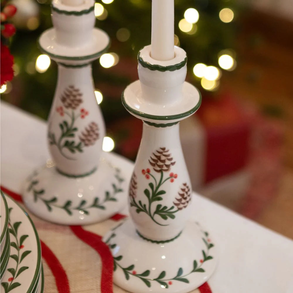 Bring a touch of holiday warmth to your table with our Holly & Pinecone Ceramic Candle Holders. Hand-painted with charming pinecones, holly sprigs, and green accents, these ceramic holders capture the spirit of the season in timeless style. Perfect for dressing up your mantel, table centerpiece, or buffet, they pair beautifully with classic tapers for a cozy, festive glow.
