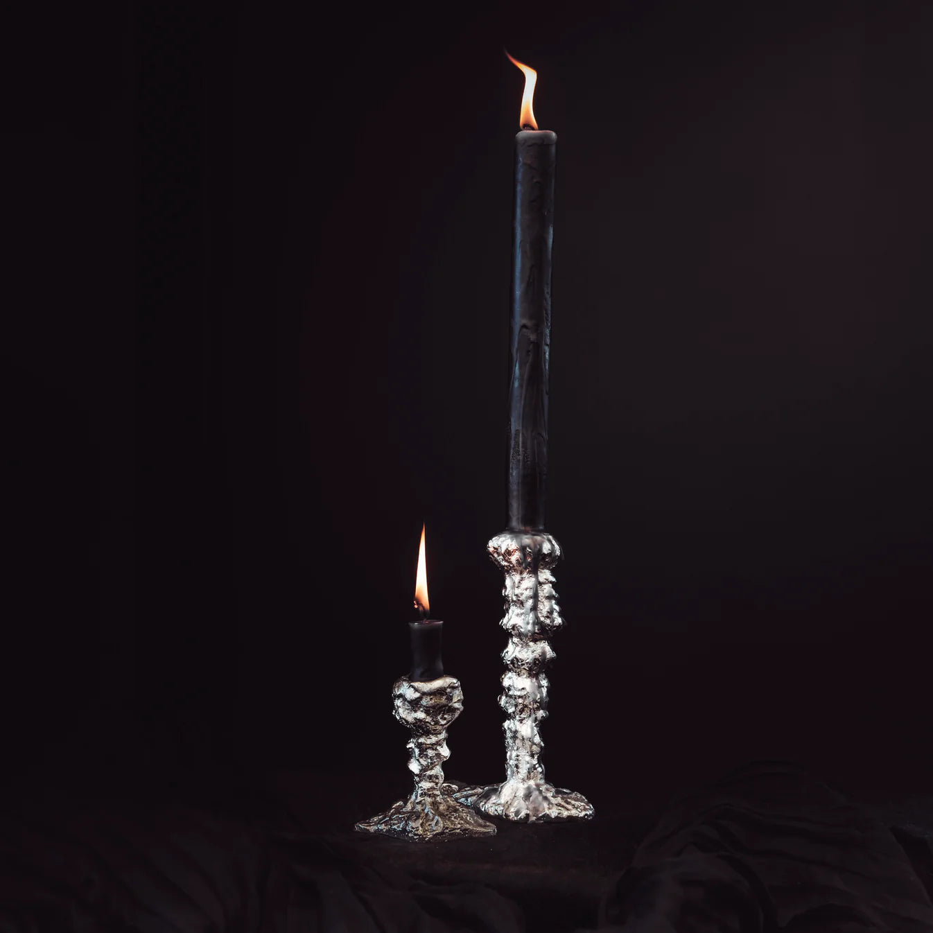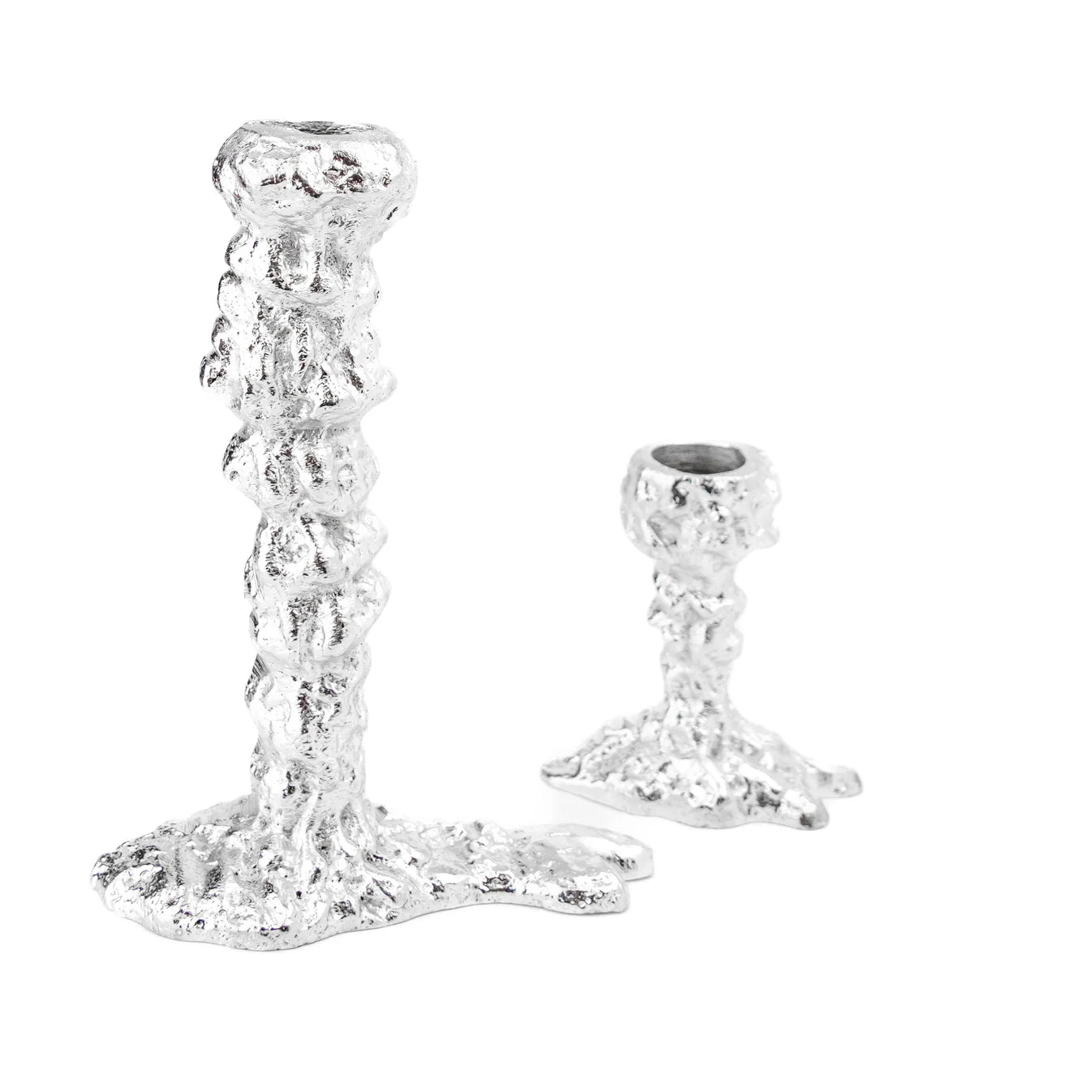 These hand carved & cast sculptural candlestick holders are modeled after those memories of self meditation among the sand making drippy sand castles.