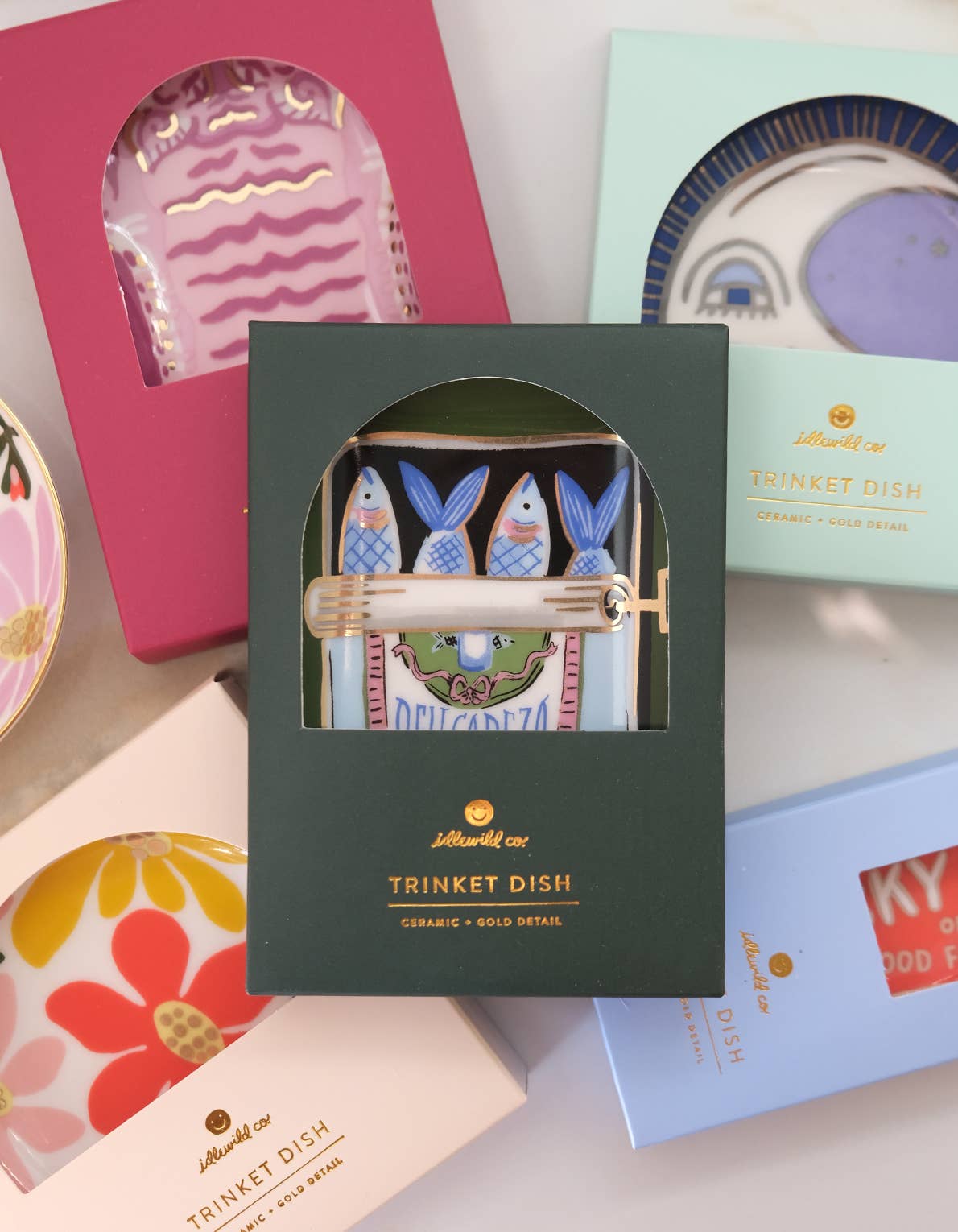 A fan favorite giftable–Our ceramic trinket dishes are the perfect catchall for your nightstand or dresser. White porcelain is adorned with our colorful, hand-painted designs, and we lined the edge in 10k gold for added flair. Perfectly packaged in plastic-free gift boxes, pretty enough to give without wrapping!