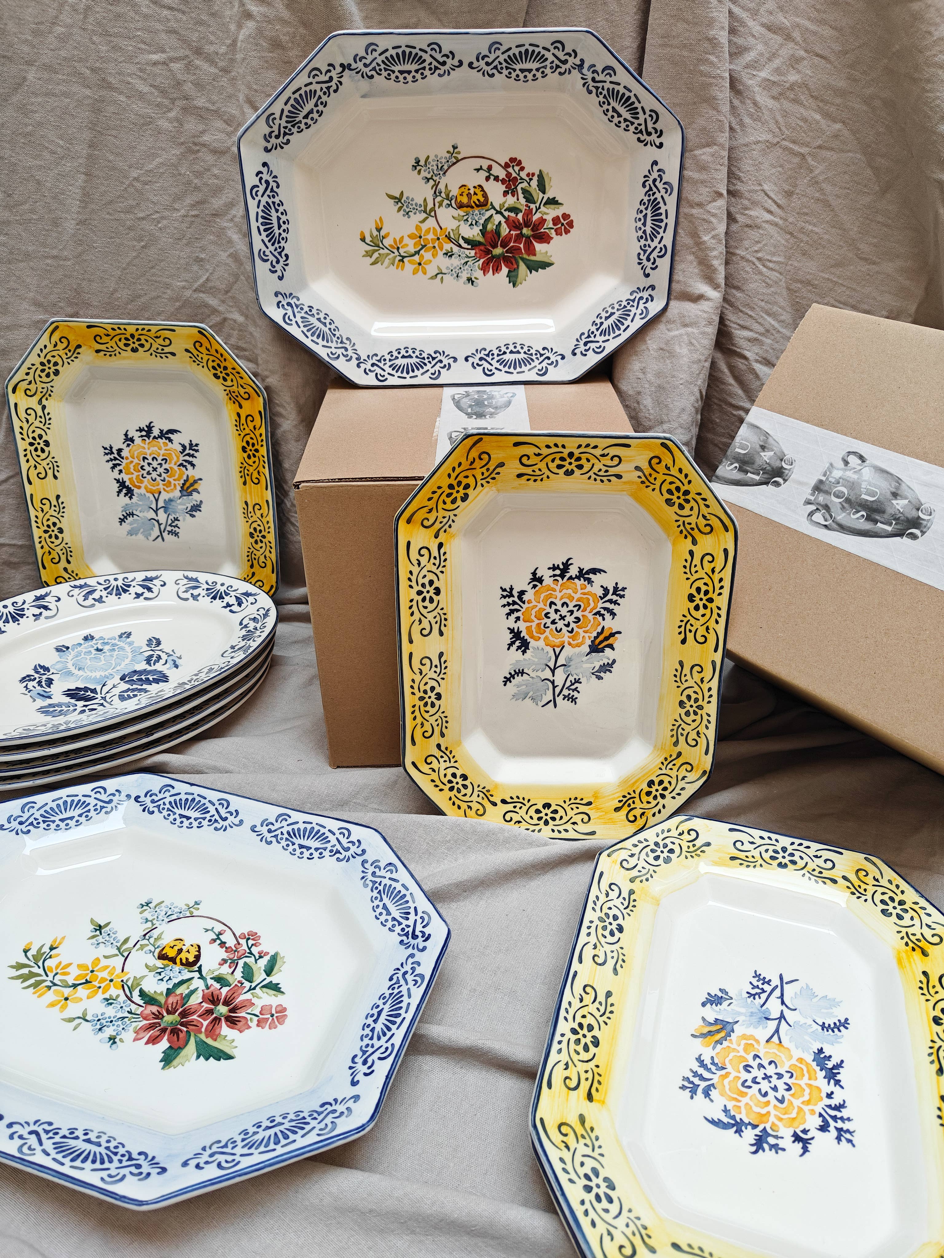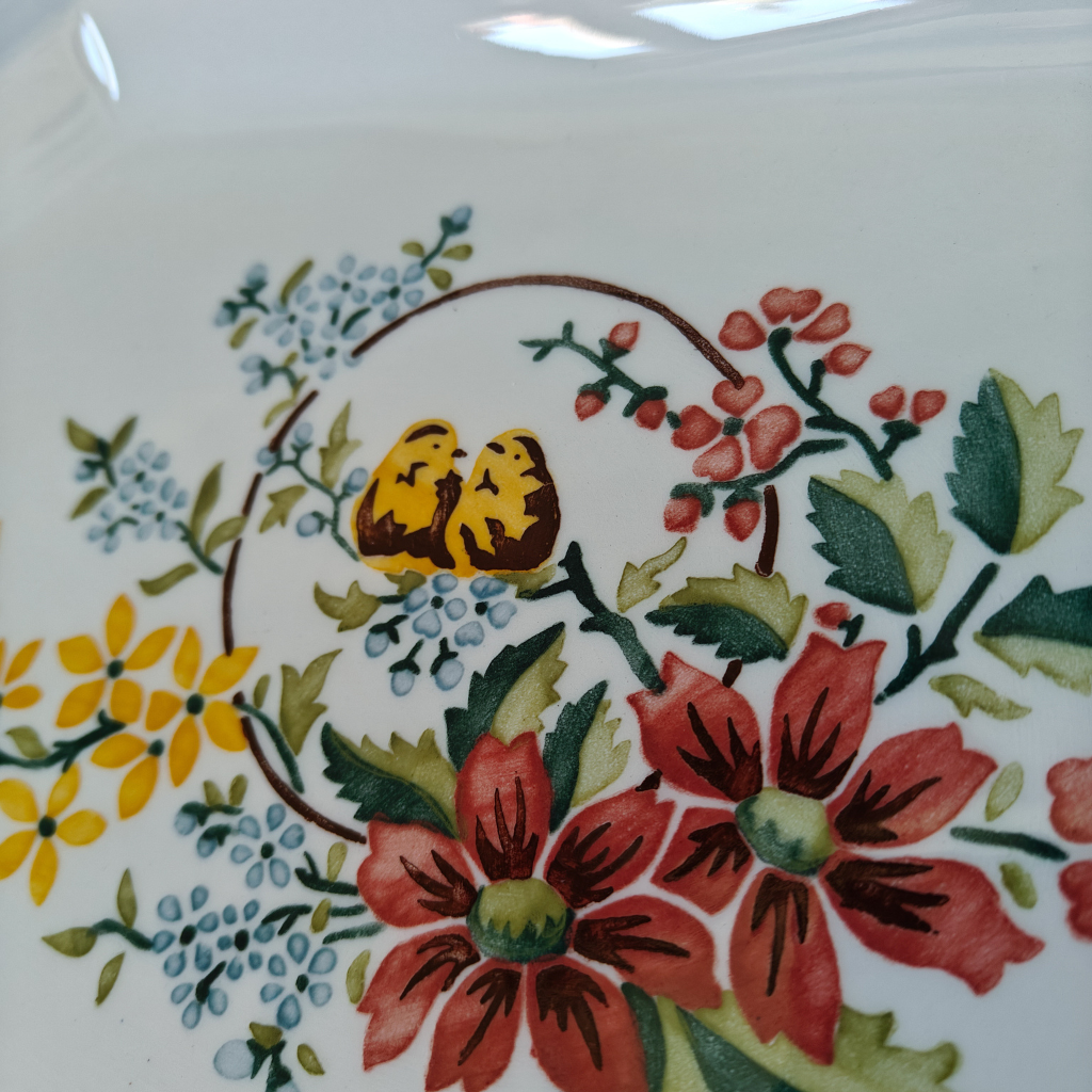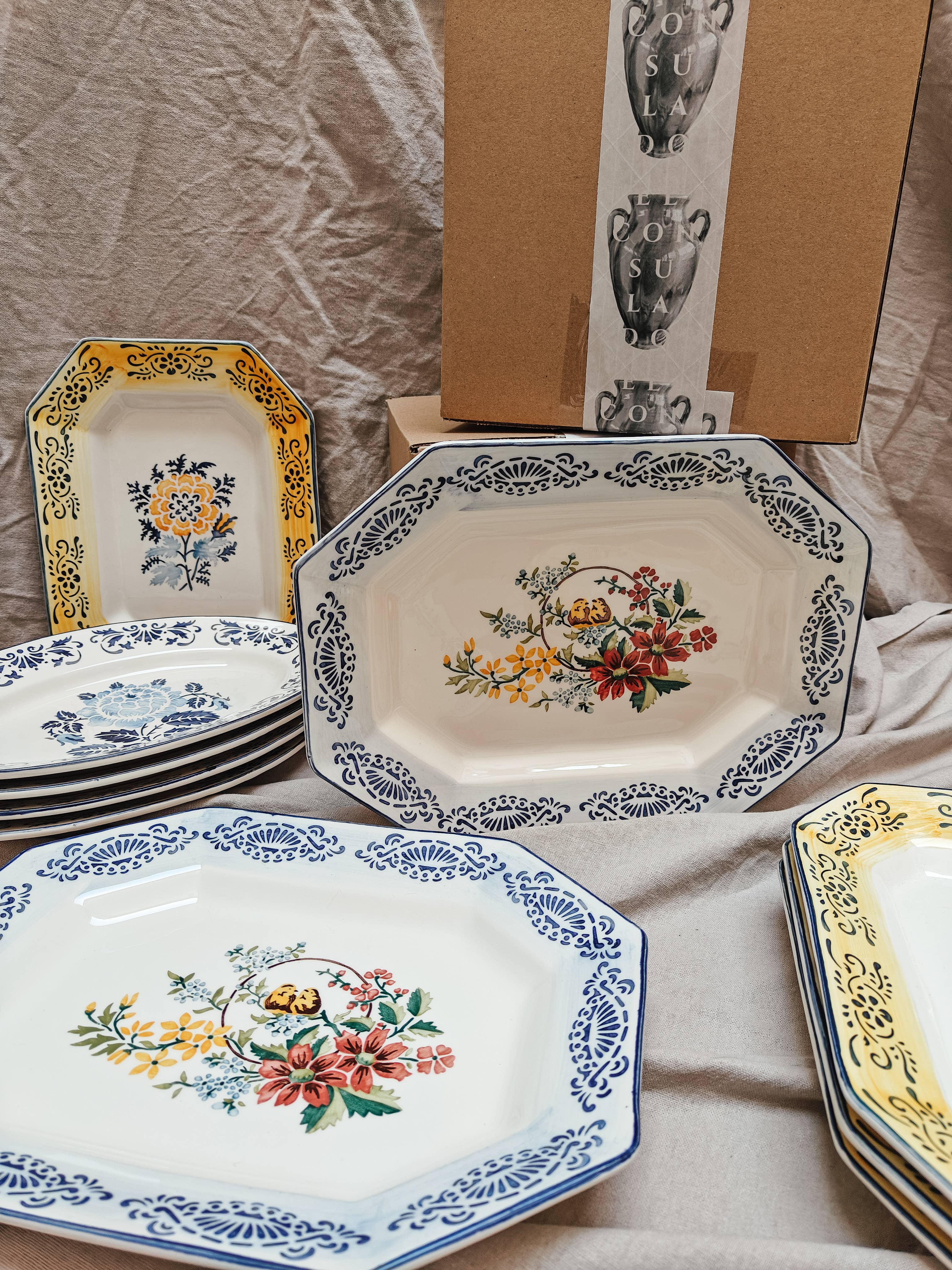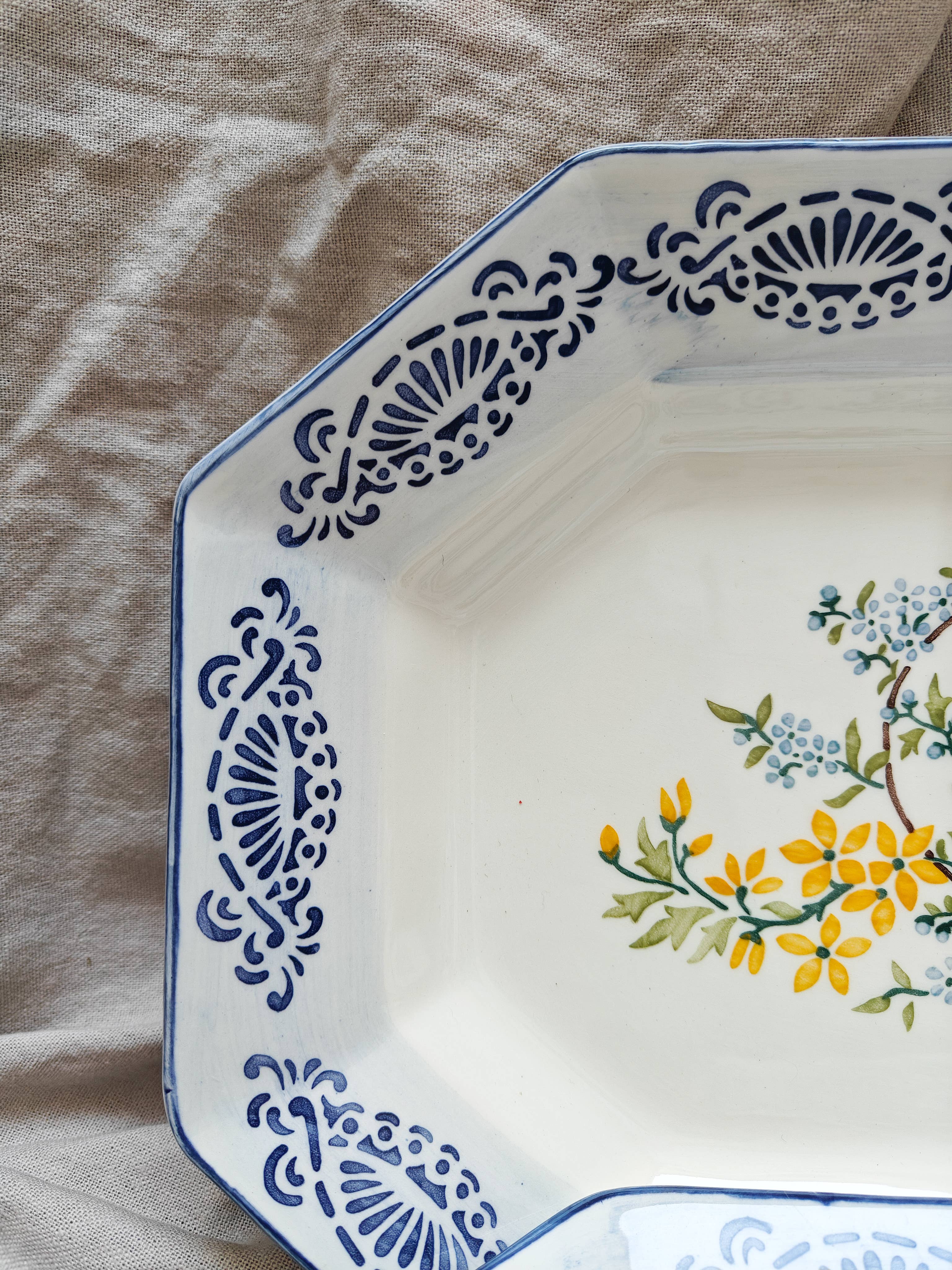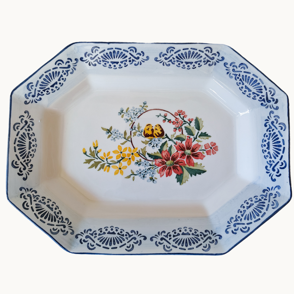 Portuguese octagonal platter handpainted by Jorge using reissued stencils. We loved these nestled birds surrounded by flowers and we combined them with a brushed rim in light blue with a geometrical border in deep Portuguese blue.