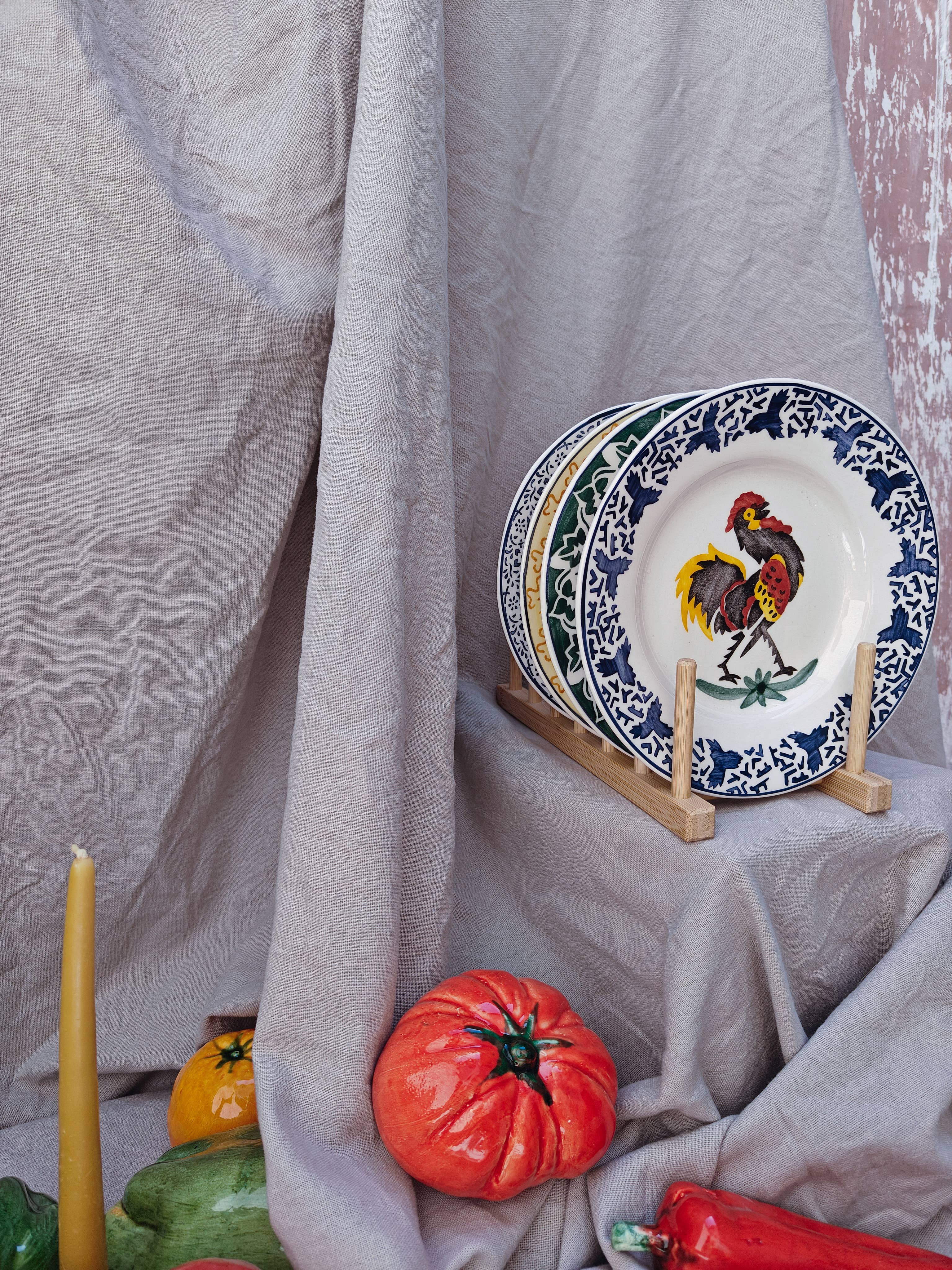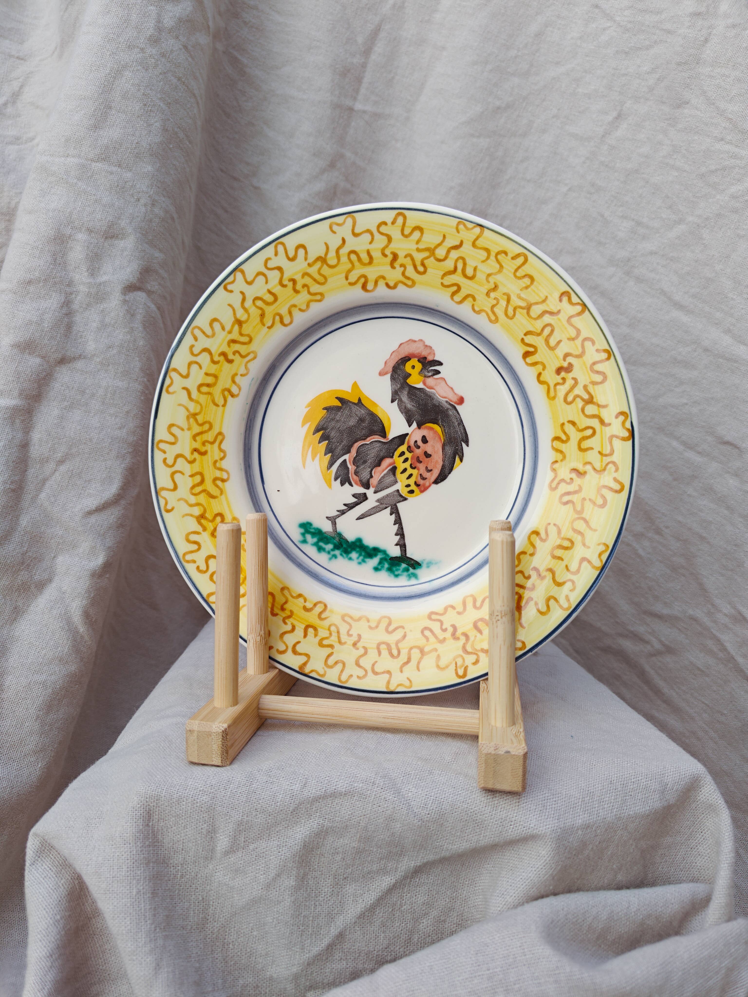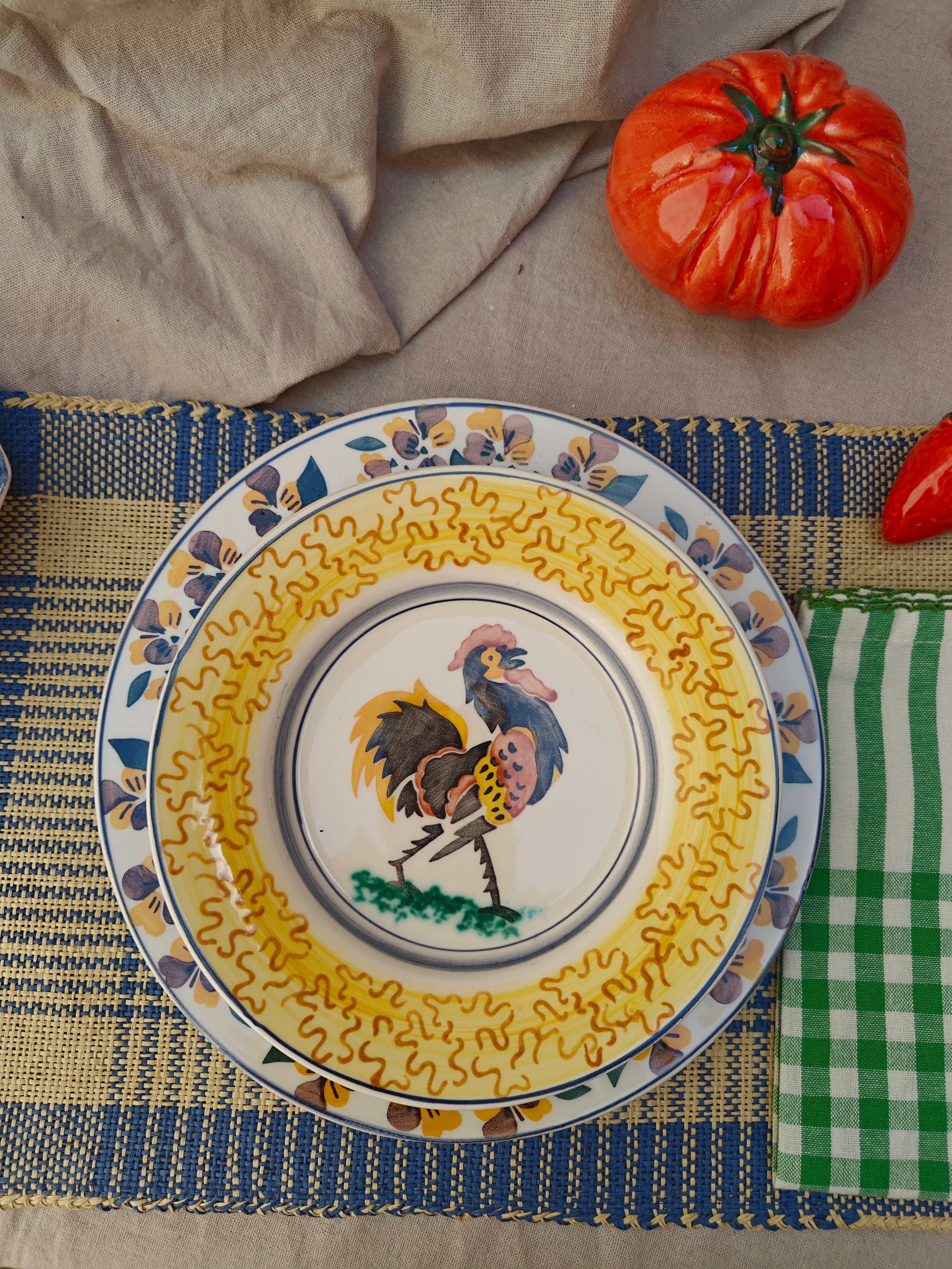 These hand-painted ceramic plates are made in Portugal using traditional techniques. Each one features a deep blue border and a central motif inspired by Portuguese folk art — including variations like the Galo de Barcelos rooster, a symbol of good luck and faith.