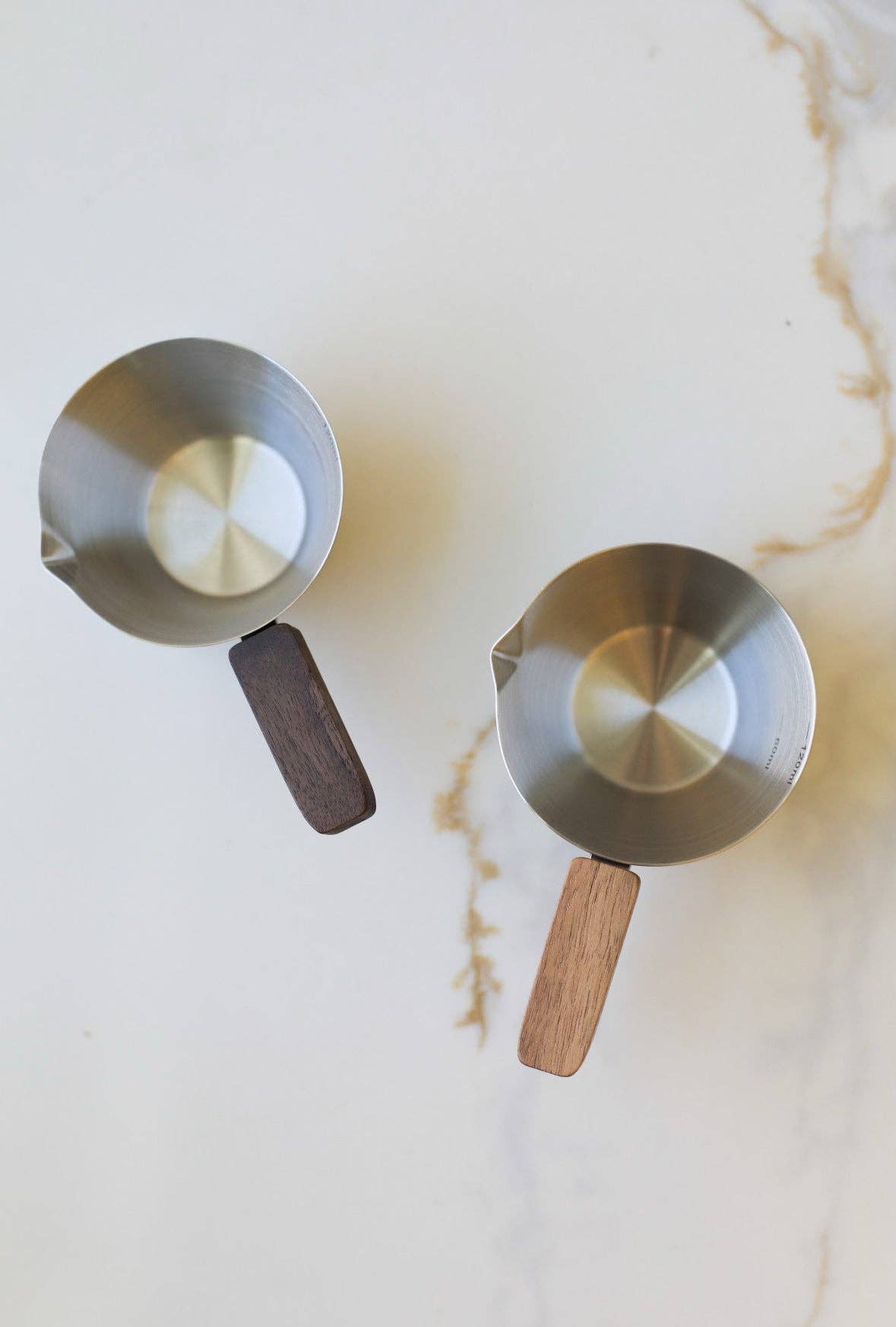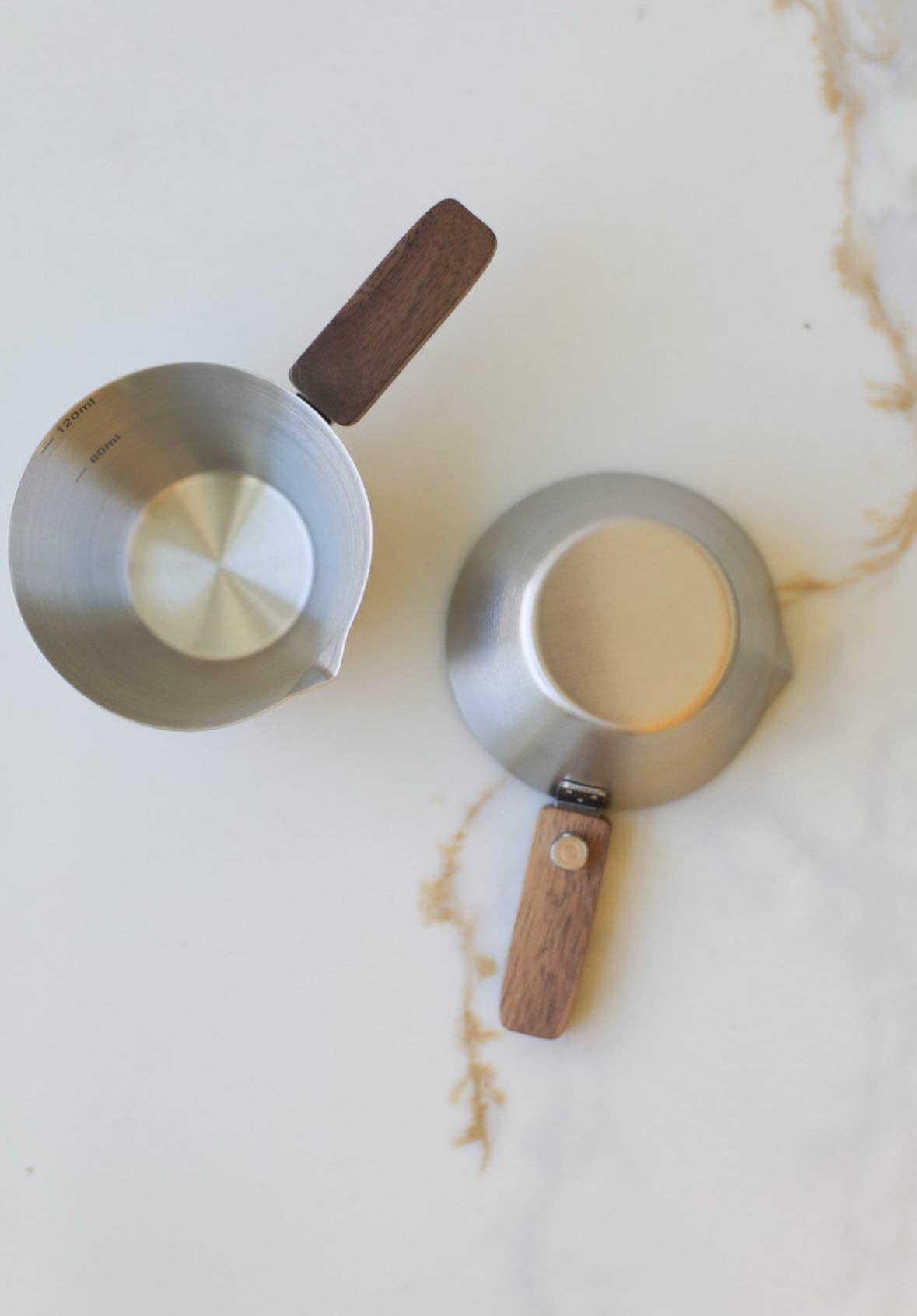 Sleek white ceramic pourer with 60/120ml marks. Wooden handle for easy grip—ideal for precise tea, coffee, or baking measurements. * Material: stainless steel + wood * Size: 4.72 x 1.97” / 12 x 5cm ; 120ml