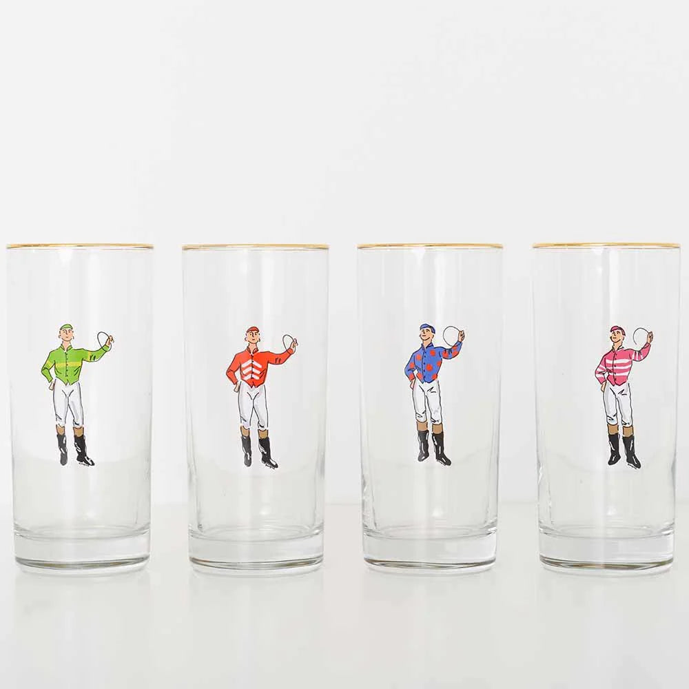 Off to the races! For the equestrian enthusiast, elevate your glassware collection with our Jockey Silks Highball Glasses. Featuring four unique jockeys in bright colored silks and a gold metallic rim, this glass brings sophistication to both everyday and formal gatherings.