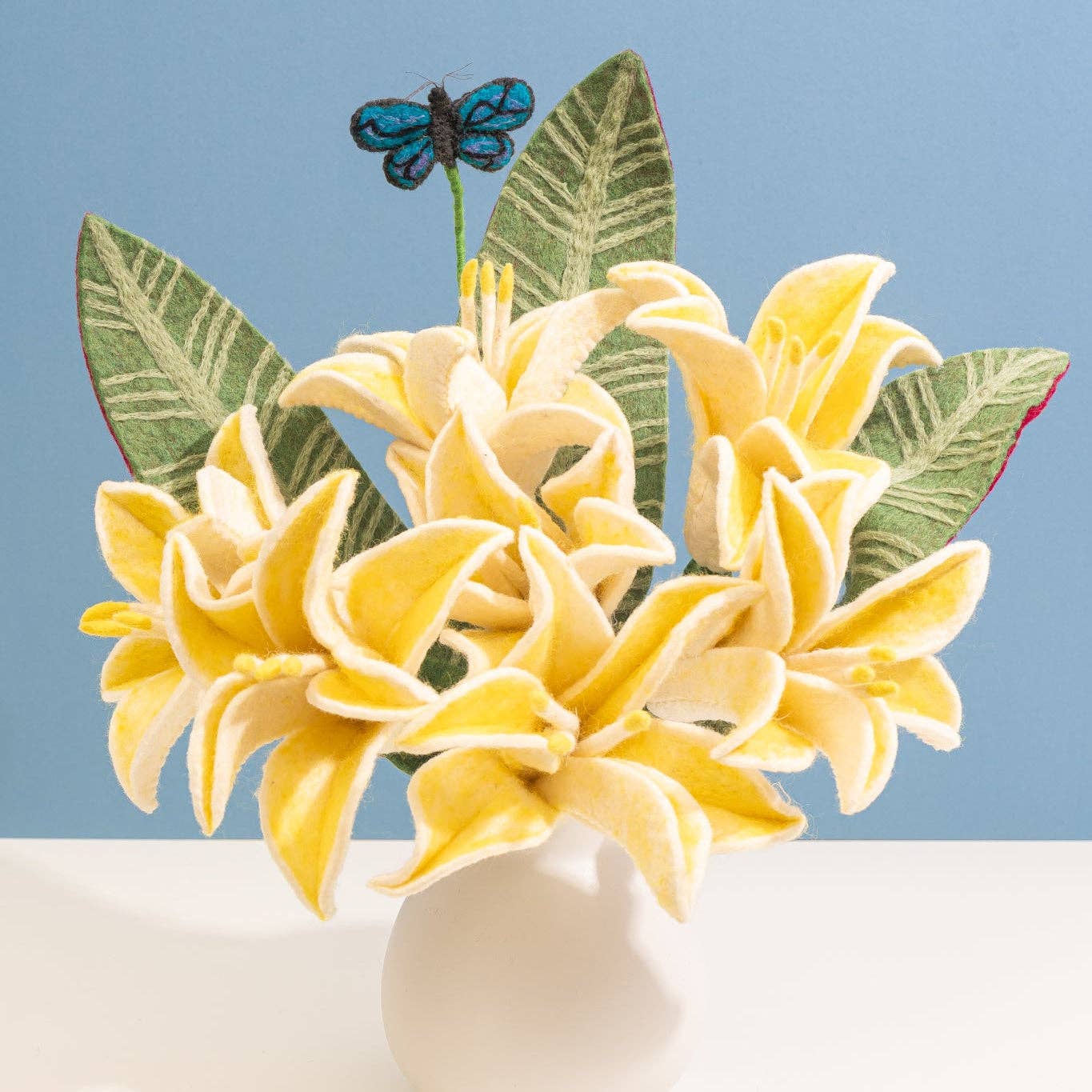 Celebrate spring's most iconic bloom with our handcrafted Easter Lily Bouquet! Soft yellow lilies with delicate white edges nestle among lush green leaves, topped with a cheerful felt butterfly. Each piece is meticulously handfelted by women artisans, capturing the graceful beauty of Easter lilies that symbolize renewal and hope. This arrangement brings seasonal elegance to your home without the wilting or maintenance. Perfect for Easter celebrations, spring décor, or gifting to someone special. Please note: If one of the stems in your bouquet is out of stock, we’ll replace it with a similar stem in color and style to ensure a beautiful, cohesive look. Felted Wool Azo-free dyes, eco-friendly and non-toxic
