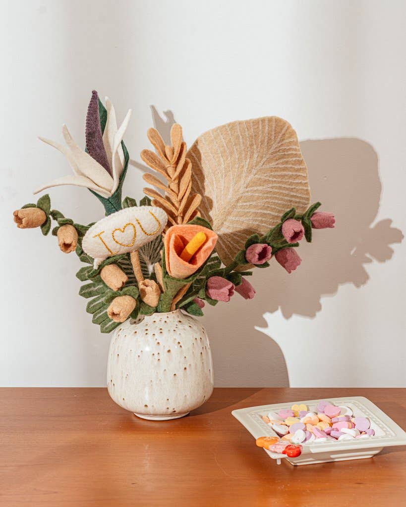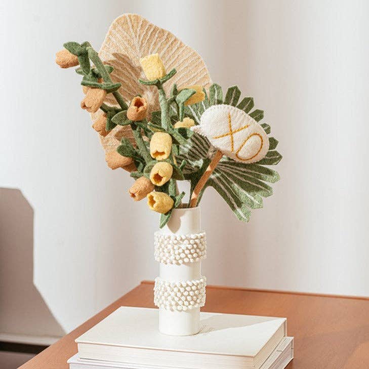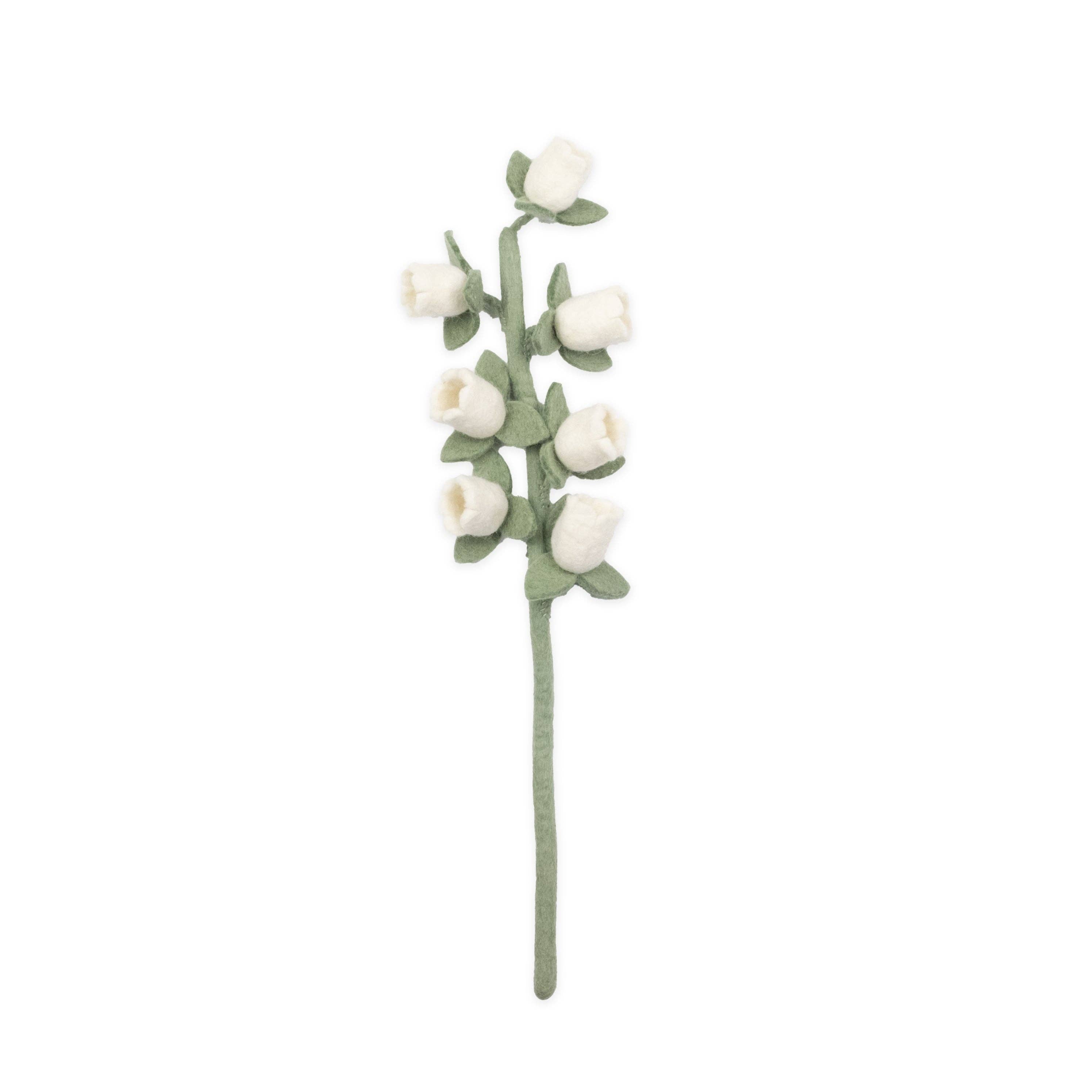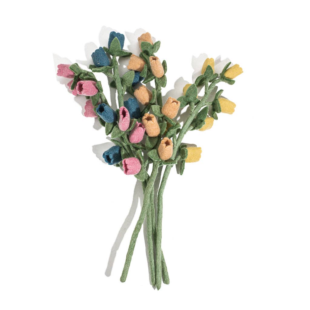 The beautiful Felt Bellflowers are a soft, subtle and sweet addition to any bouquet, or bundled together by themselves. Made with felted wool by artisan women in Nepal, the Bellflowers feature seven buds each, strung along a soft green bendable stem. Display them in a Tall Vase to show them off.