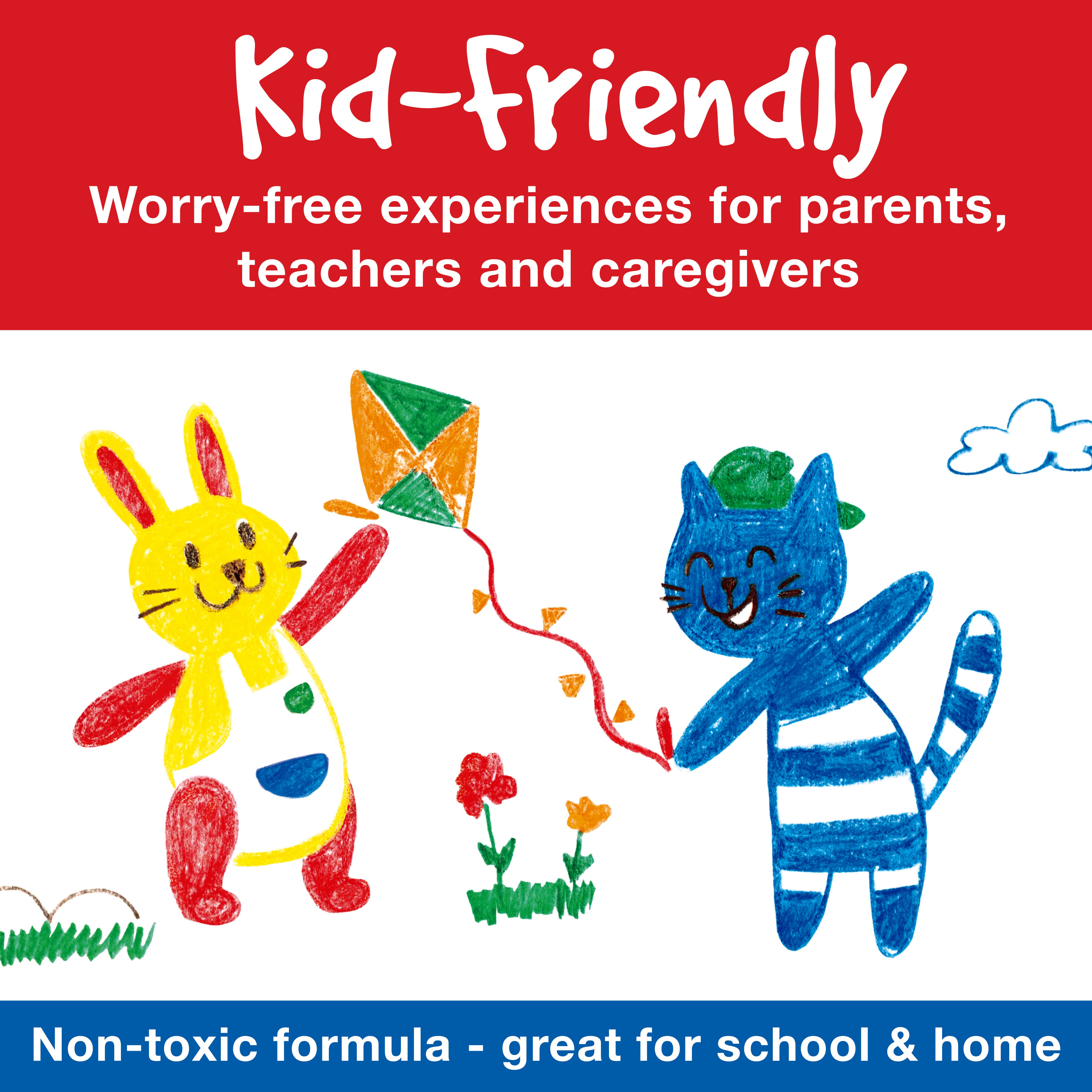 Rich crayon formula is non-toxic and safe for little ones. Wash out of most fabrics for peace of mind and easy clean-up. The large, round shape is easy for little hands to hold.