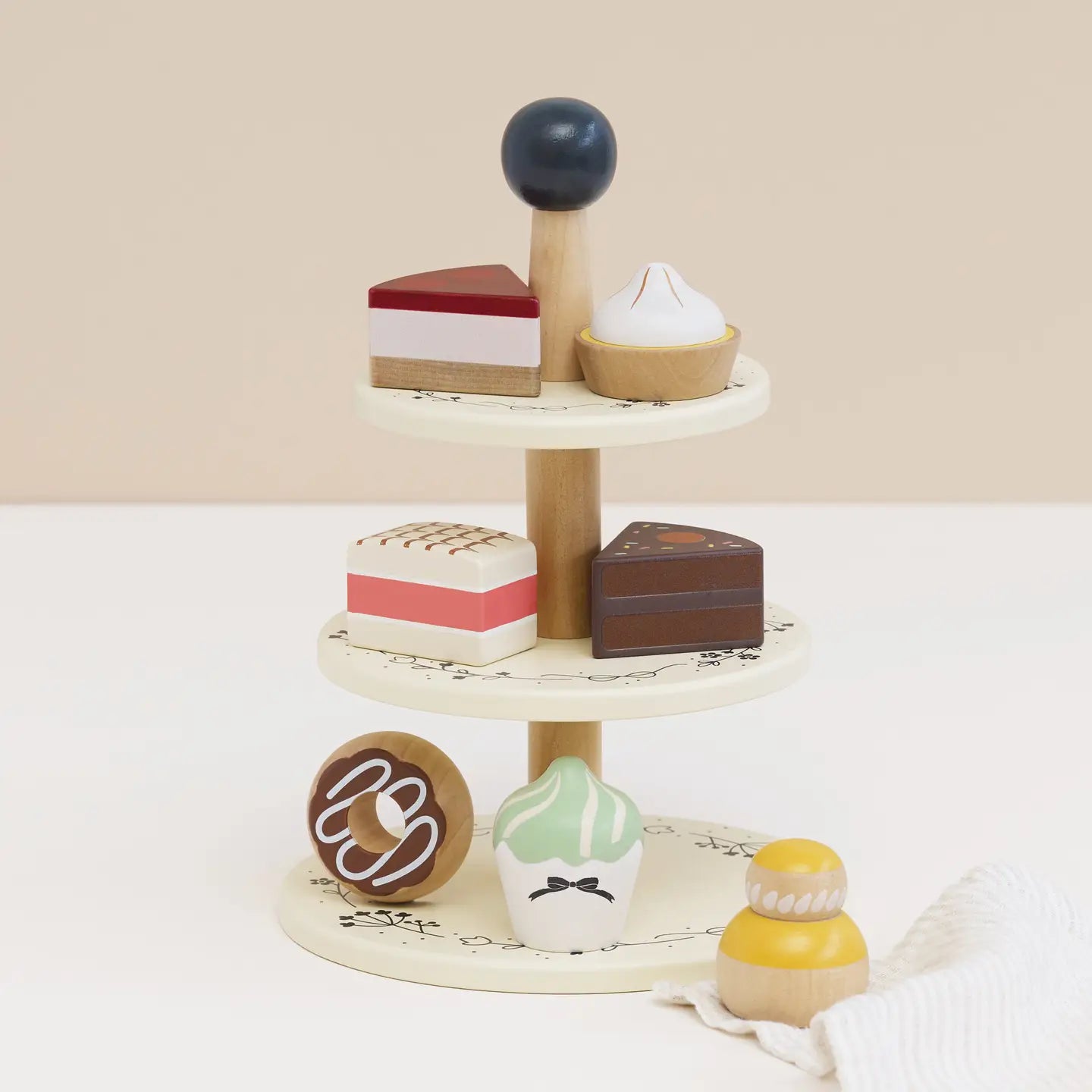 Our lovely Three Tier FSC® - certified wooden Cake Stand comes with a selection of 7 delectably sweet treats, perfect for any occasion! Each tier of this beautifully adorned cake stand features a different mouth-watering delight. Let taste buds dance as you indulge in a lemon and cream choux bun, tantalise your senses with a zesty lemon meringue tart, and surrender to the irresistible temptation of a chocolate doughnut, a decadent three-layered cake, whimsical swirl cupcake, a delight raspberry cream cake, and a rich chocolate cake. This cake stand set is not only visually stunning but is also made from sustainably-sourced wood and is completely plastic free! It is decorated in non-toxic water-based or stained paints for safe play too. This fun-filled set brings together elegance, imagination, role play and fun in any home!
