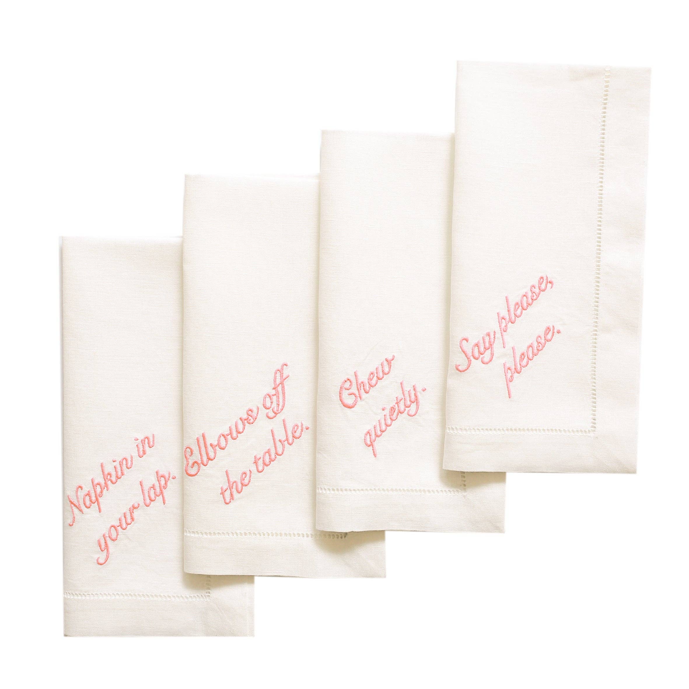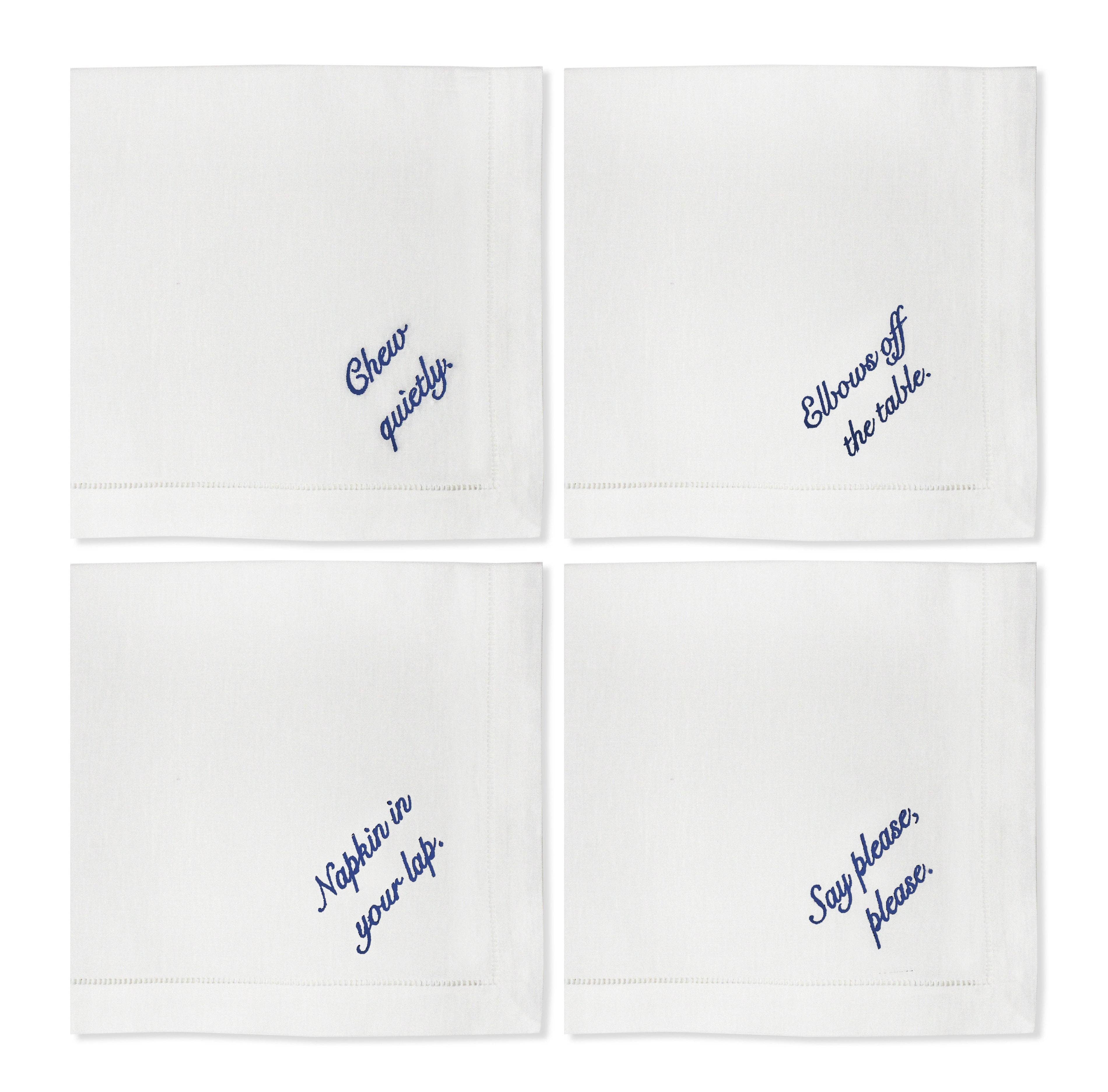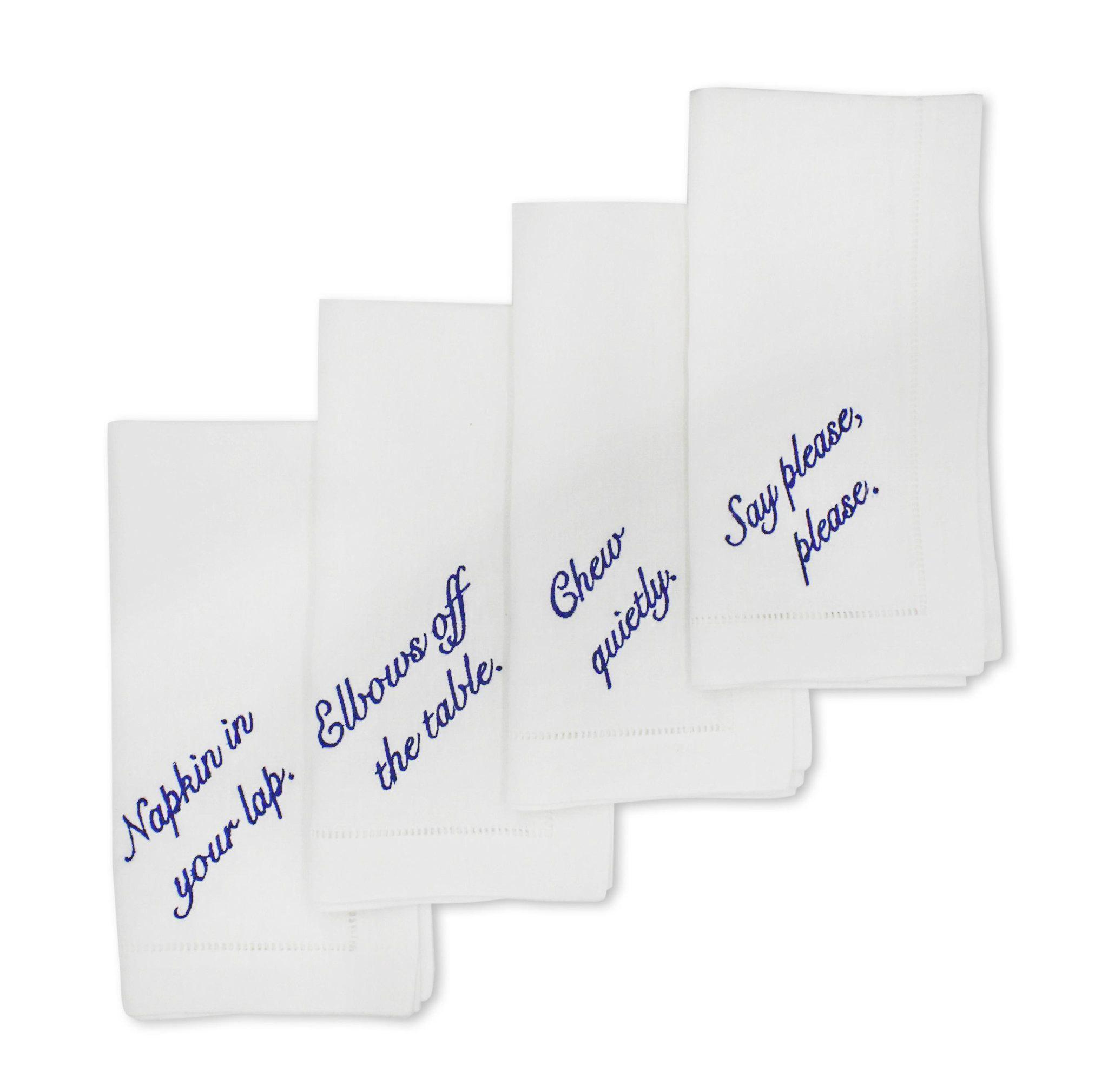 A napkin set that Emily Post would love! Each napkin shares some table wisdom: " Say please, please."; "Chew quietly."; "Elbows off the table."; and "Napkin in your lap." 100% Linen napkins, embroidered with cotton thread. 20 inches x 20 inches. Handwash in delicate detergent, air dry, and gently iron. Or, dry clean.