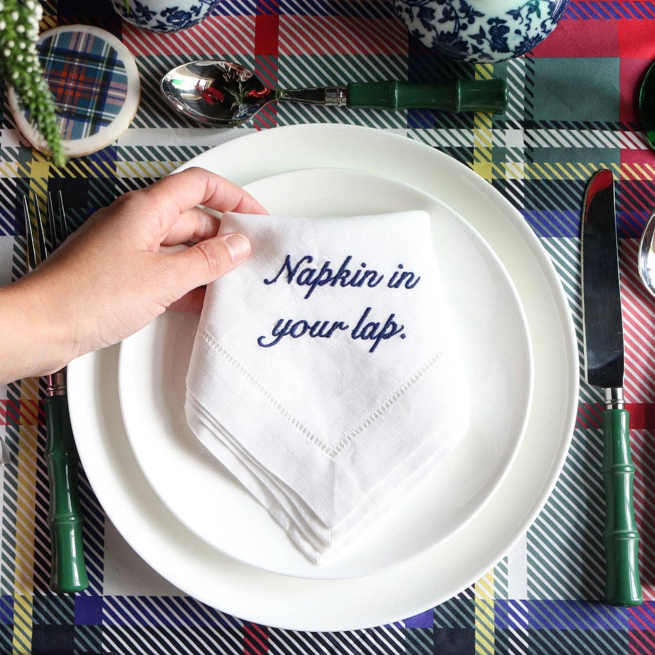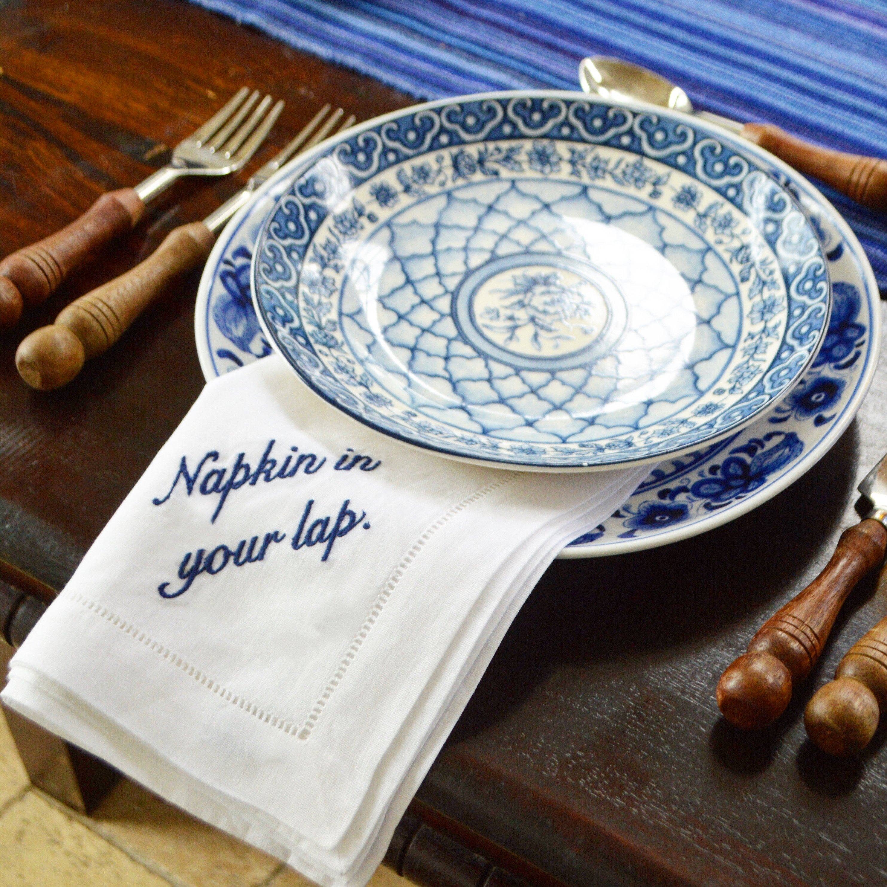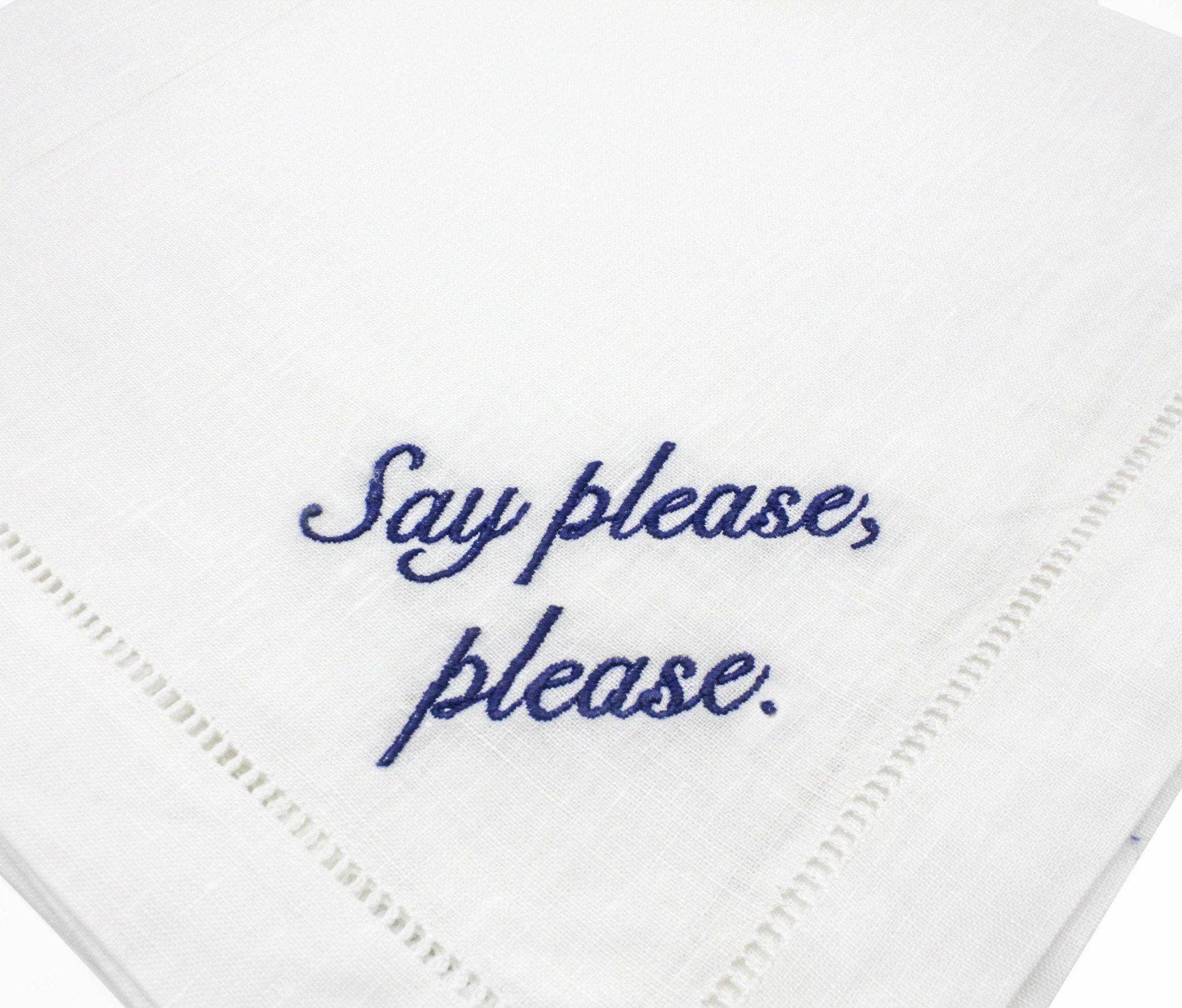 A napkin set that Emily Post would love! Each napkin shares some table wisdom: " Say please, please."; "Chew quietly."; "Elbows off the table."; and "Napkin in your lap." 100% Linen napkins, embroidered with cotton thread. 20 inches x 20 inches. Handwash in delicate detergent, air dry, and gently iron. Or, dry clean.