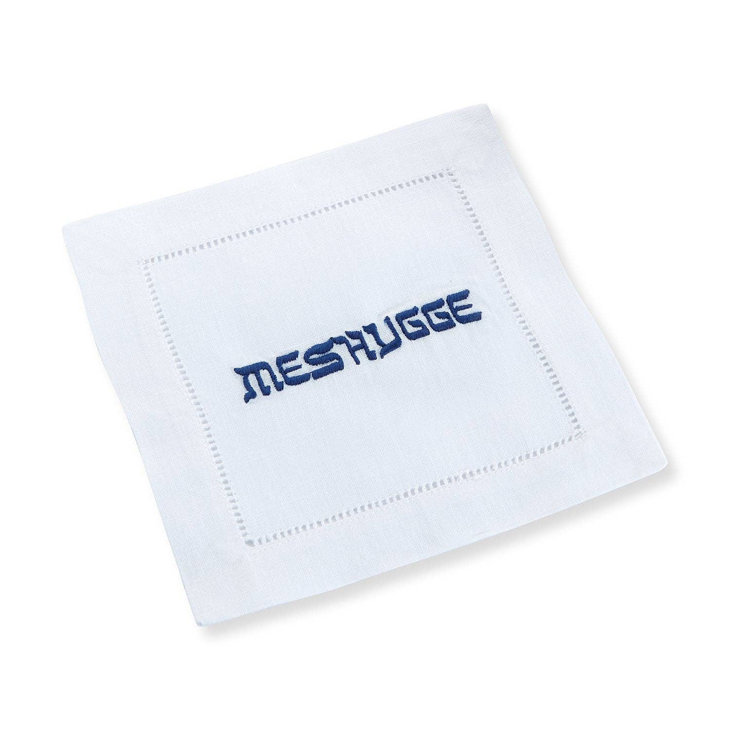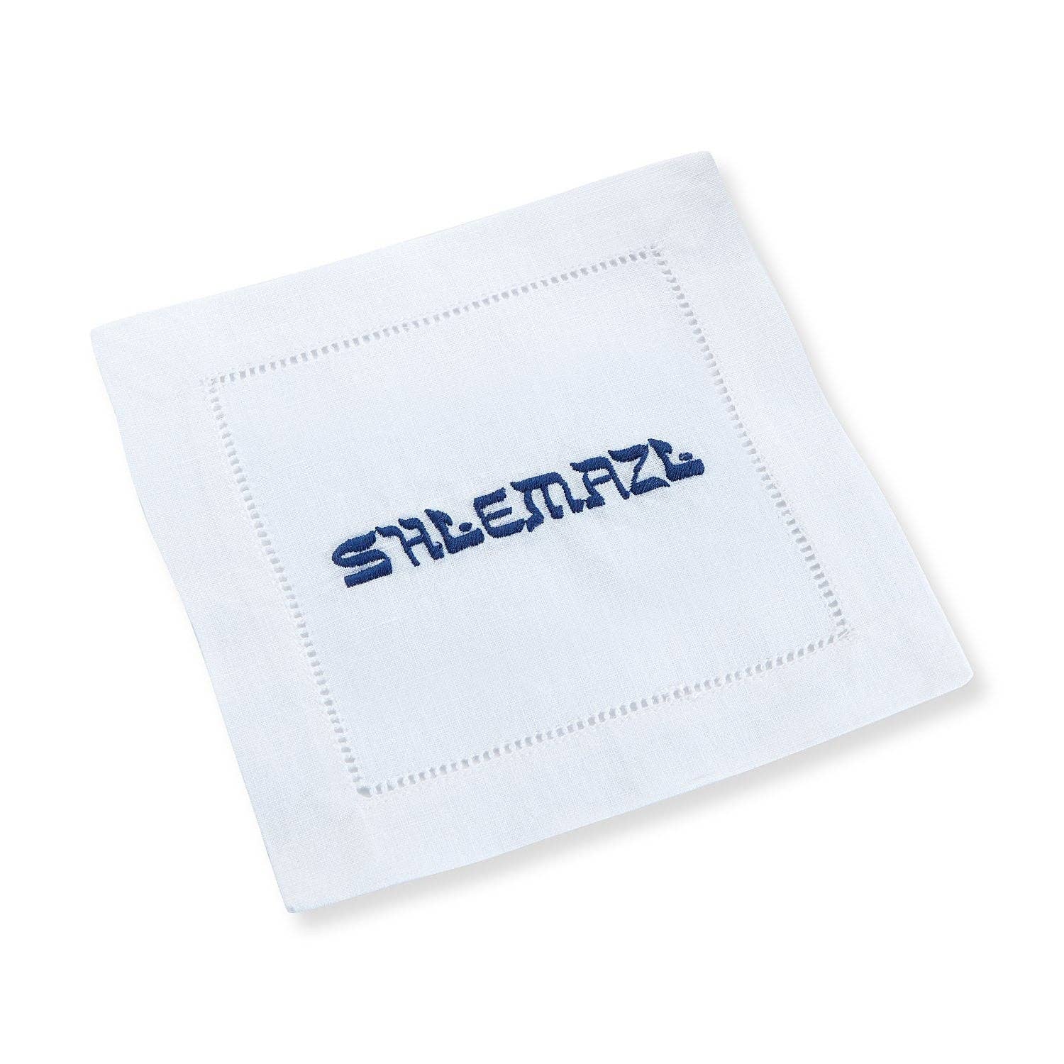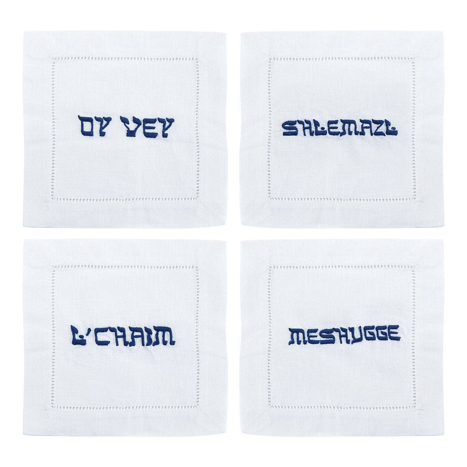 A perfect napkin set for anyone who loves Yiddish! There’s a napkin saying "Oy Vey" "L'Chaim" "Meshugge" and "Schlemazl" -- Sold as a set of 4. -- 100% Linen napkins. -- Approx. 6 inches x 6 inches. -- Handwash in delicate detergent, air dry, and gently iron. Or, dry clean.