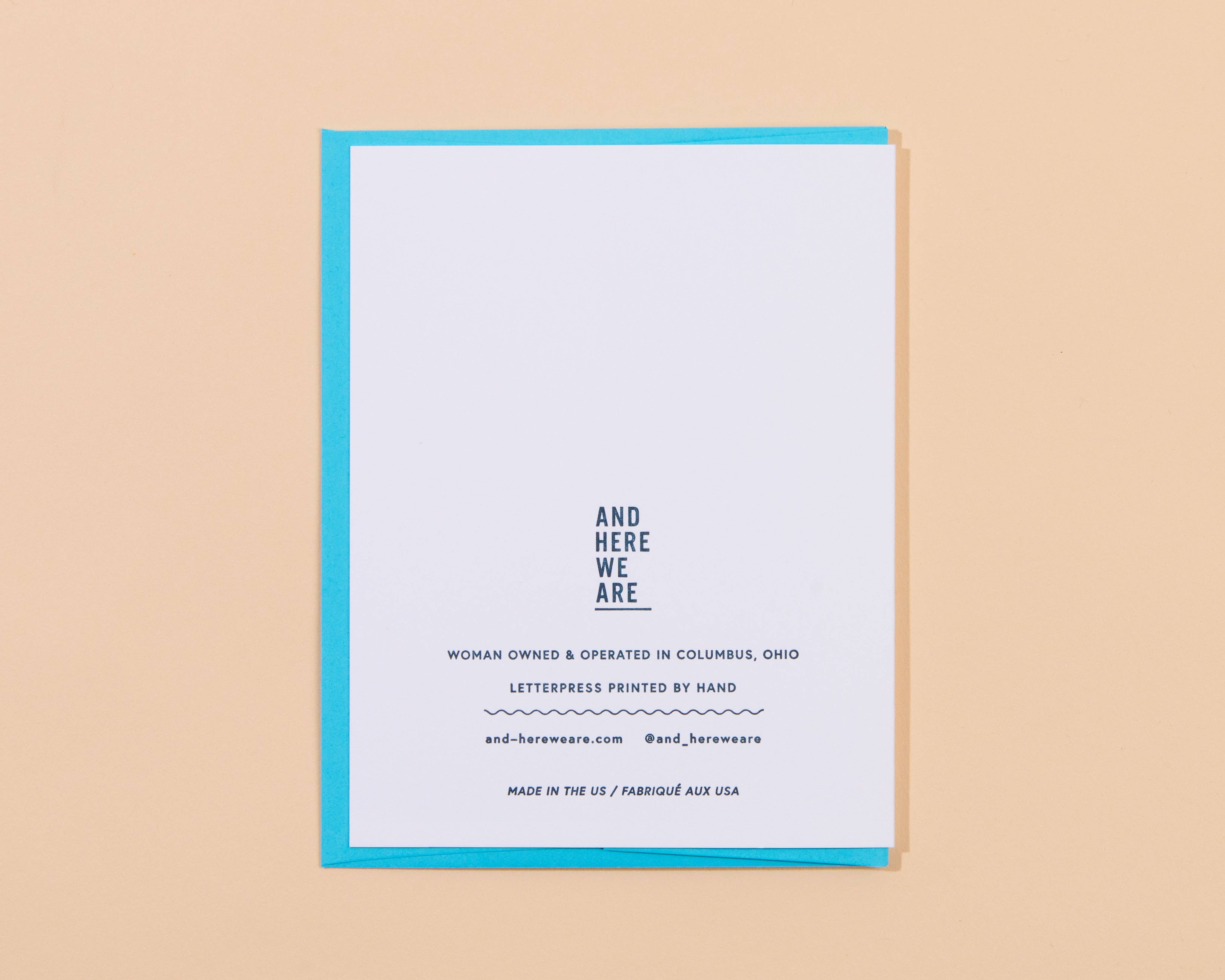 A perfect birthday card for a kid, or any robot enthusiast.  • Card reads: "Boppy beep day to boop" • Letterpress printed • Folded card measures A2 (4.25″ x 5.5″) • Comes with a coordinating envelope. • Hand printed in Columbus, OH, USA. • Words and illustrations by Meghan Hopkins Sokorai.