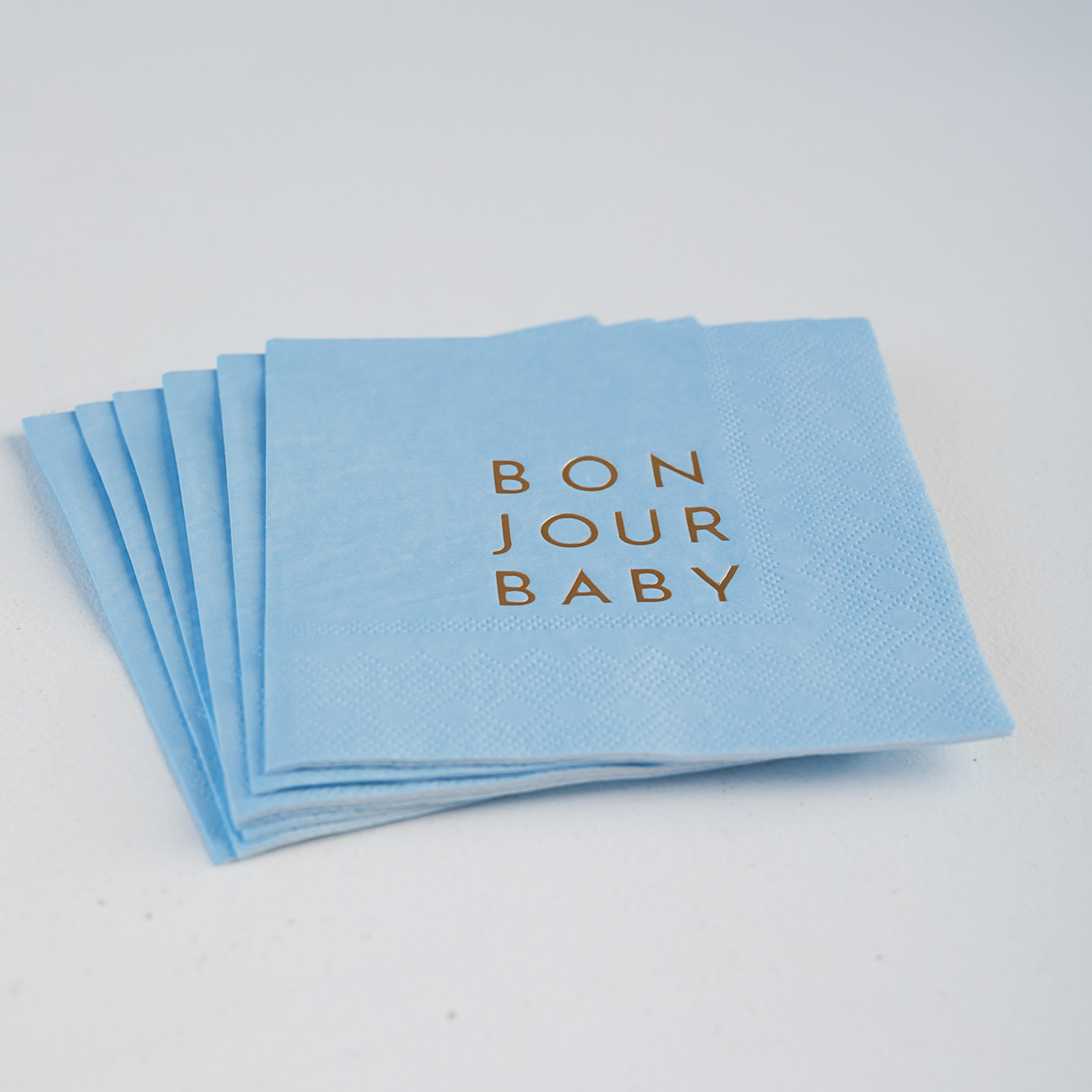Our Bonjour Baby Sky Blue Cocktail Napkins are the perfect accent to your baby shower party table. Adorned with sleek gold foil lettering, these modern French-inspired party supplies add a touch of sophistication to any baby shower celebration. Welcome, baby boy!