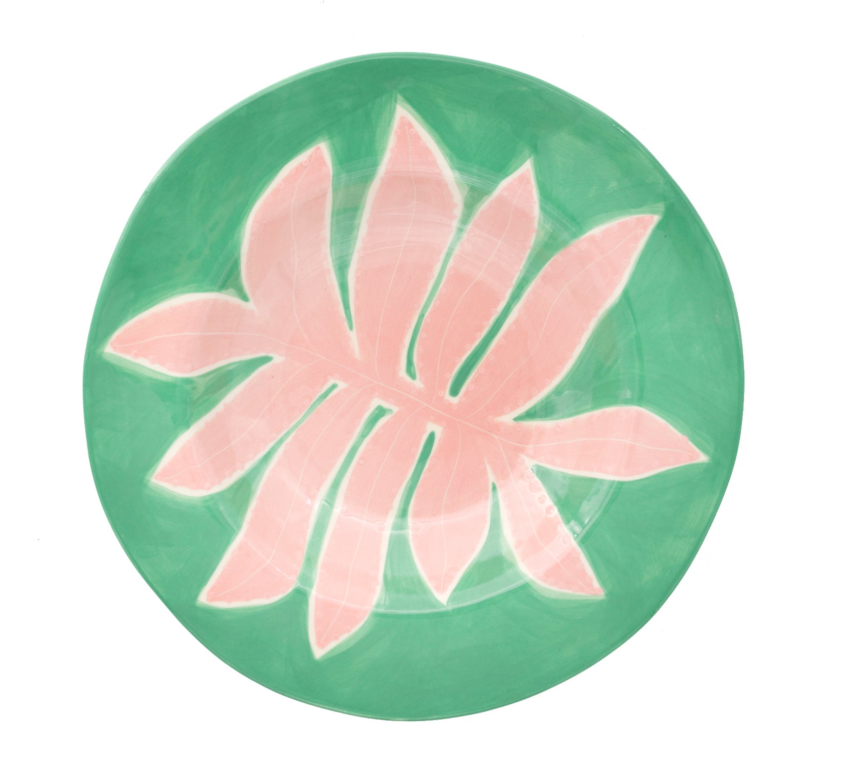 Handcrafted glazed stoneware plate in green. Hand-painted graphic in pink at face.