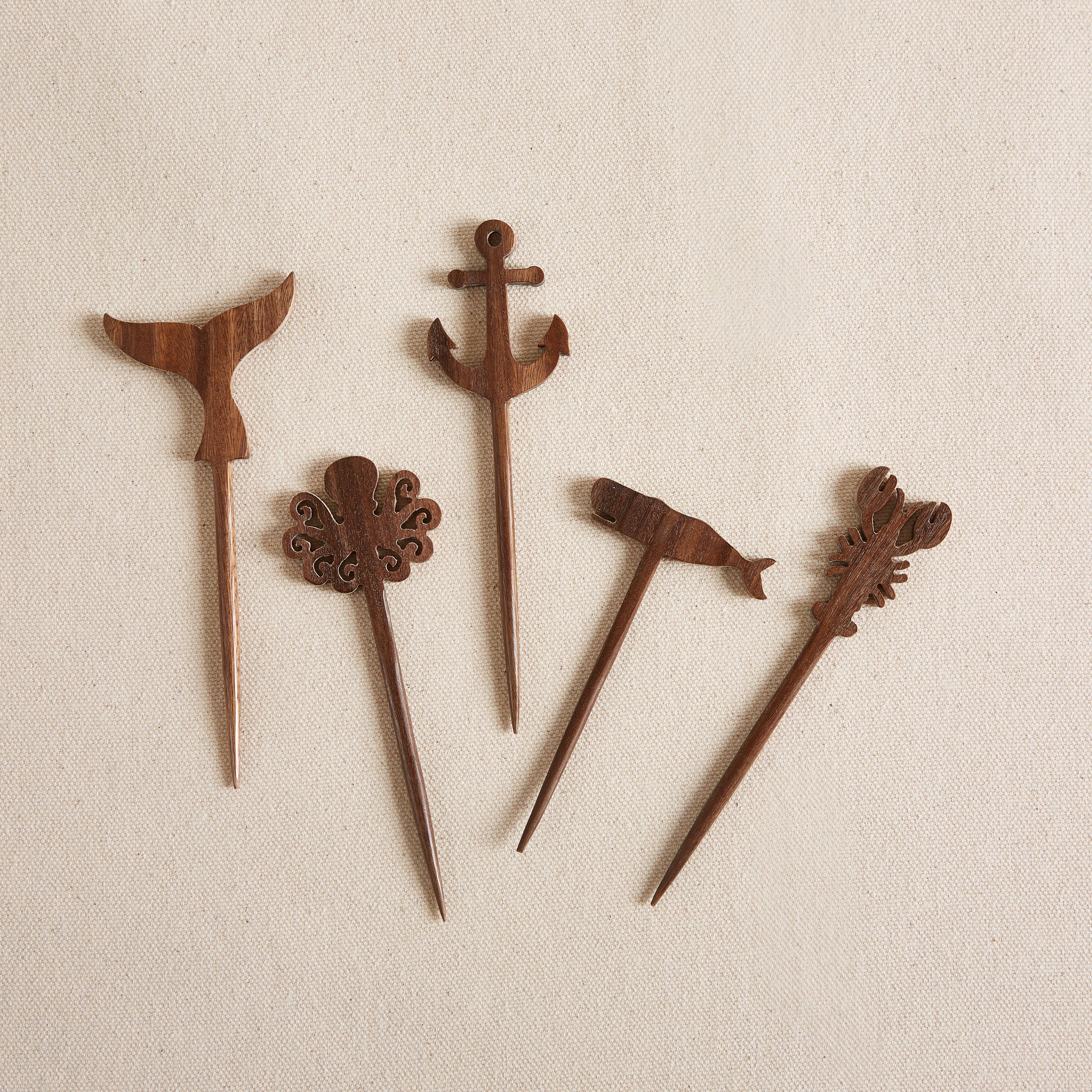 Our hand carved cocktail picks will lend a fun and elegant air to any drink or hors d'oeuvre. Rendered in wood, each has been hand carved by a small artisanal workshop. Made from a sustainable wood source.