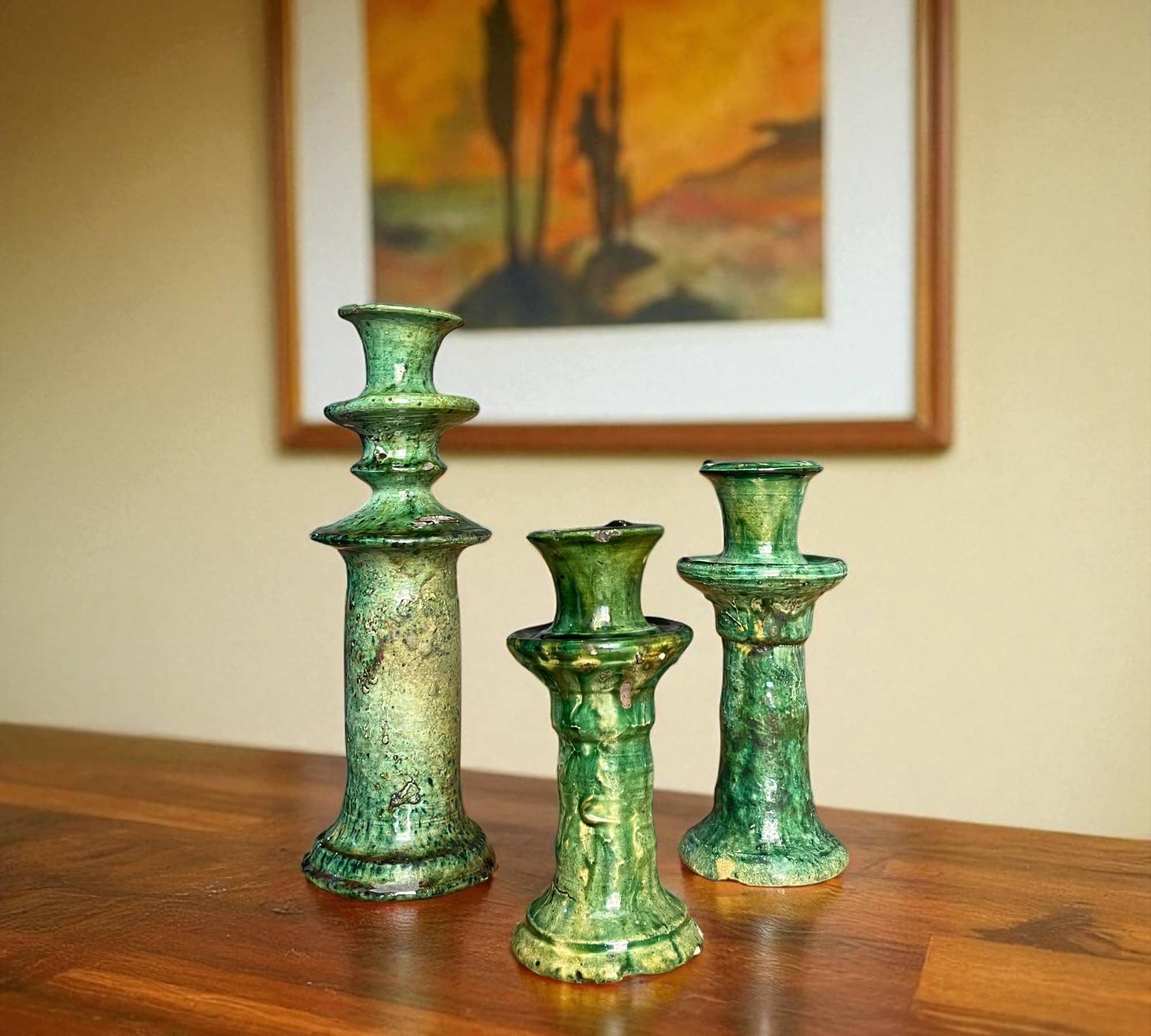 These handmade candleholders comes from Tamegroute, a village in southern Morocco known for its deep green glaze and raw, earthy ceramics. Shaped by skilled artisans and fired in traditional wood-burning kilns, these candleholders vary slightly in color and texture — some with soft lines, others with smooth or mottled finishes. No molds, no machines. Just clay, fire, and the hands of the maker. Every piece carries its own journey in the kiln. What you see is not mass-produced. It's tradition made visible. 📏 Approximate Dimensions: (cm) • Small: 12 H × 7 W • Medium: 20 H × 7 W • Large: 30 H × 7 W (inches) • 5 H × 2.75 W • 8 H × 2.75 W • 12 H × 2.75 W ⚠️ Please note: Tamegroute pottery is famous for its rustic charm, featuring minor imperfections such as baking marks, fine lines, and sometimes small treated chips — all of which add character to each unique piece. If you are looking for a perfect, machine-made pottery item, this pottery type is not for you!