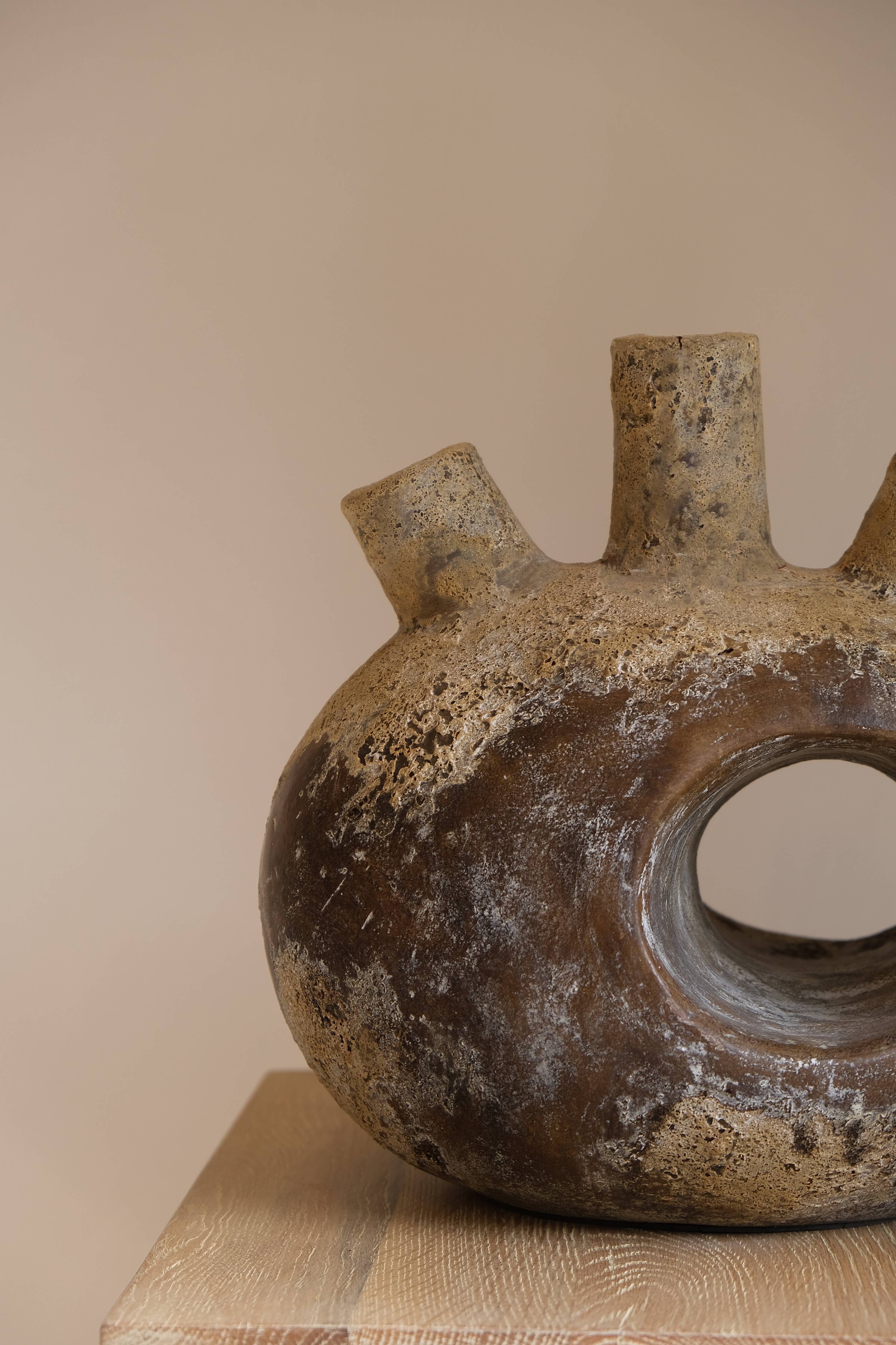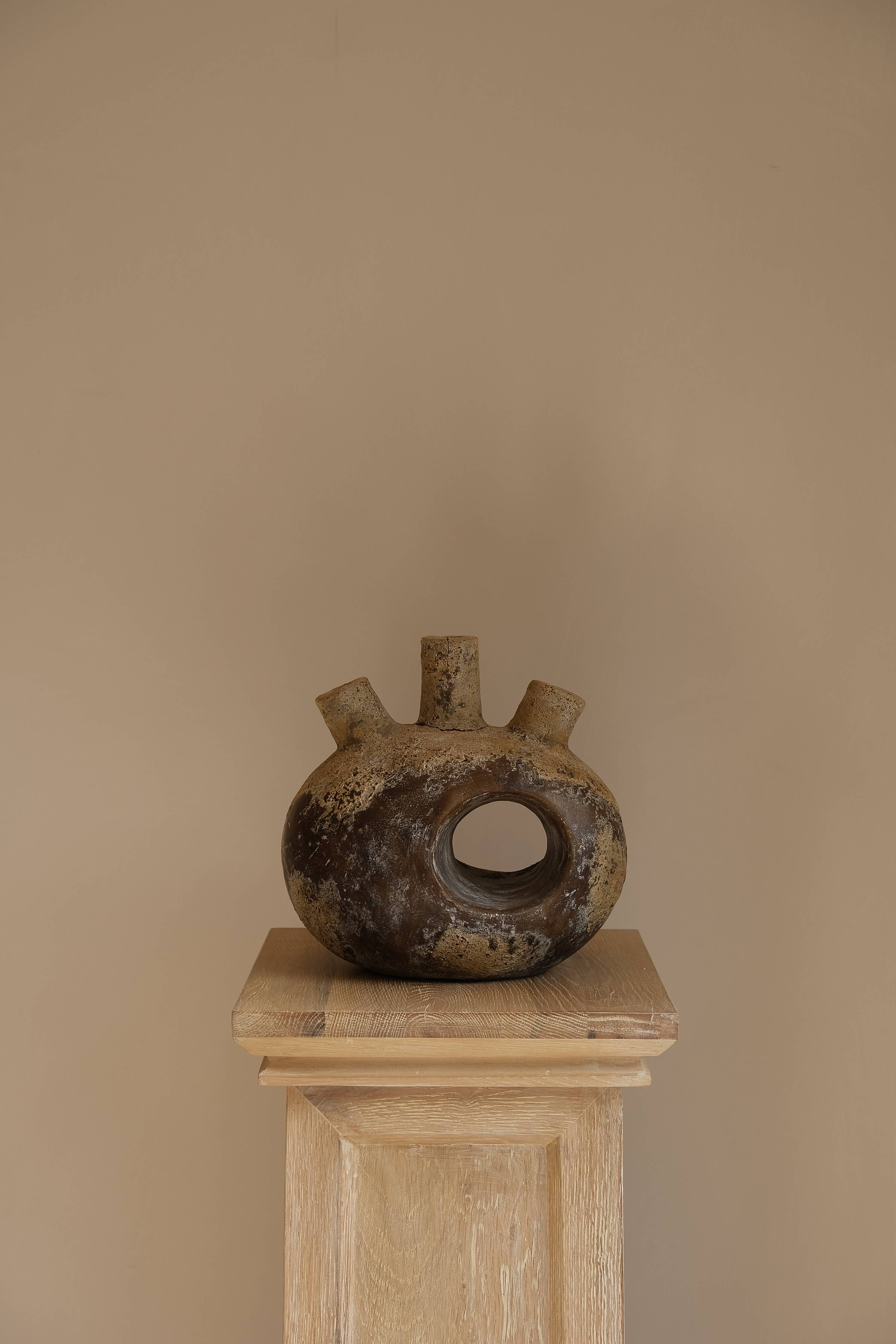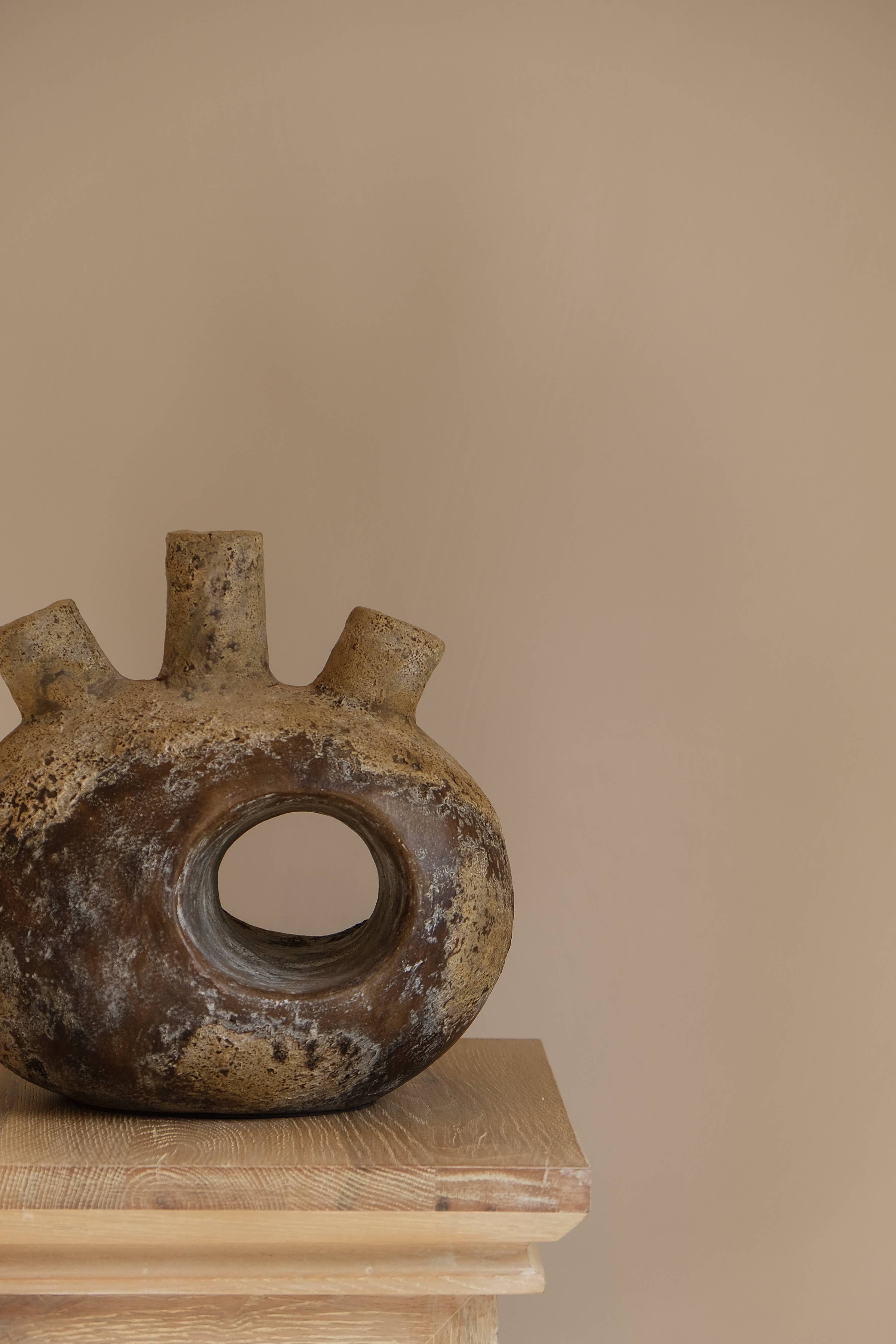 The Jantu vessel is a one-of-its-kind terracotta sculpture handmade by local Indonesian artisans.Its name comes from the word "jantung" which means "heart" in Indonesian, as this particular vessel resembles the cardiovascular organ. It showcases a natural organic color palette and a vintage-inspired finish that ensures durability and authenticity. The details of this vessel is made possible by sculpting techniques that have been passed down through generations. An extremely unique piece, this vessel is characterized by a spherical base with an opening in the middle and three cylindrical tubes at the top which can be used as a distinctive pen holder, an iconic flower vase, or on its own as a standalone showstopping decorative piece.
