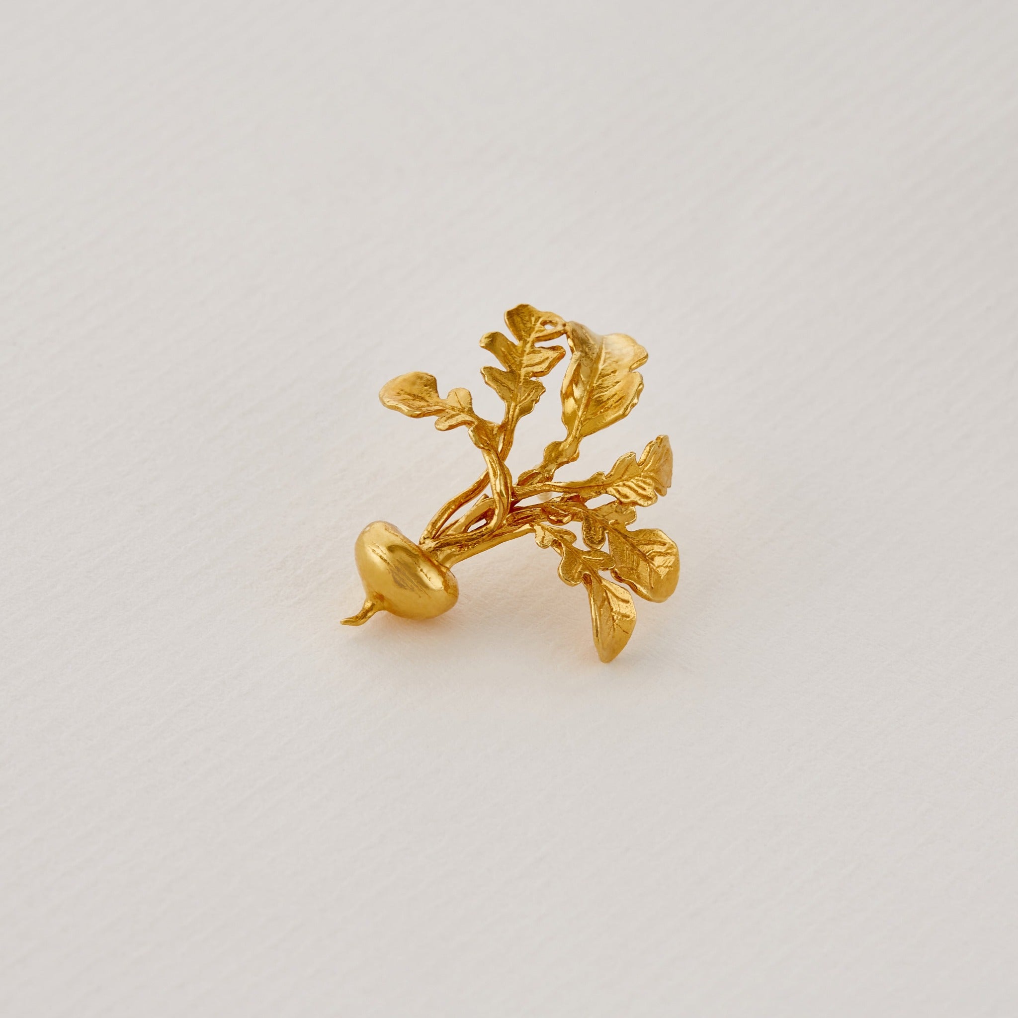 Homegrown organic shapes highlight the perfectly imperfect details in this charming turnip brooch, freshly harvested from the allotment. Create an individual look by styling this quirky turnip pin brooch on a coat, jacket, jumper, scarf or hat! Handmade in England.