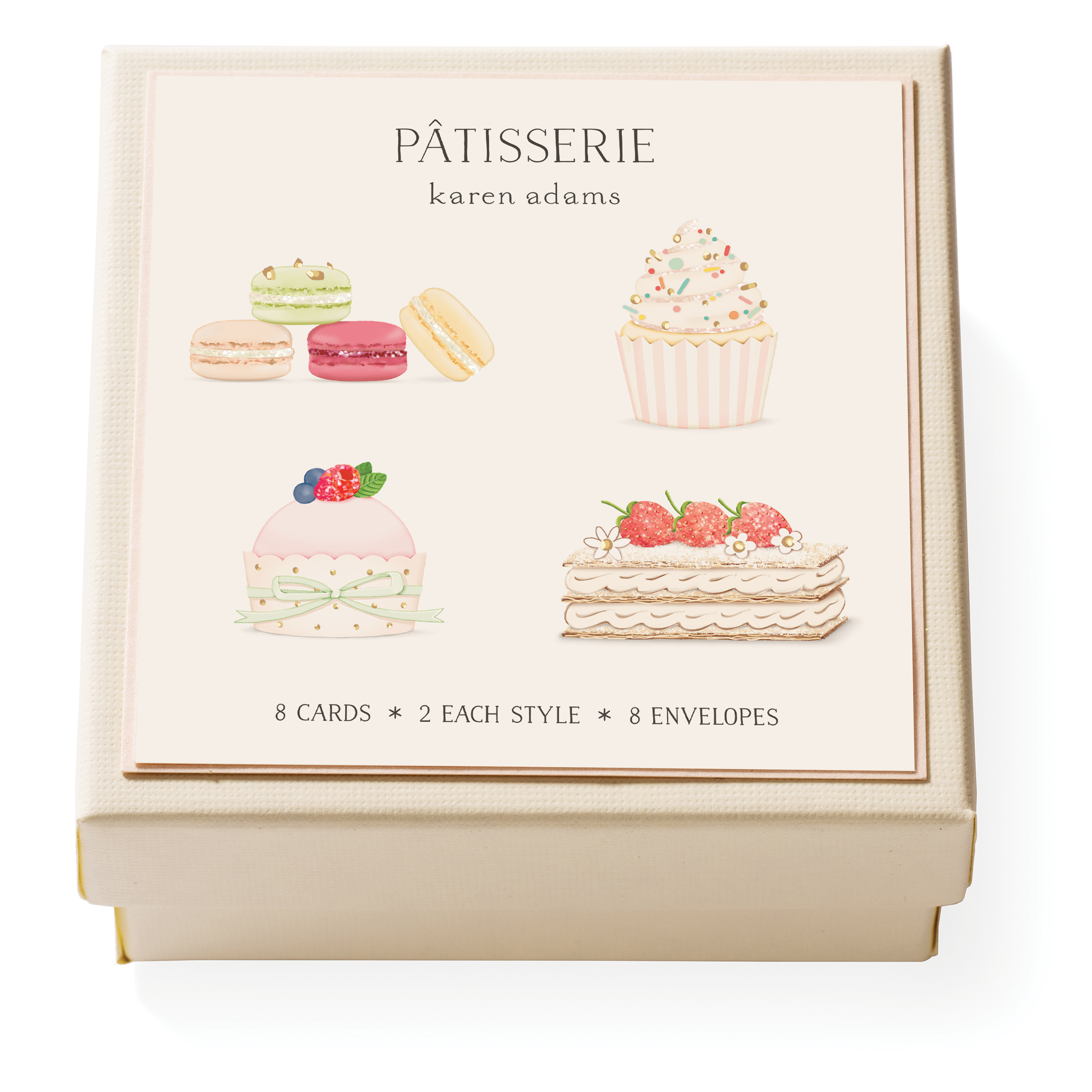 Our Macarons Gift Enclosure is printed and hand-glittered in Memphis, TN. Hand crafted artwork, full color ink printed on natural white paper, hand-glittered, and paired with a vellum envelope. Book-folded enclosure card, blank on the inside.
