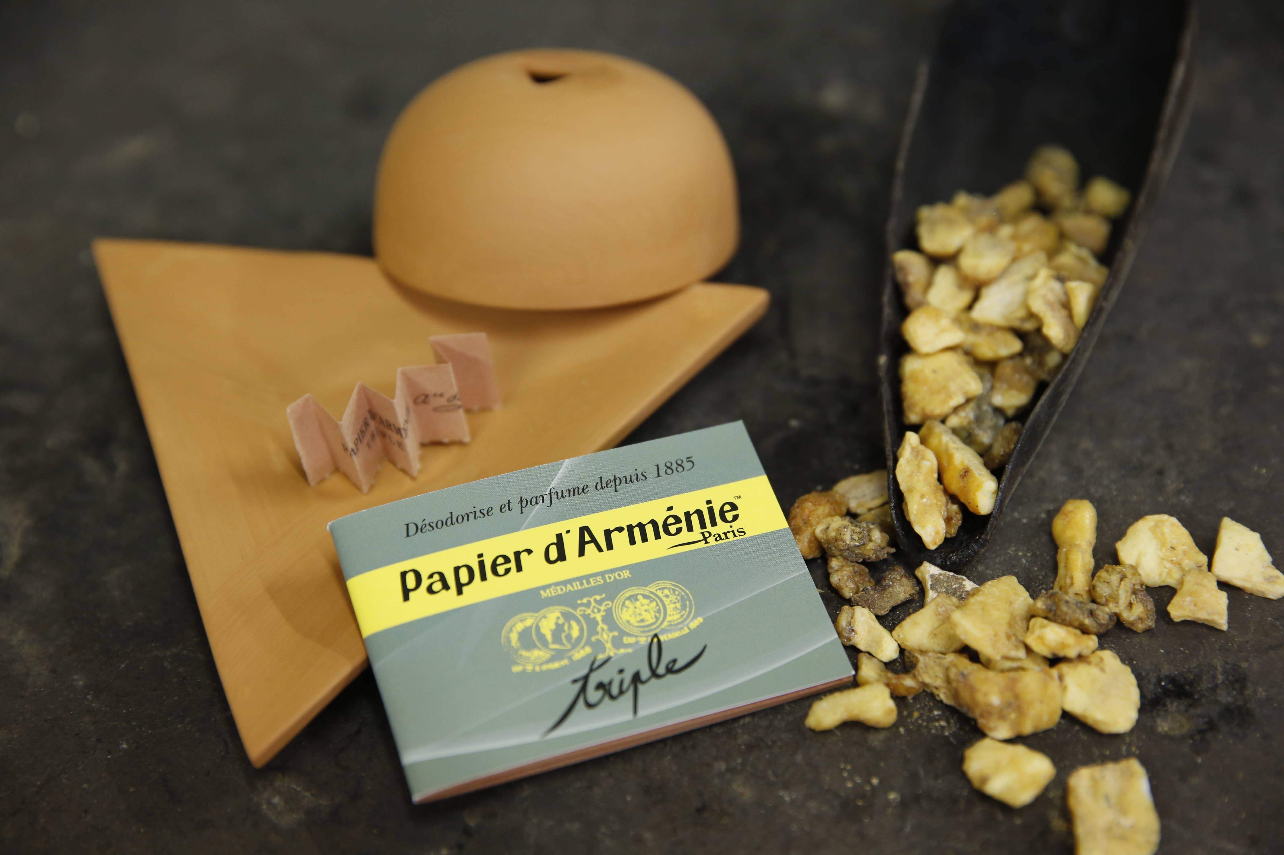Papier d'Arménie incense paper was created more than 120 years ago and is a respected and much-treasured part of Parisian life. These are famous fragranced paper booklets that have been hand soaked in a process that takes more than 6 months. Each booklet contains 36 detachable strips of perfumed paper. To use, tear out a strip, fold it into a fan or concertina pattern, and place it in a burner or other container such as an ashtray. Light one end of the paper and it will begin to smolder, gently emitting an incredible fragrance that is based on a traditional recipe of resins, including benzoin. The smoke clears the space, it acts as a beautiful deodorizer and uplifts the mood. These strips have been a secret to maintaining an amazing atmosphere in French homes for more than a century.