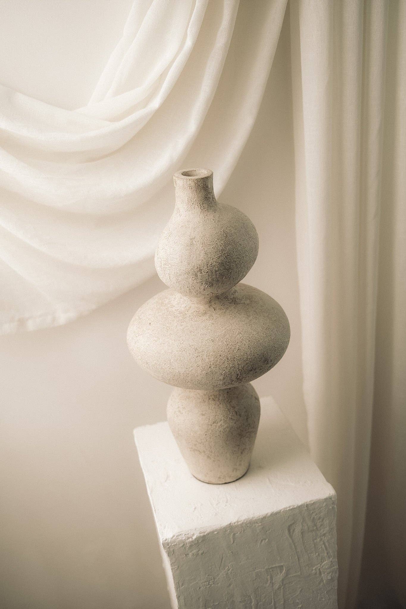 The Sewu vessel is a mesmerizing terracotta sculpture handmade by local Indonesian artisans. A more abstract take on sculptural shapes, this piece takes inspiration from the crown of the Sewu temple featuring curvaceous layers that taper along the middle and at the top. Its striking shape color and textured vintage finish adds to its unique features. Use it as an eye-catching decorative vase for florals or as a standalone decorative piece that adds vivid contrast to both traditional and contemporary spaces.
