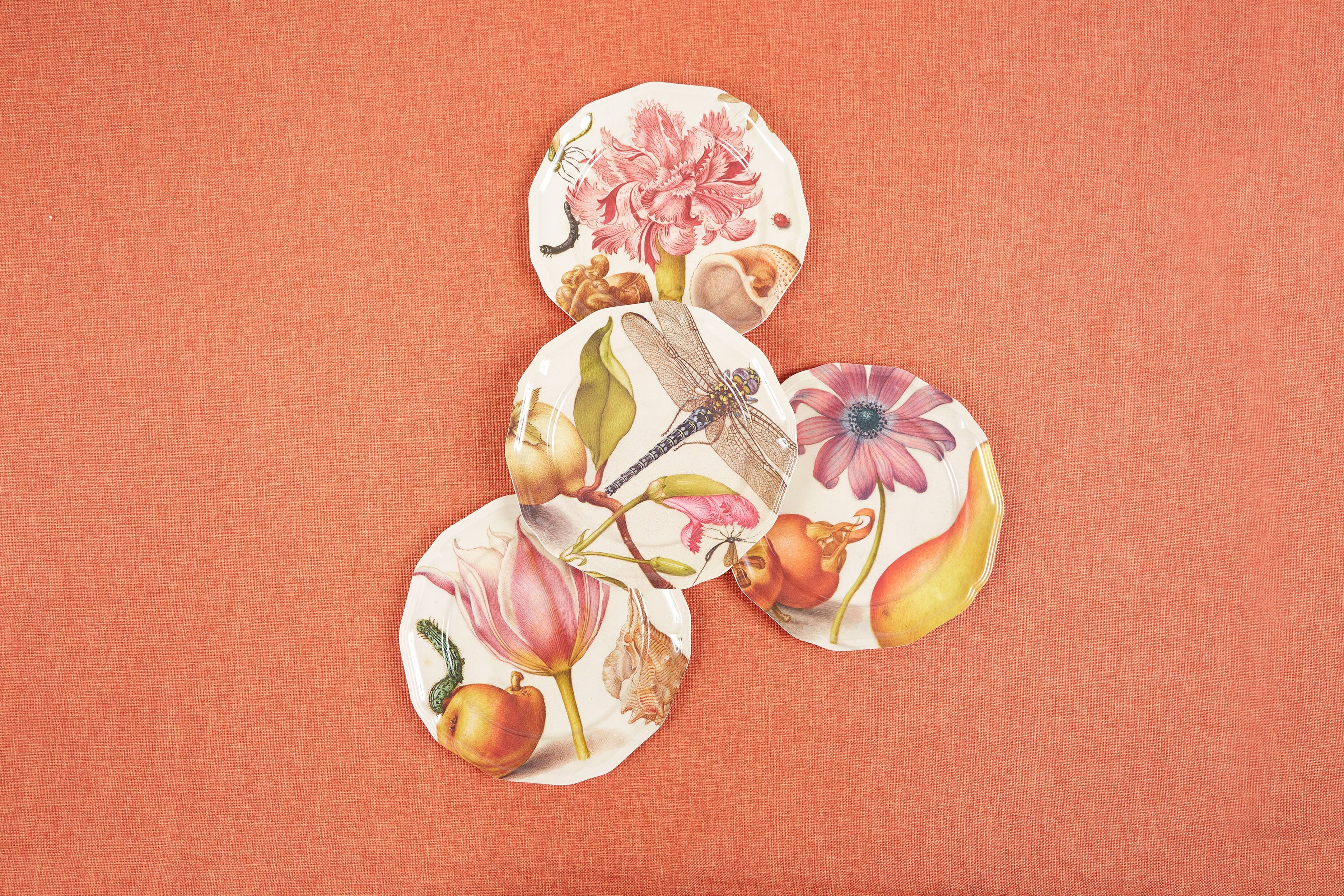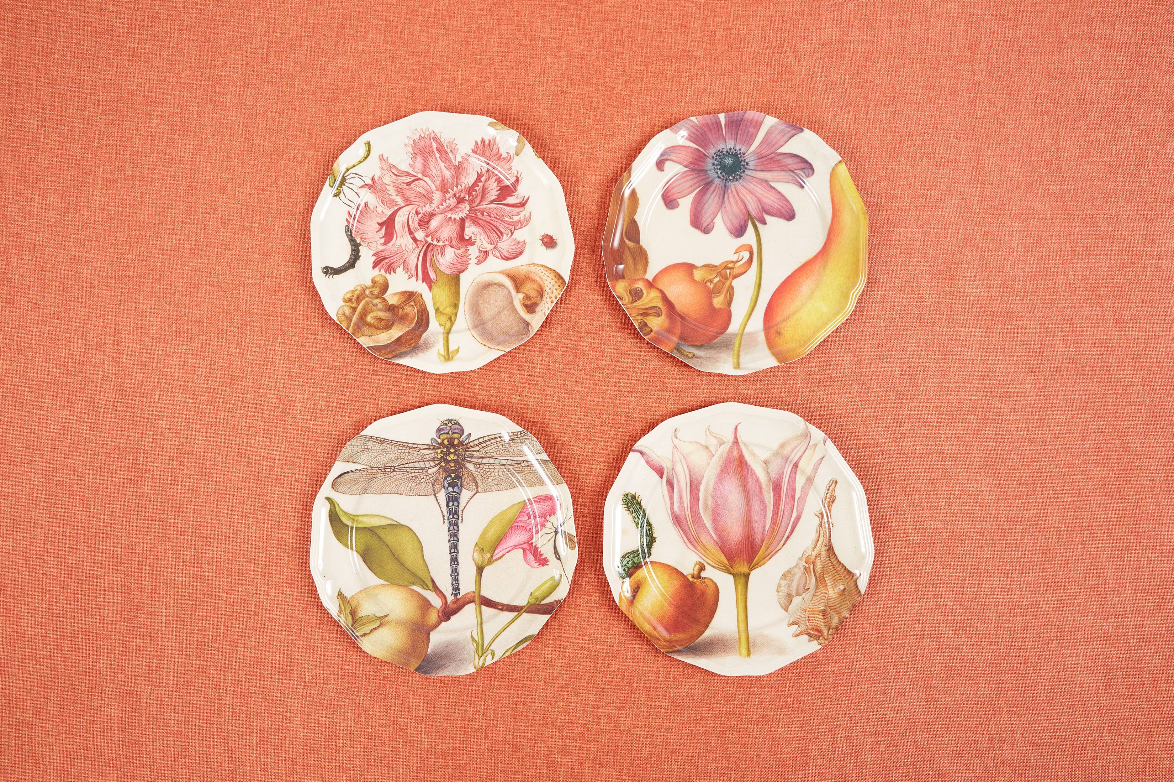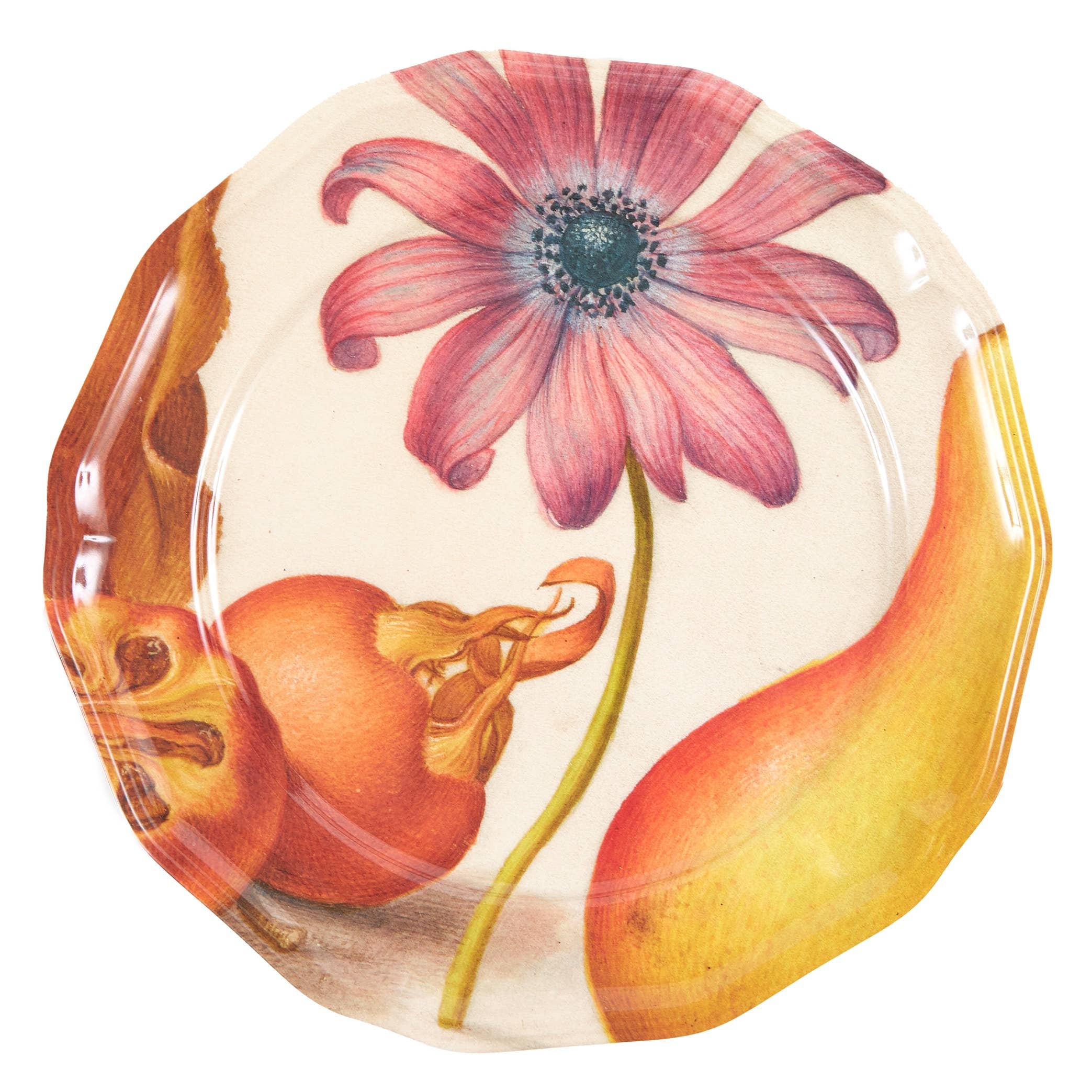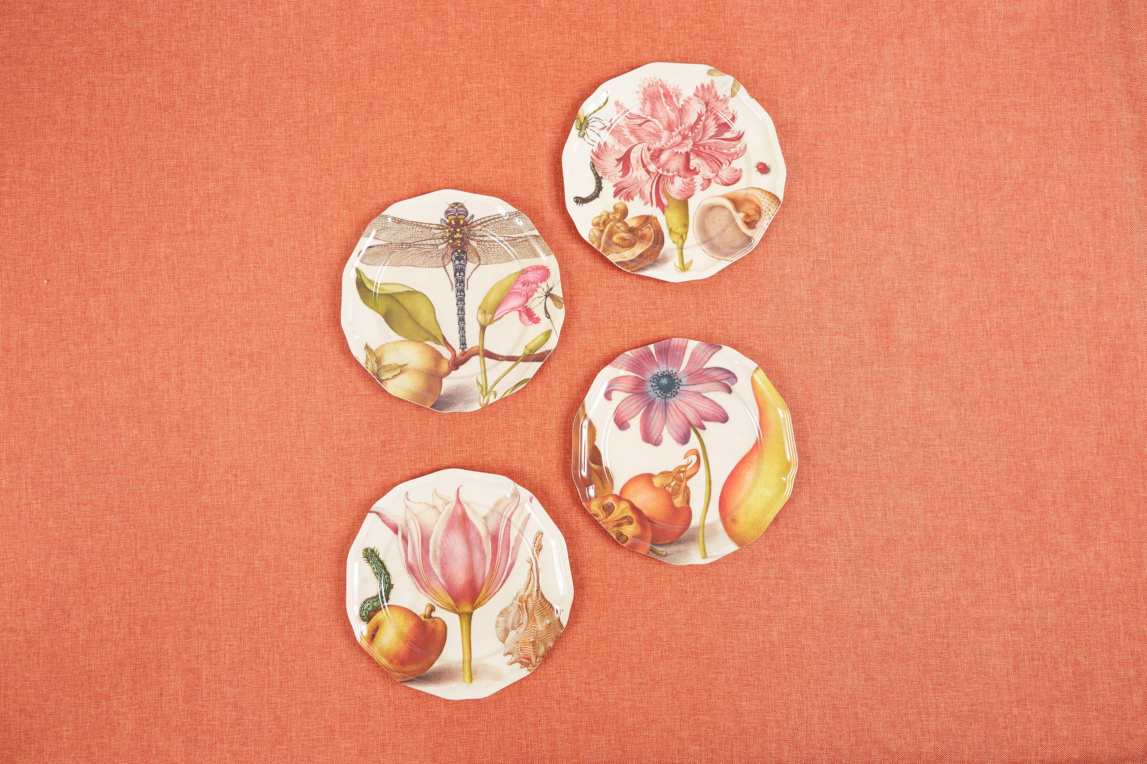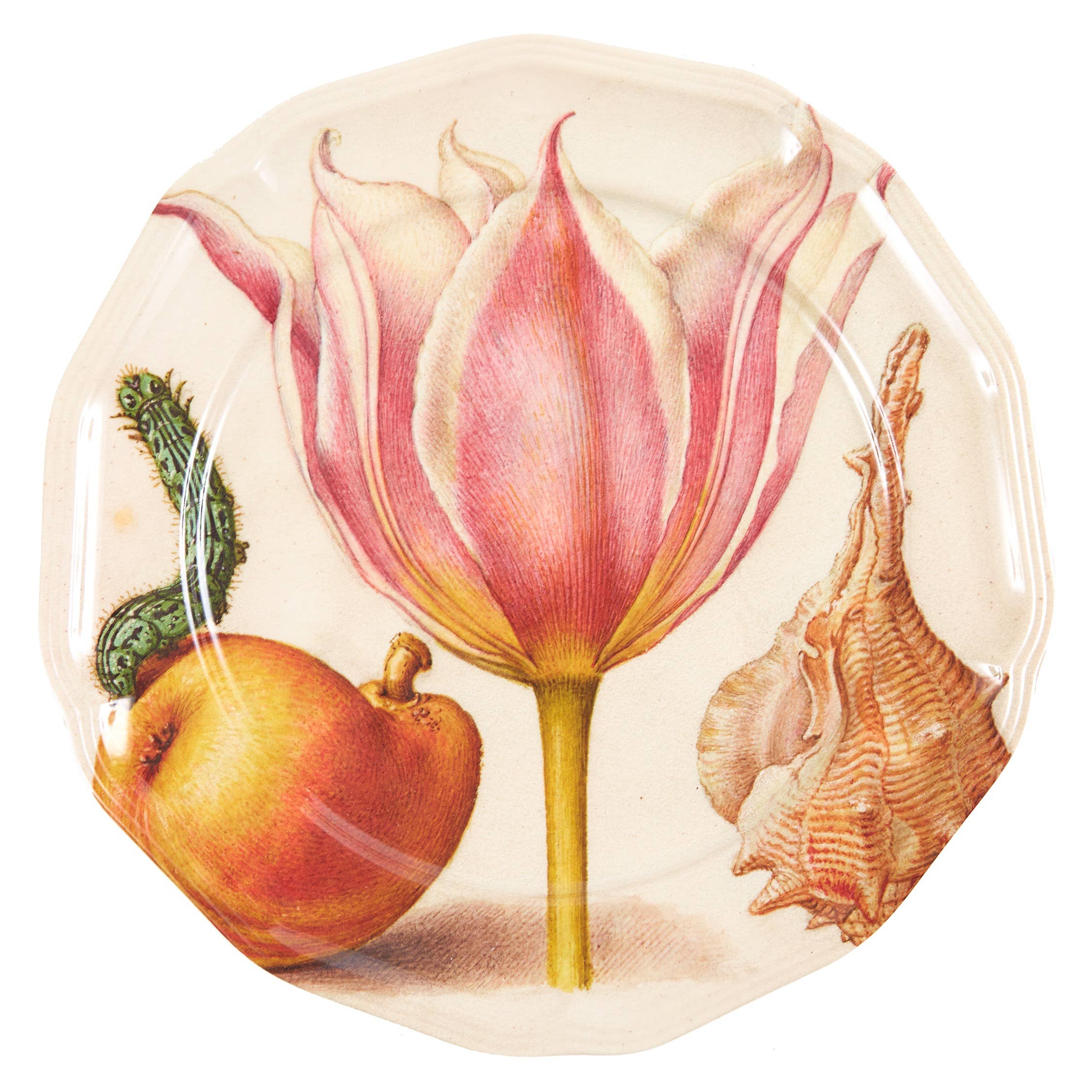 Our Botaniste melamine collection features antique natural history engravings and watercolors with a bit of an eccentric edge. In addition to pretty fruits and flowers, you may find a sea shell, a crayfish, or even a little mouse lurking within the image! Bring the beauty of the garden to your table. BPA Free Melamine Dishwasher Safe Do Not Microwave Indoor/Outdoor Use Each Plate measures 9" Salad/Dessert size
