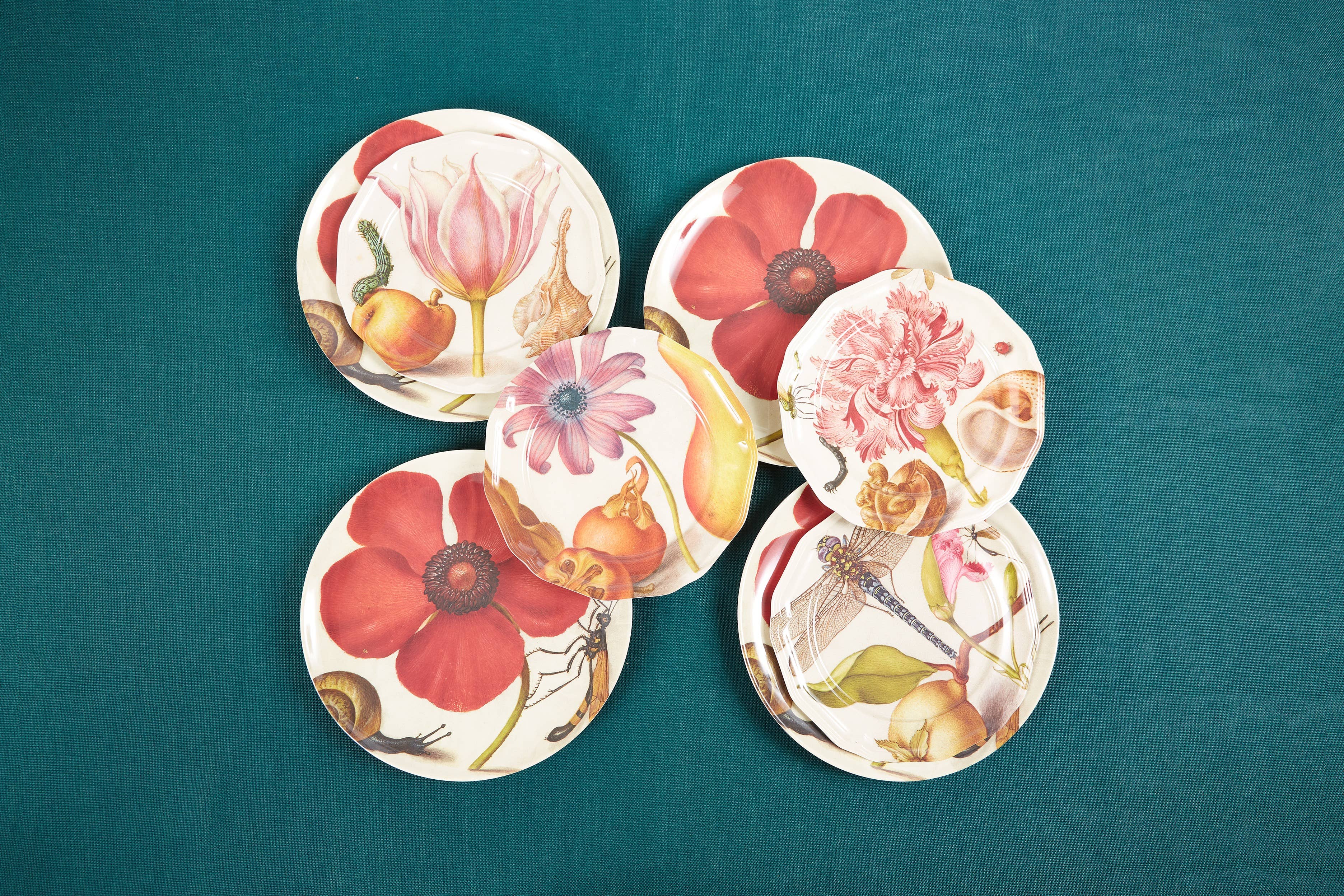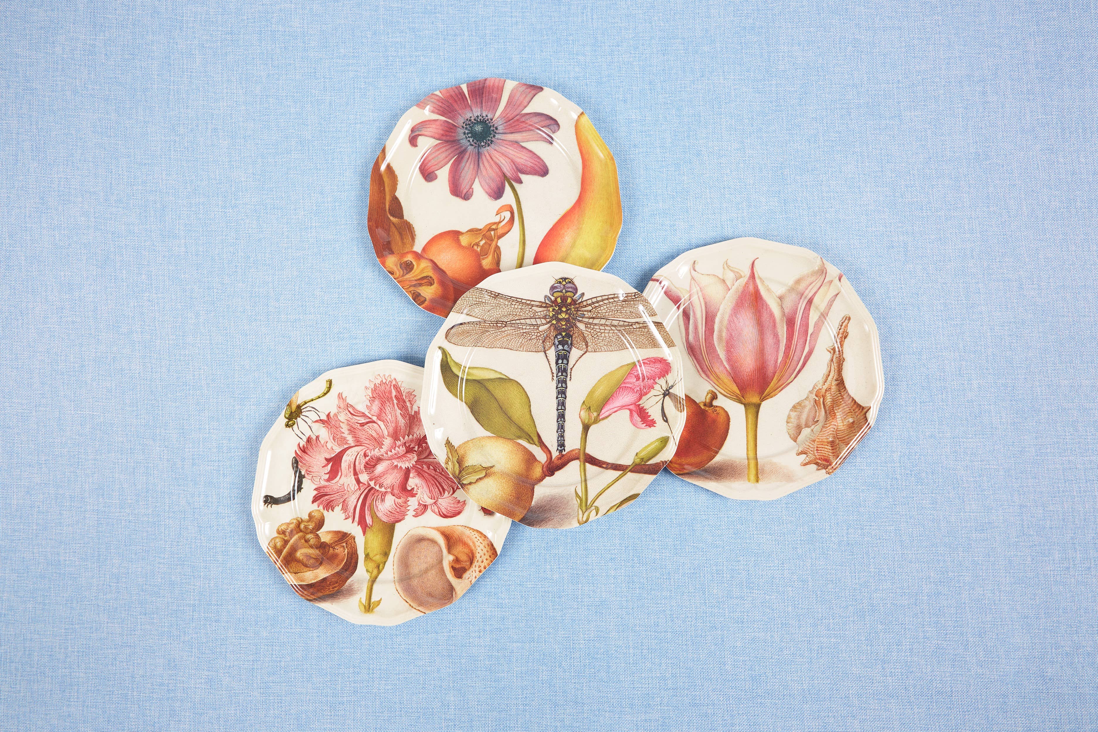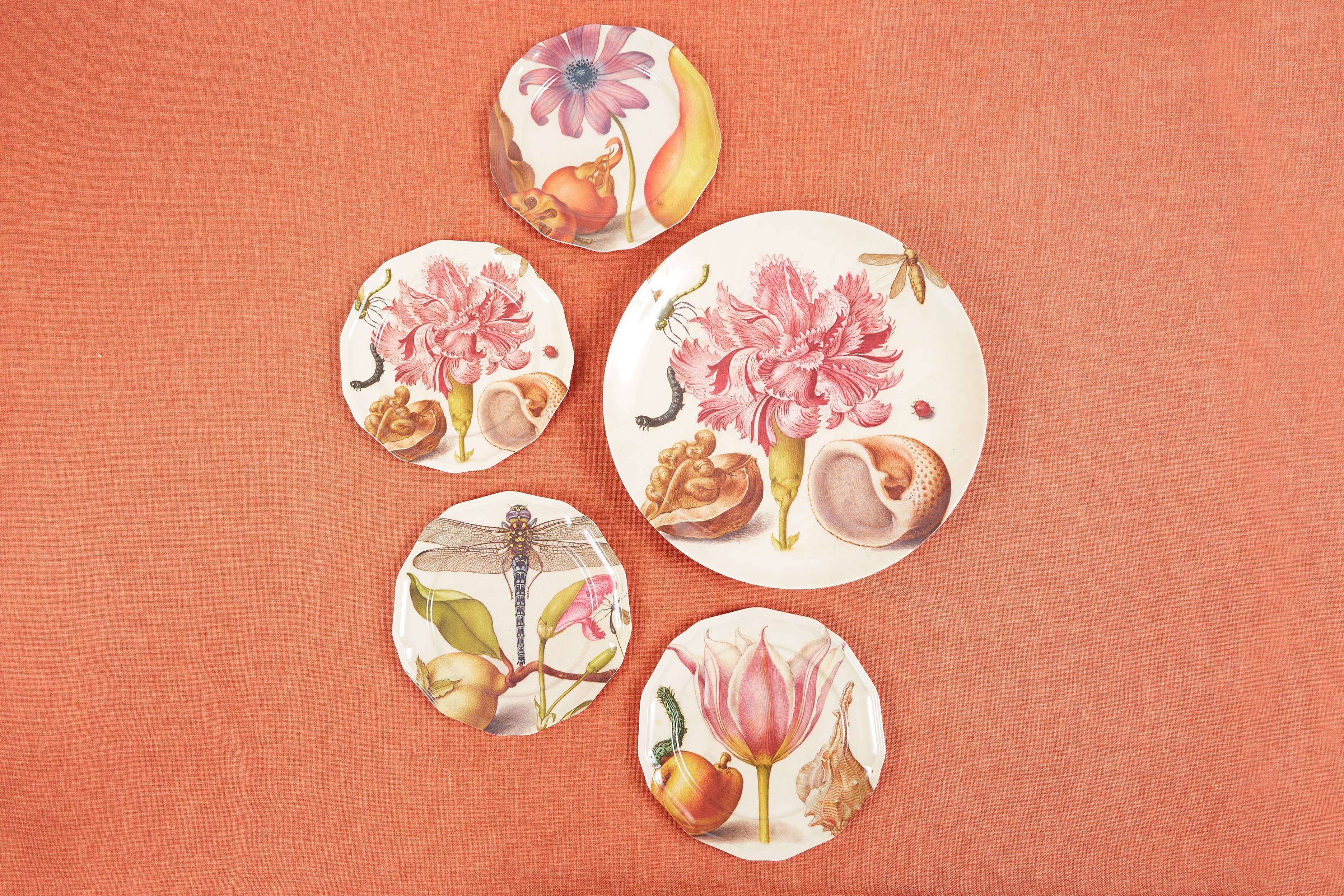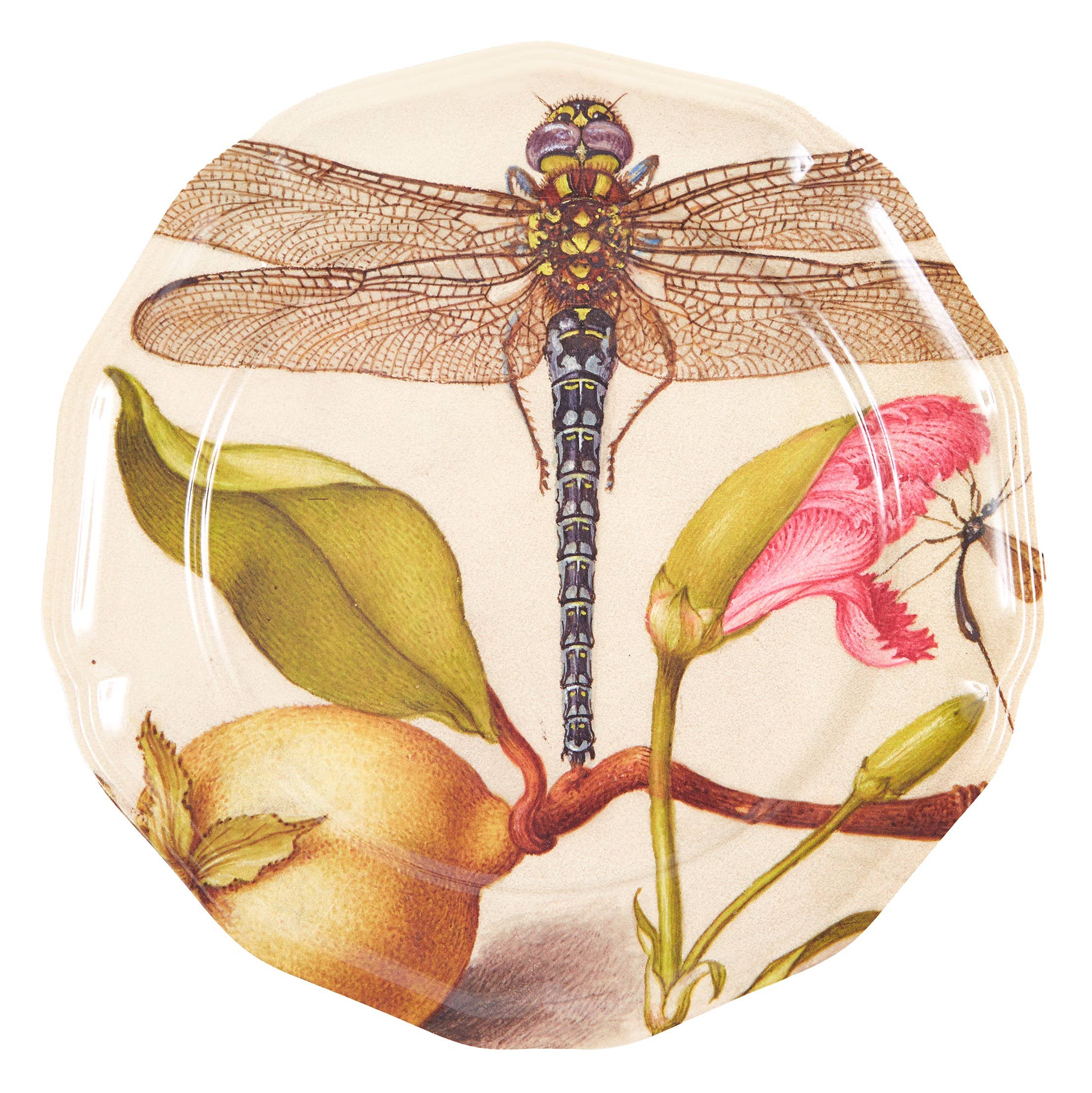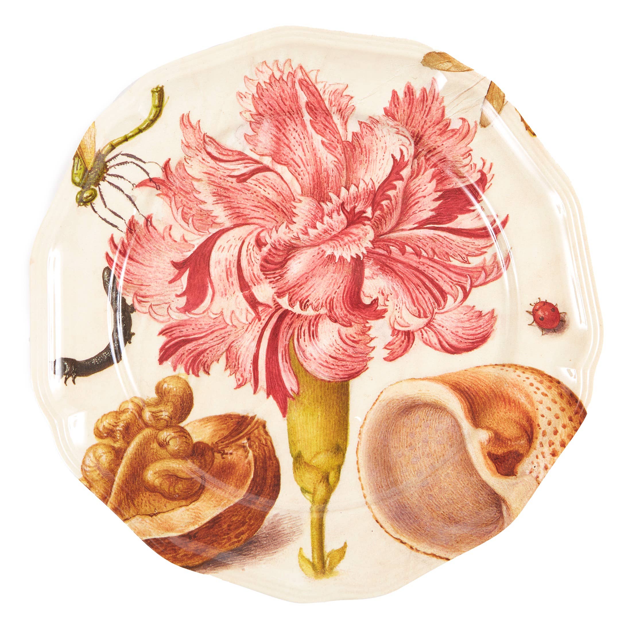Our Botaniste melamine collection features antique natural history engravings and watercolors with a bit of an eccentric edge. In addition to pretty fruits and flowers, you may find a sea shell, a crayfish, or even a little mouse lurking within the image! Bring the beauty of the garden to your table. BPA Free Melamine Dishwasher Safe Do Not Microwave Indoor/Outdoor Use Each Plate measures 9" Salad/Dessert size