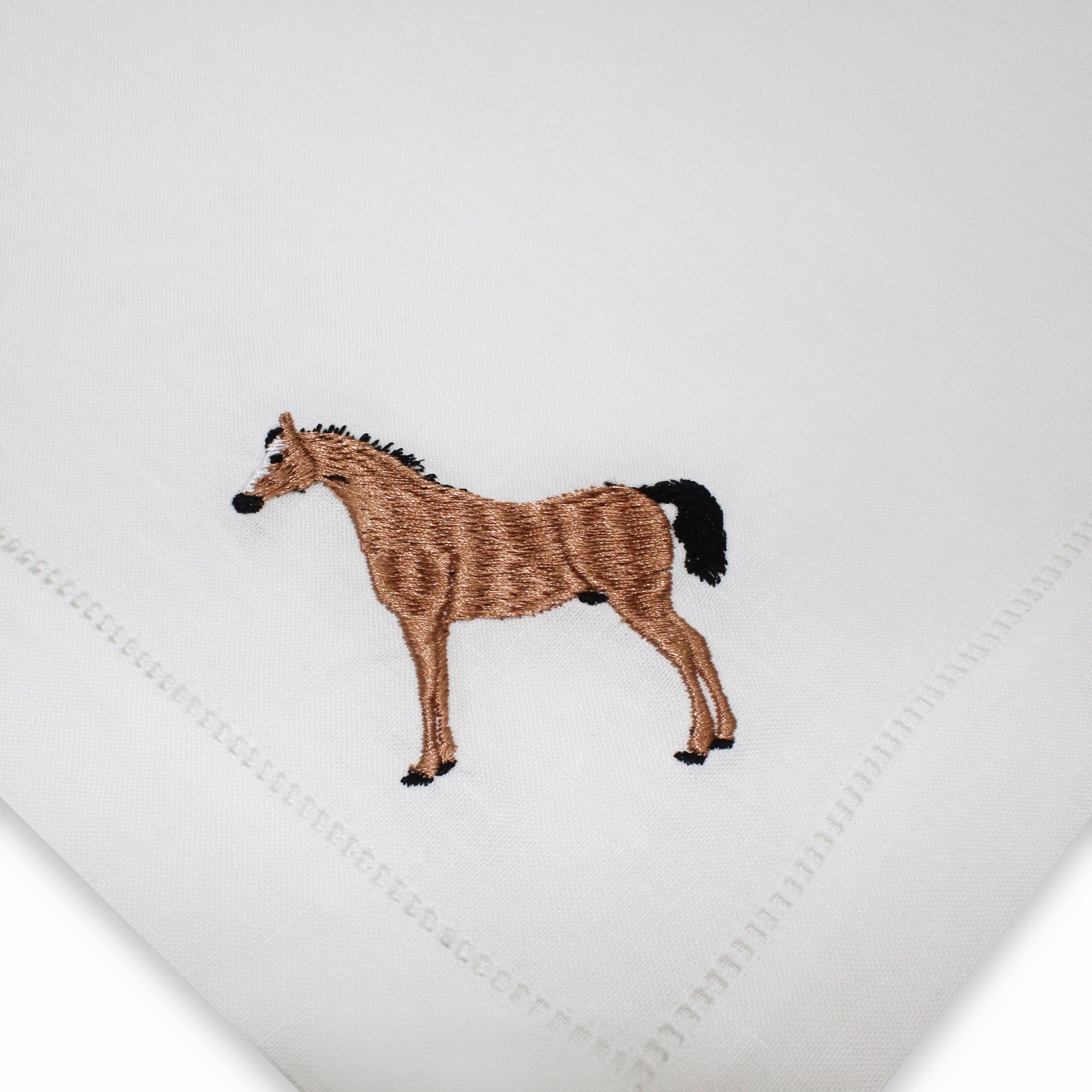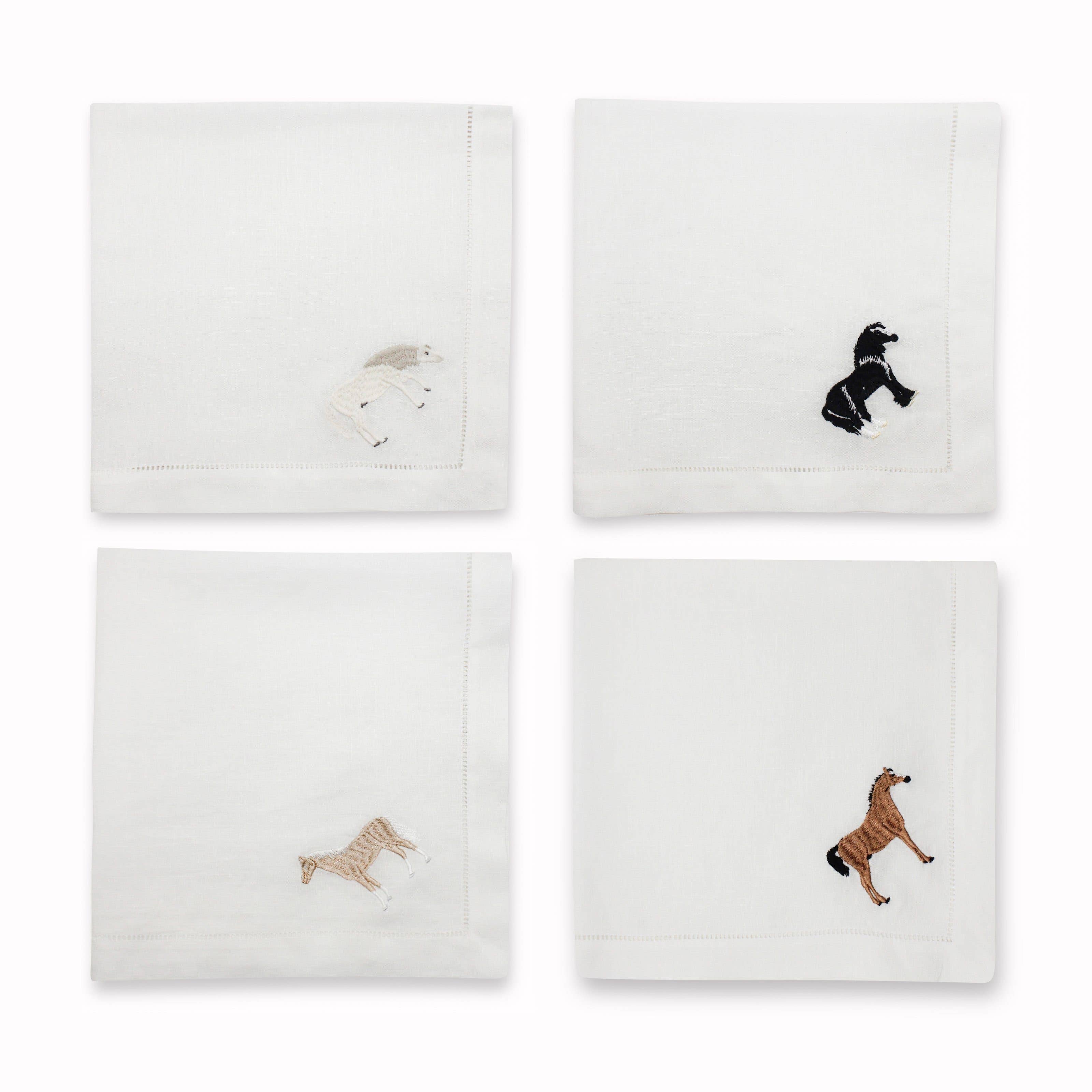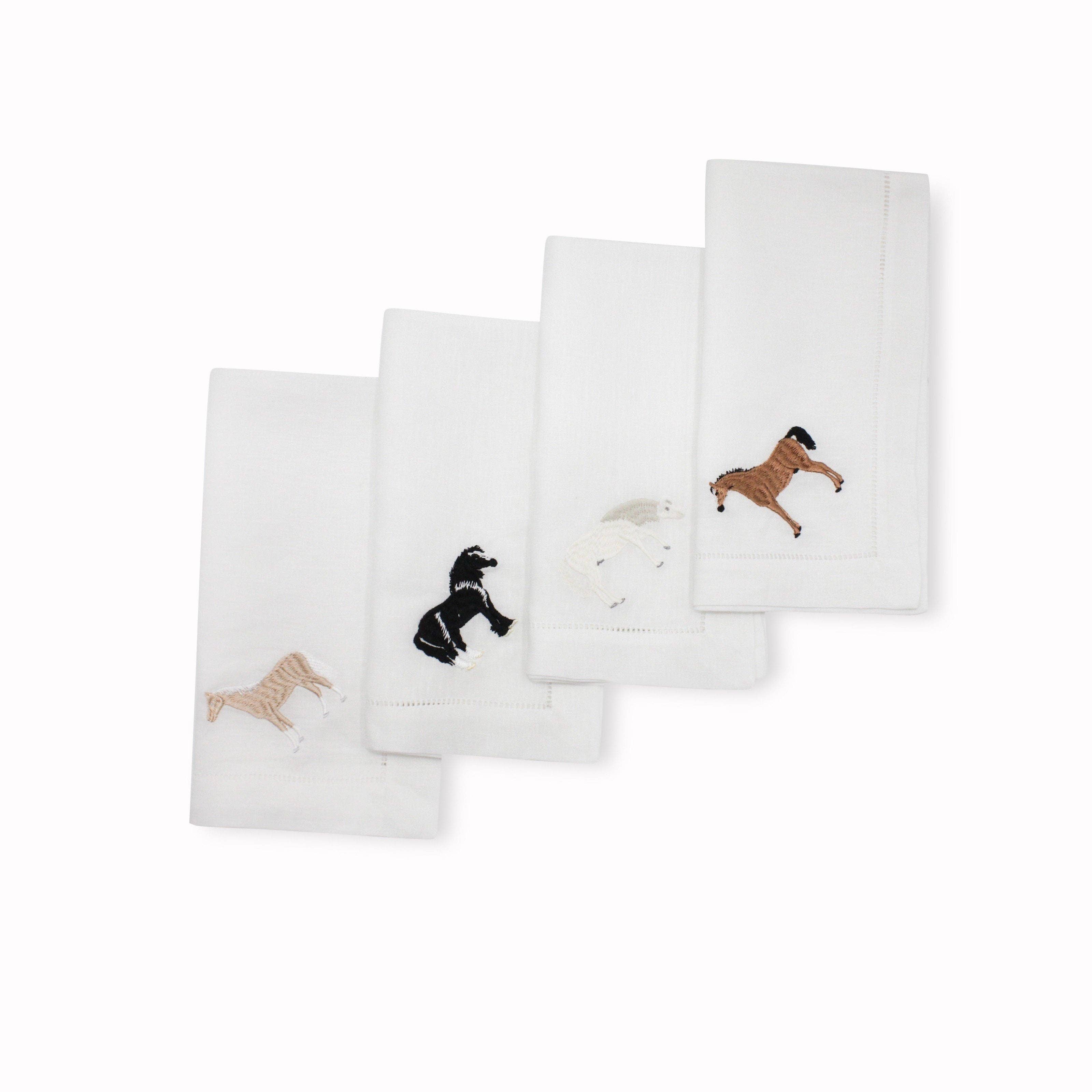 A perfect napkin set for a horse lover! On each white linen napkin, is a different kind of horse: Arabian, Palomino, Thoroughbred, and British Shire.