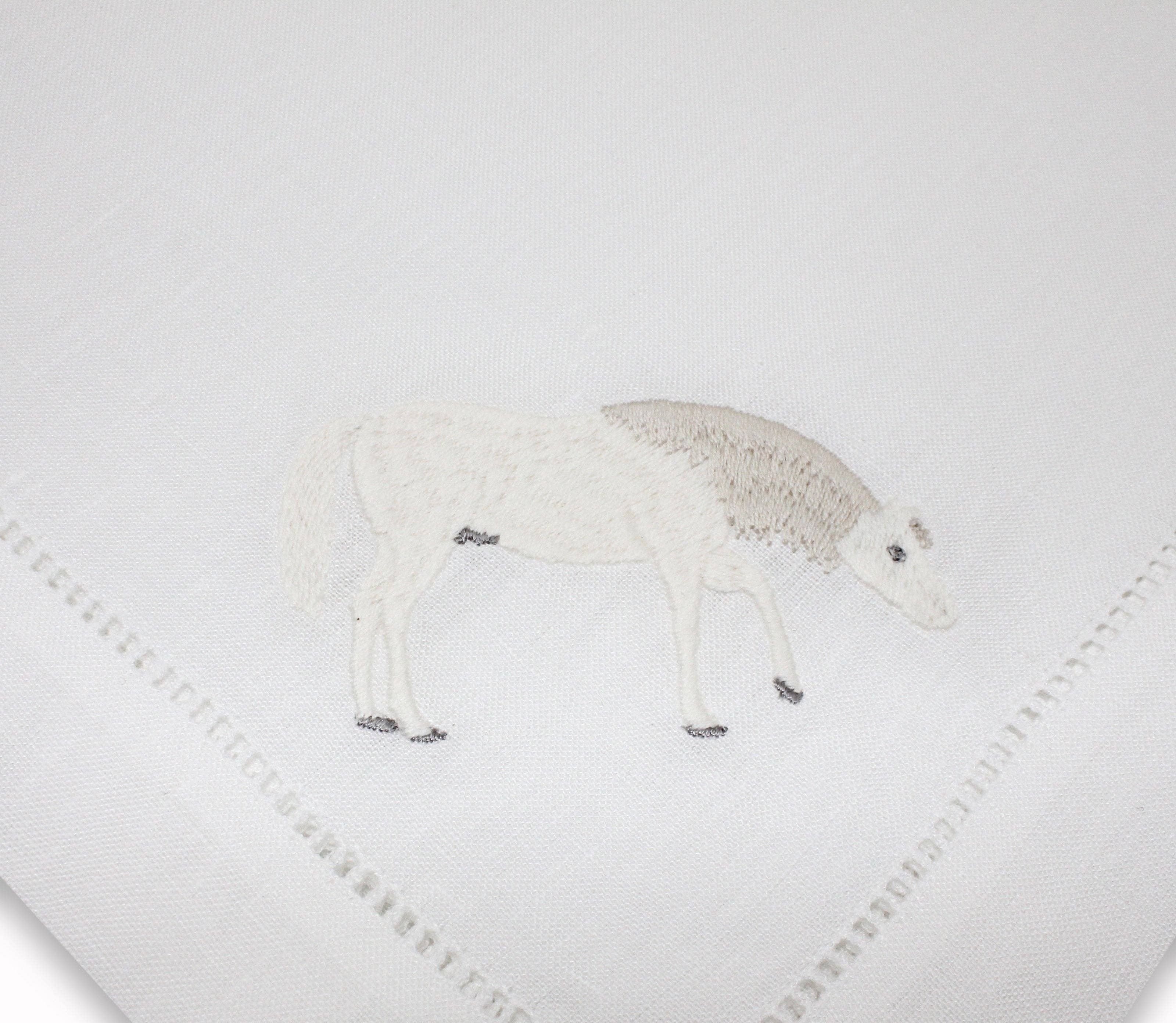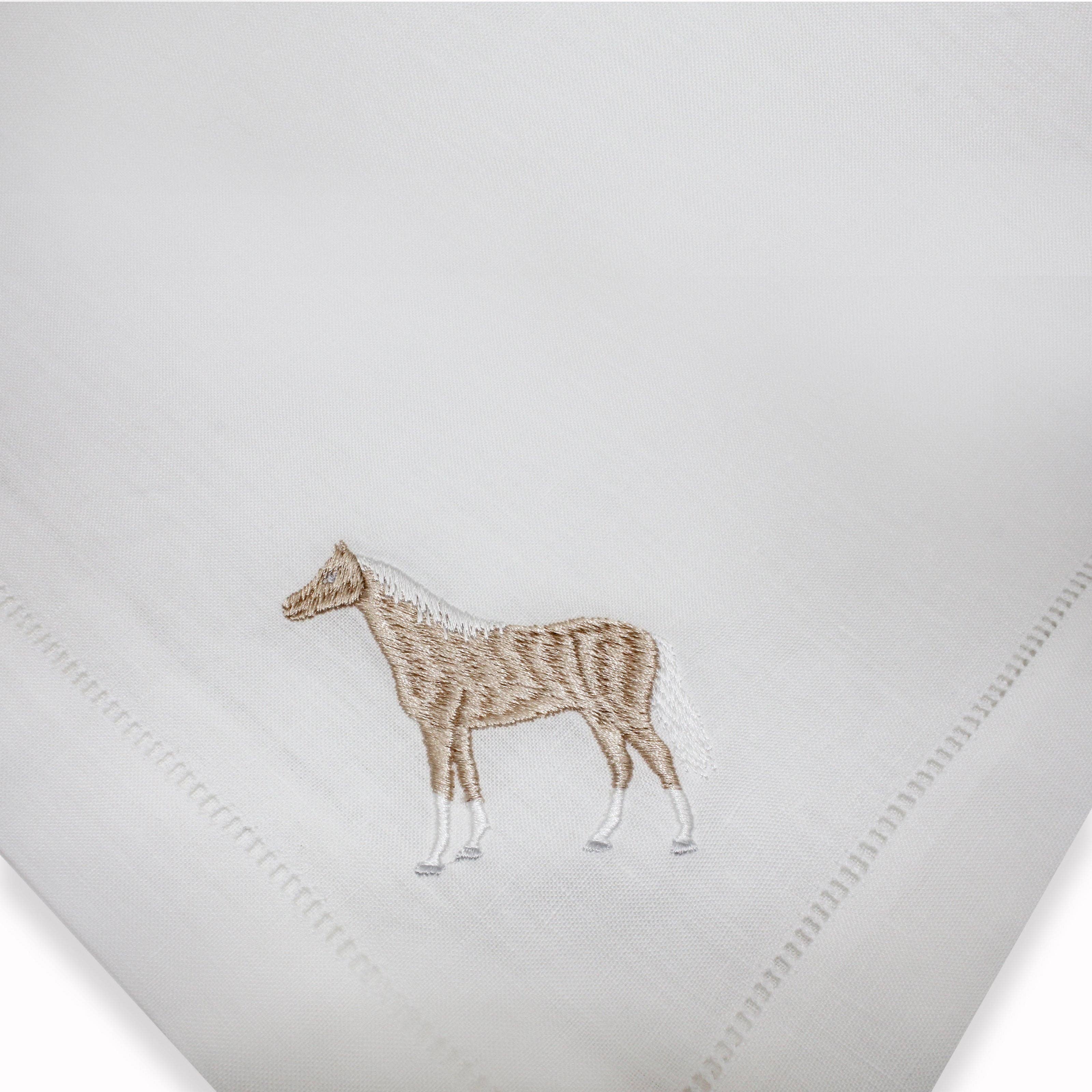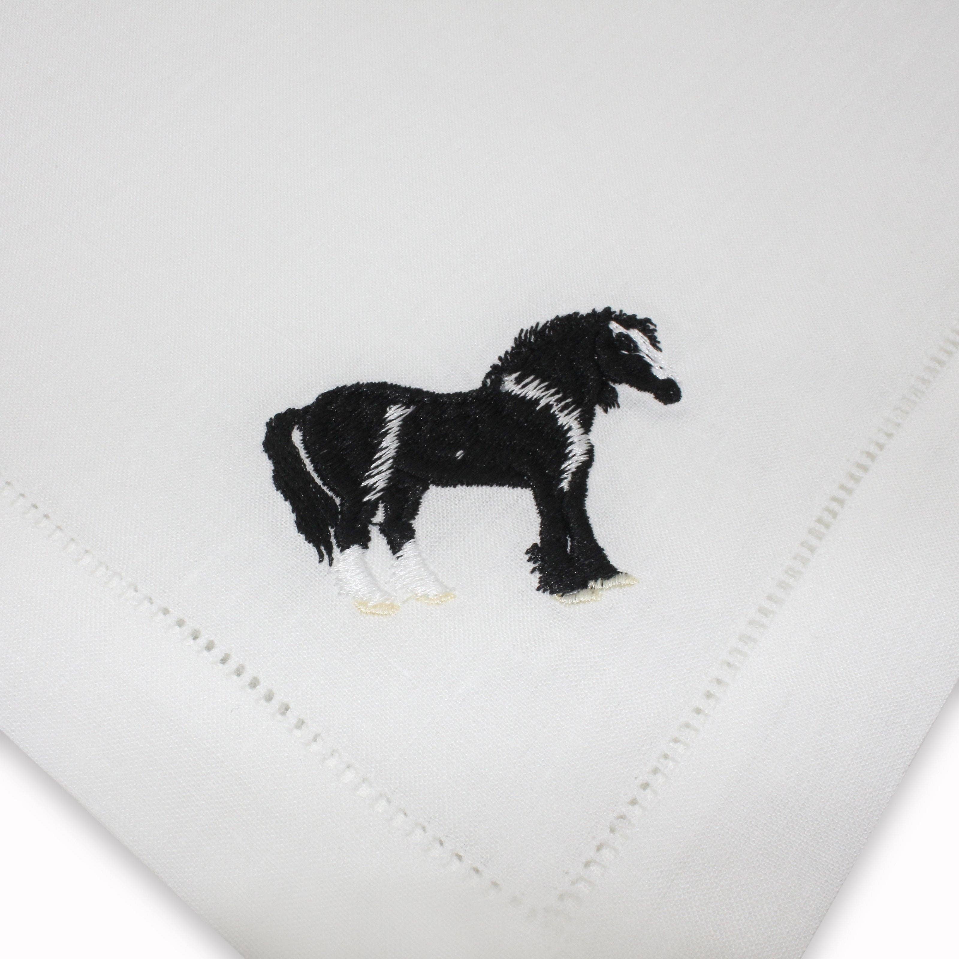 A perfect napkin set for a horse lover! On each white linen napkin, is a different kind of horse: Arabian, Palomino, Thoroughbred, and British Shire.