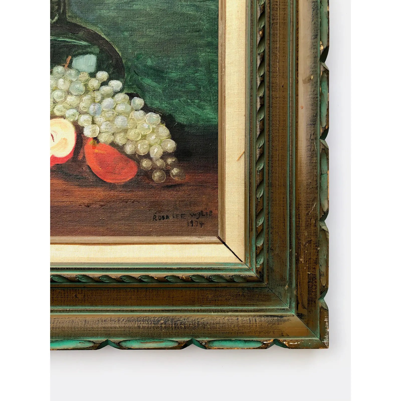 This vintage 1970's oil on canvas panel still life painting is in good condition as pictured with some wear to the frame. Outer frame measures about 24.5x28.5 inches. Artwork measures about 16x20 inches.