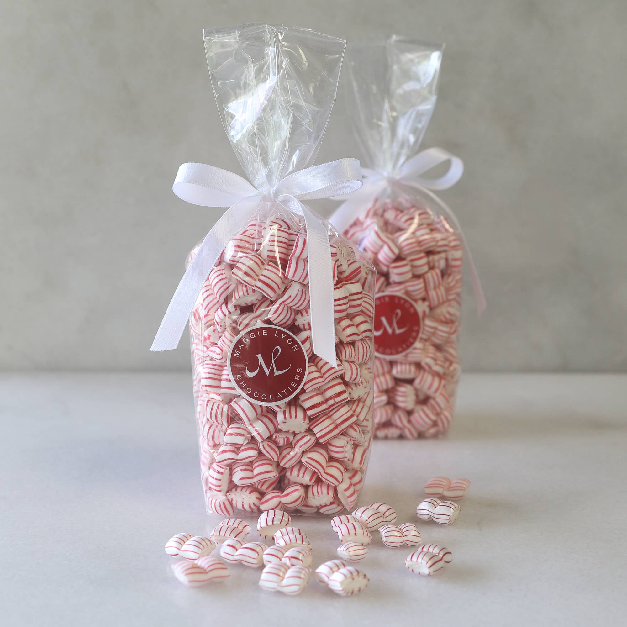 Red and white striped hard candies with a smooth, refreshing peppermint flavor. Packaged in a clear cello bag with a satin ribbon, they’re perfect for gifting, sharing, or enjoying as a timeless treat.