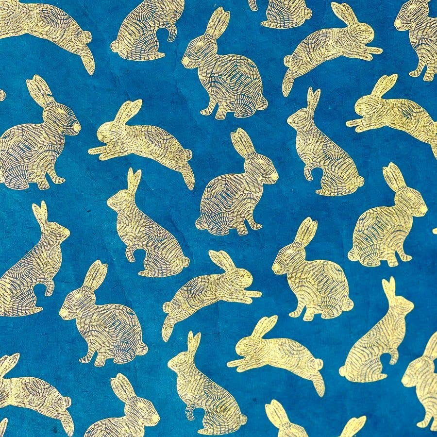 Introducing our 20x30 Bunnies, gold on dark teal by Giftsland. This beautifully designed flat wrap is perfect for any gift-giving occasion. The paper is made from the bark of the Daphne plant, known locally as Lokta, which grows in the mountains of Nepal. The process of using only the bark helps the plant to regrow, ensuring a sustainable and eco-friendly product.