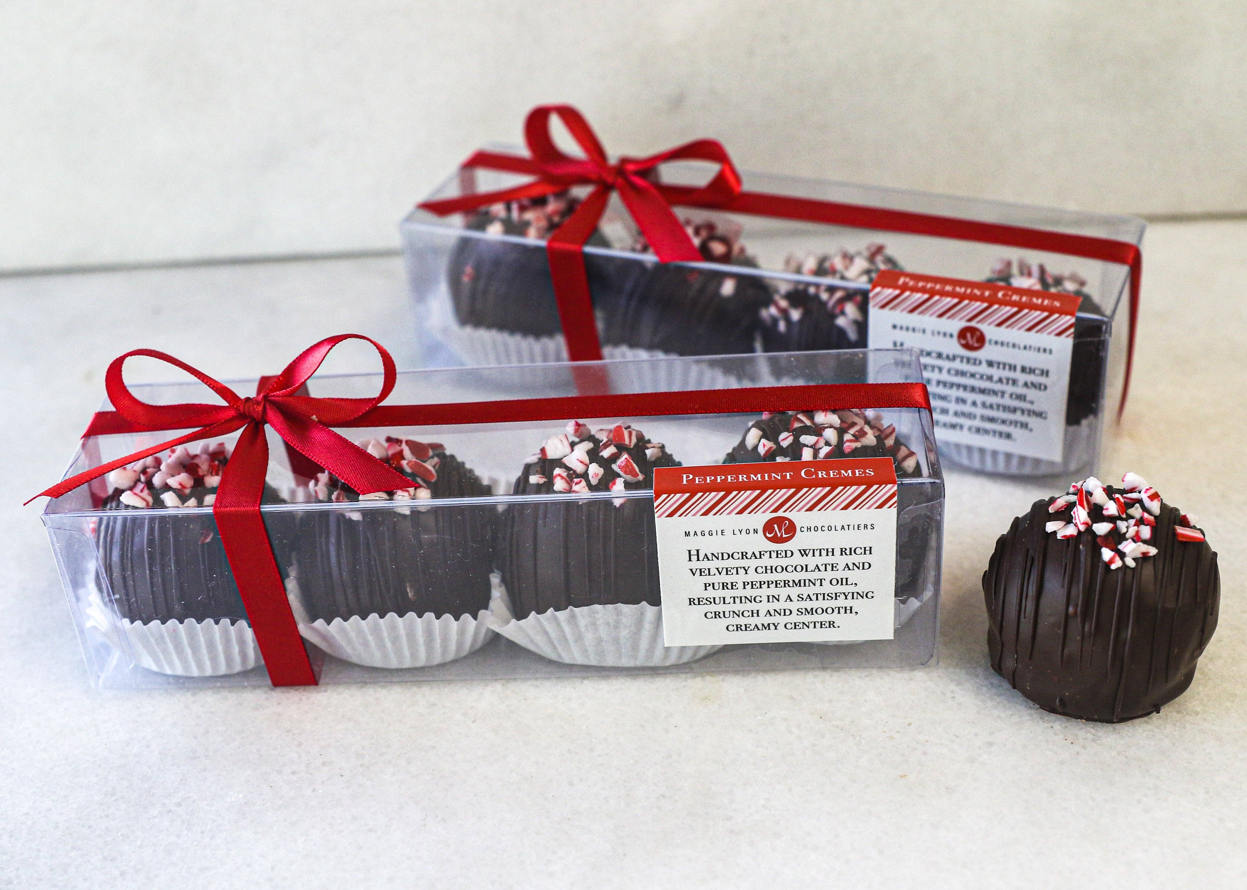 Handcrafted Peppermint Cremes with dark chocolate and a touch of pure peppermint oil sprinkled with peppermint crunch.
