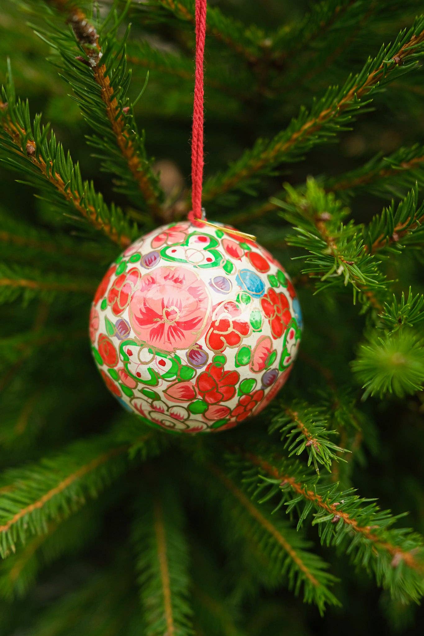 These beautiful baubles are all made from papier mâché recycled paper, hand-painted with intricate, colourful designs, and have a soft cotton thread hanging loop.
