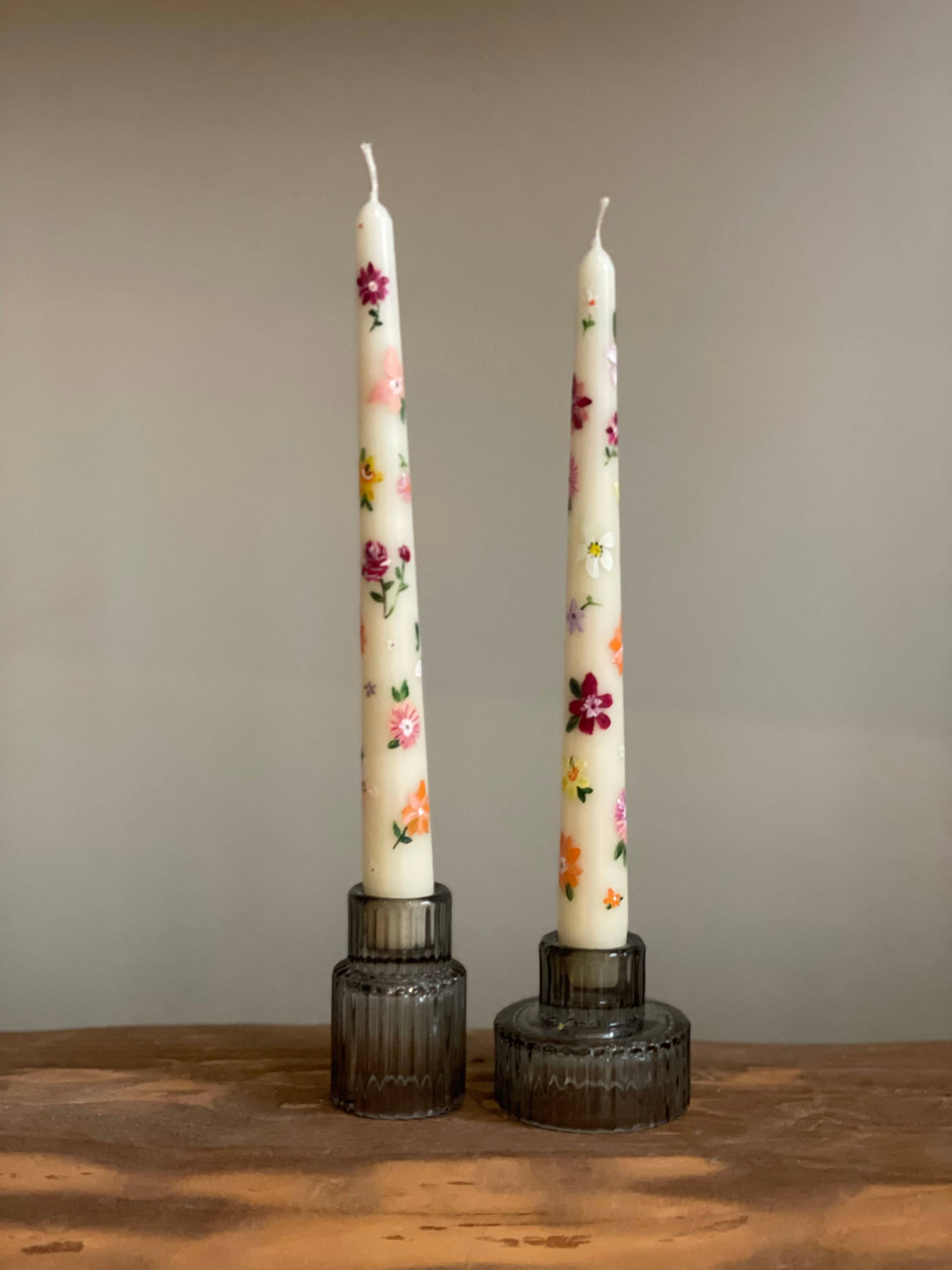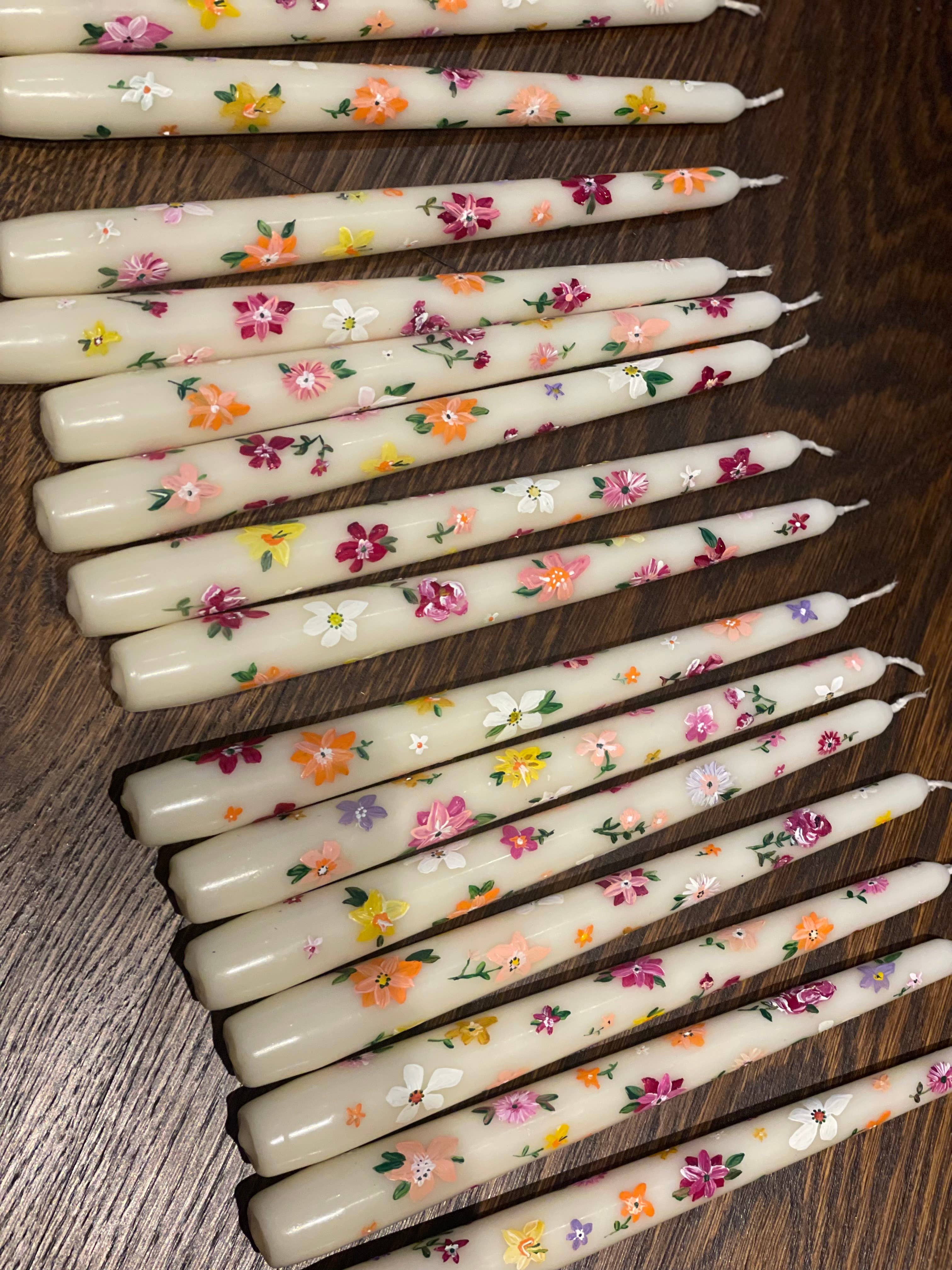 Hand painted, 10” Ivory tapers. Ship in gift box (1 unit = boxed pair of 2). Mix multicolor florals.
