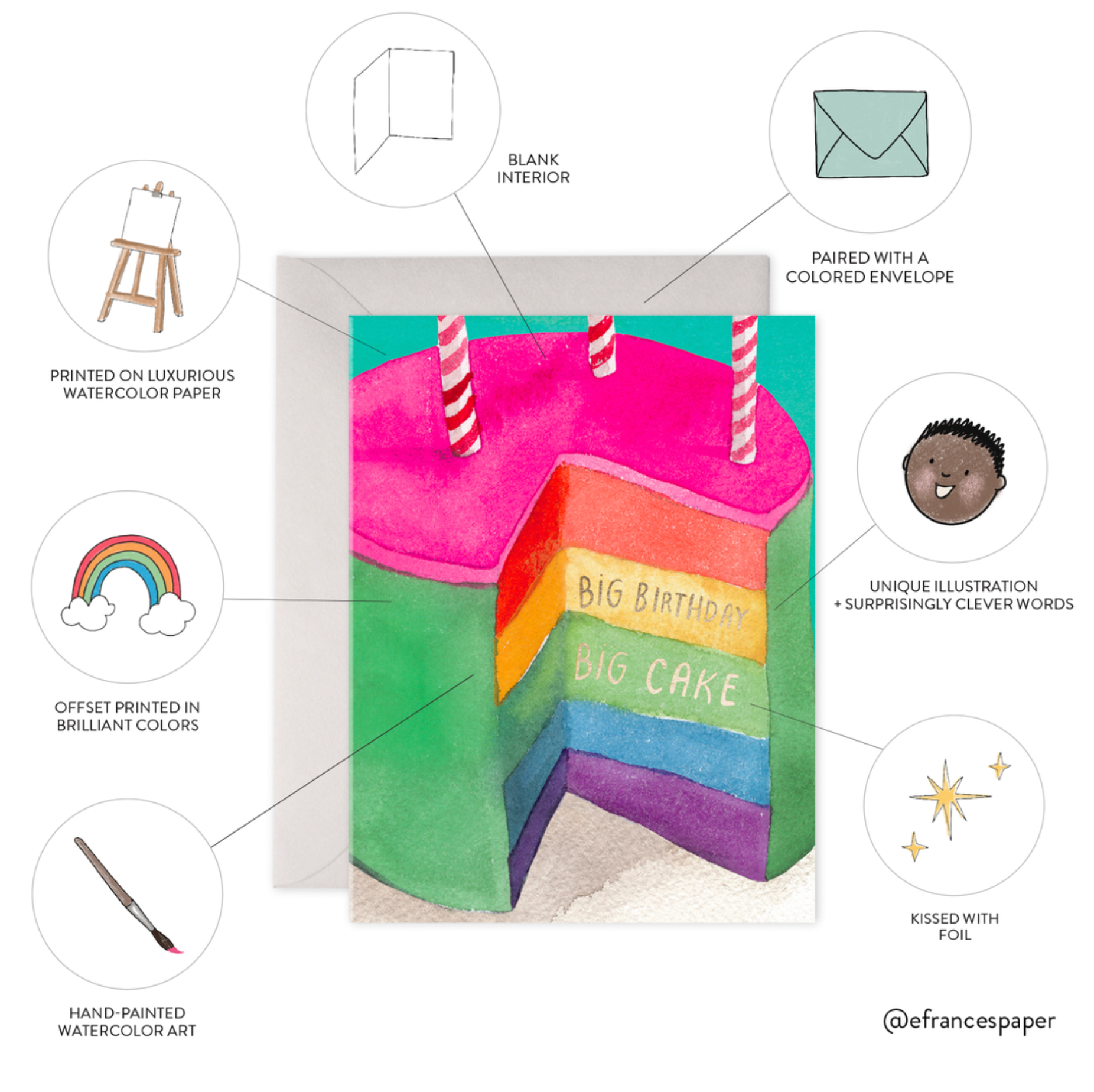 Each E. Frances card begins as an original watercolor painting, is then printed in brilliant color on luxe, heavyweight paper and is finally kissed with gold foil.