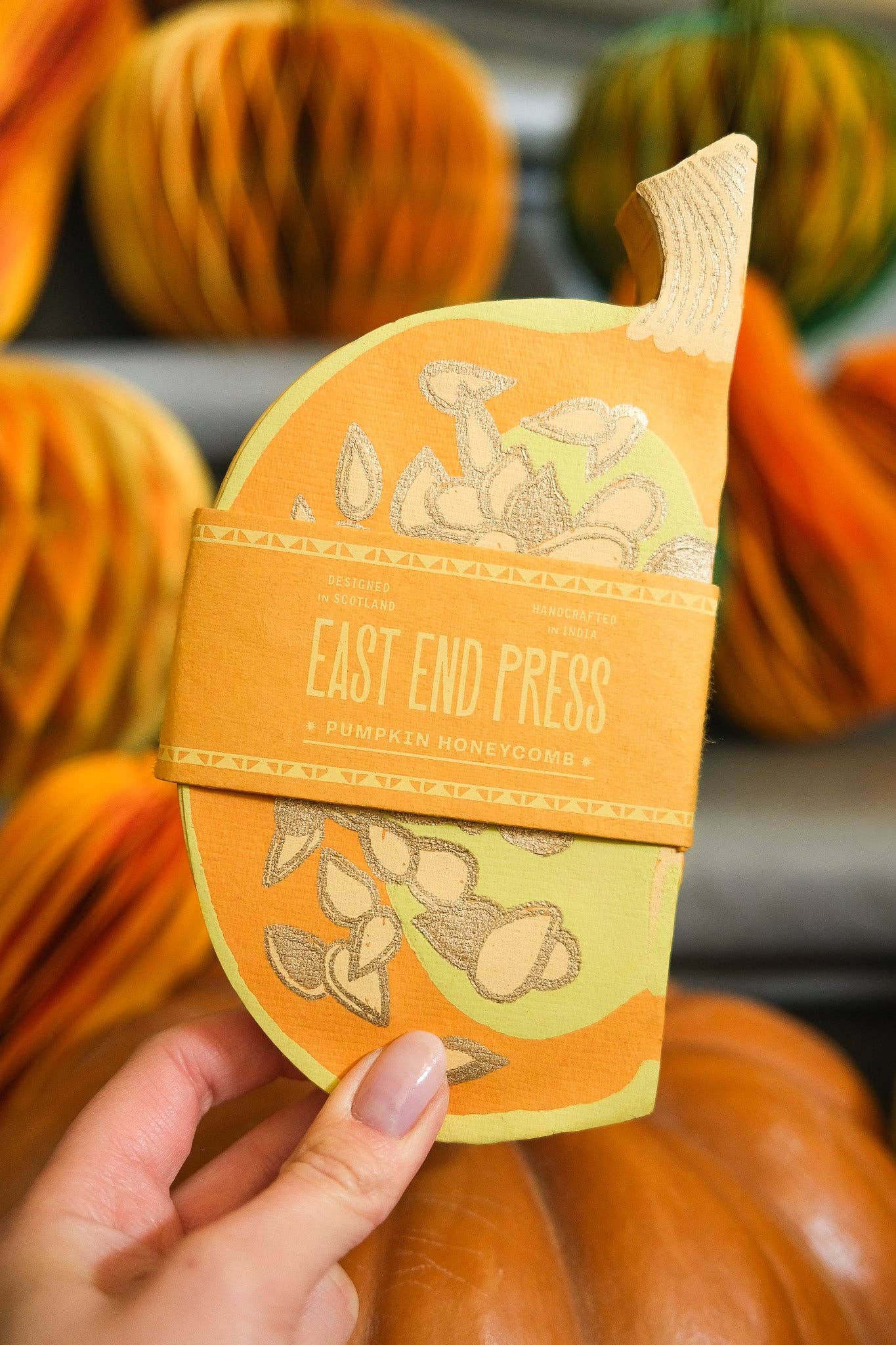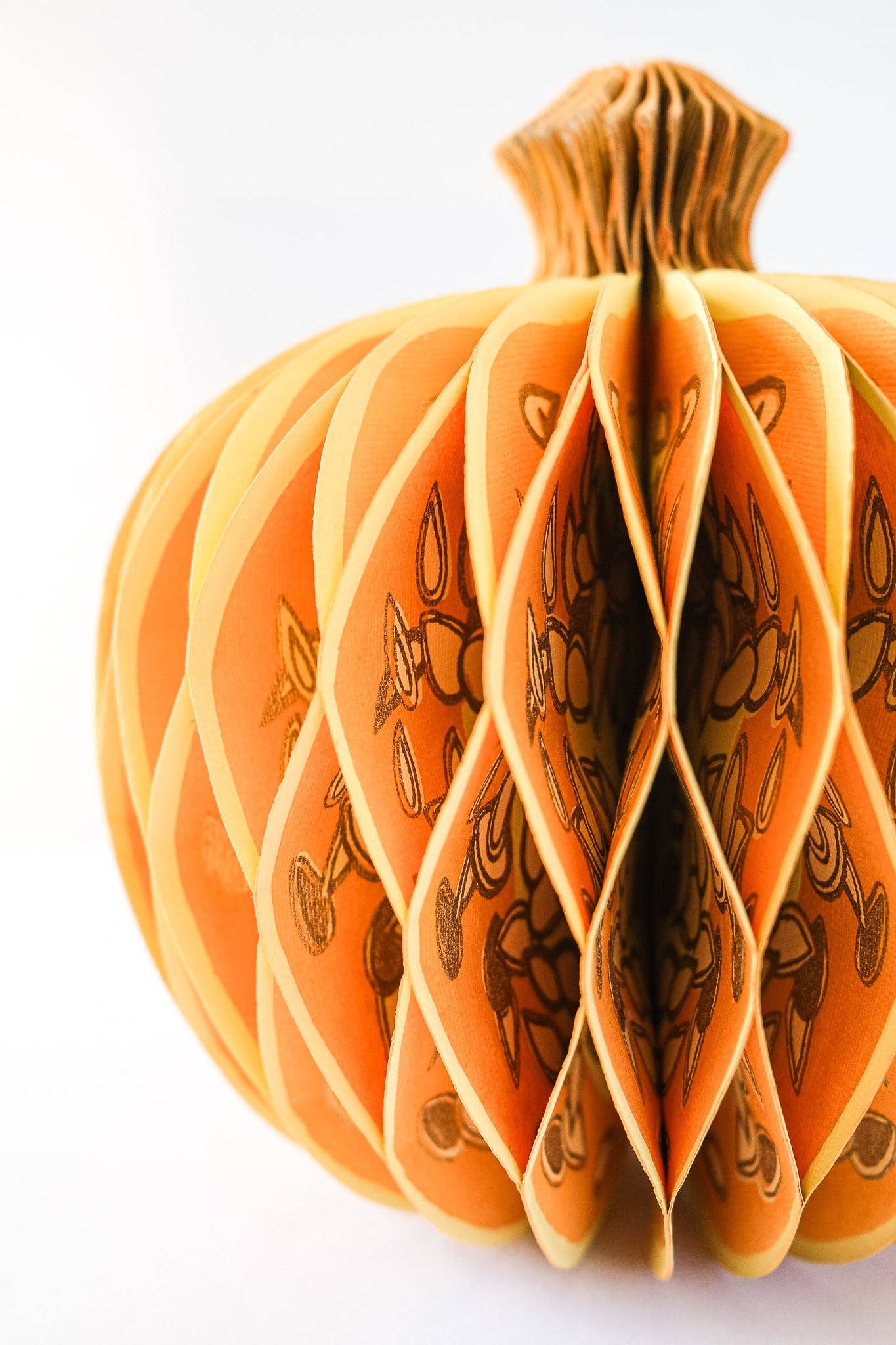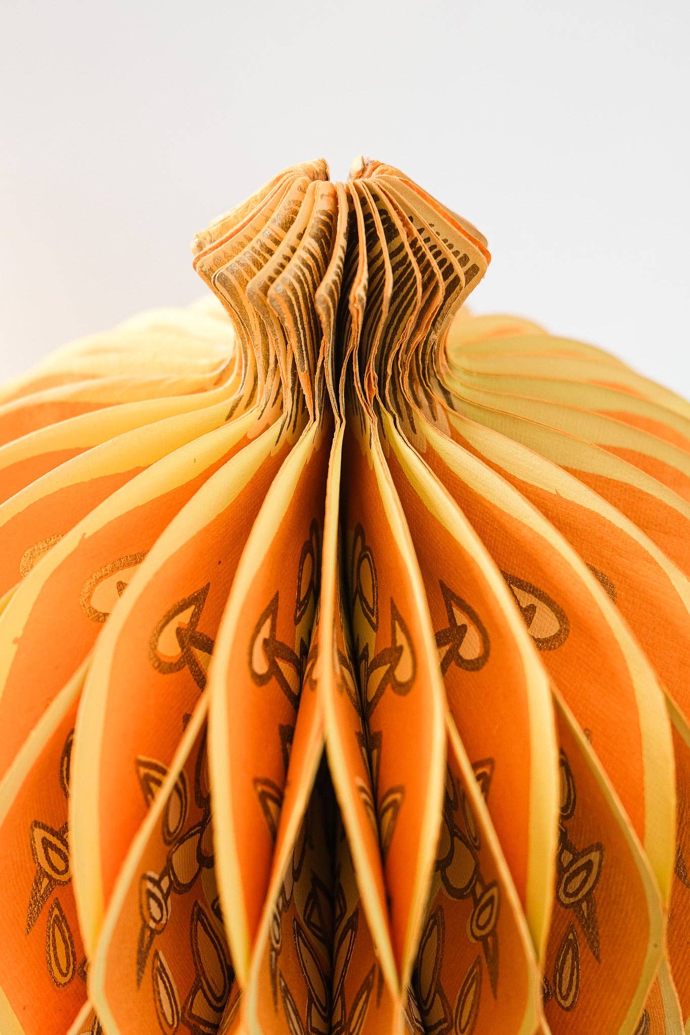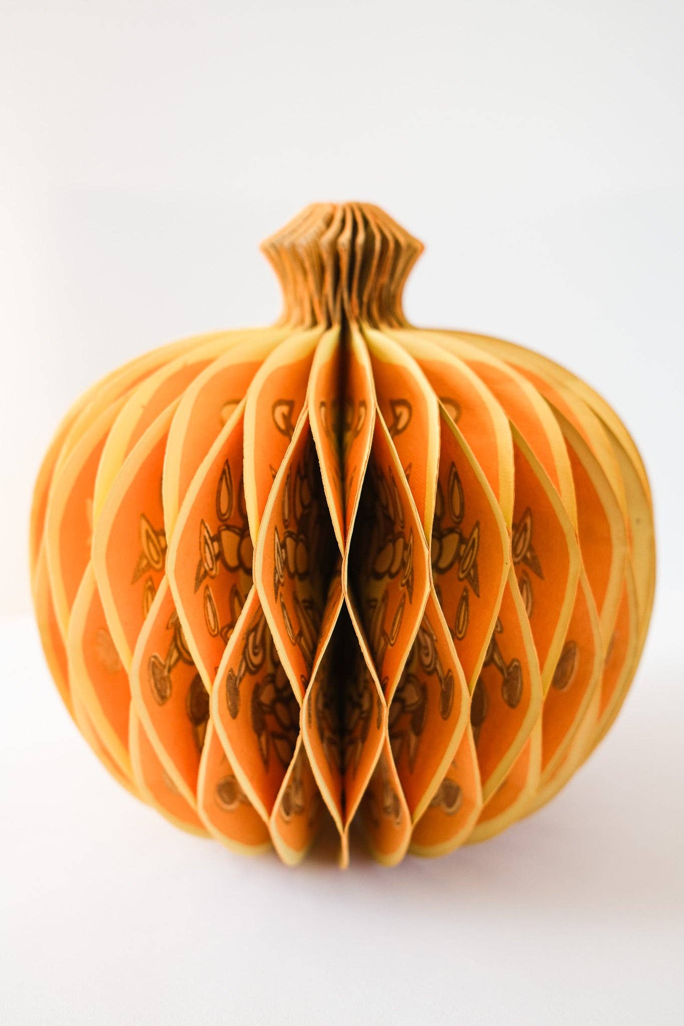 Composed of intricate layers of recycled cotton paper, each decoration unfolds to reveal a three-dimensional pumpkin honeycomb. Minimum order: 6 - One pumpkin-shaped paper ornament with a cotton hanging loop - Each secured with a magnet - Screen printed by hand by talented artisans in Jaipur - Sustainably made from recycled materials Disclaimer: this item is not a toy, and contains magnetic components. The many layers of our honeycomb decorations are assembled by hand. When freshly opened, they may need a little bit of gentle encouragement to expand and for the ends to stick together with the magnet. As the layers loosen with time after being tightly packed, this should become easier.