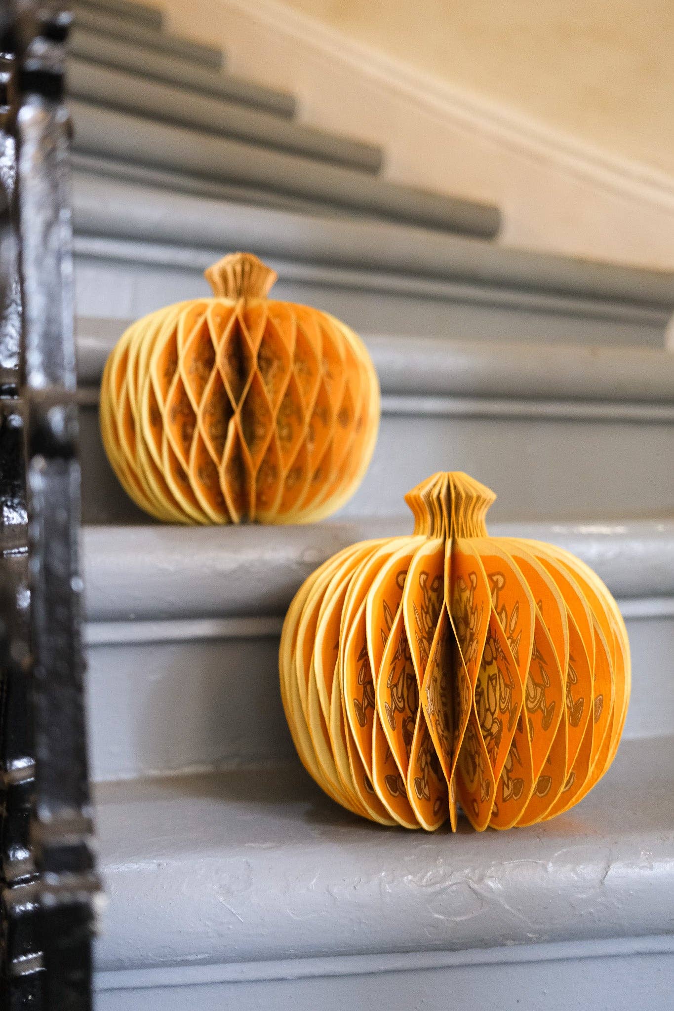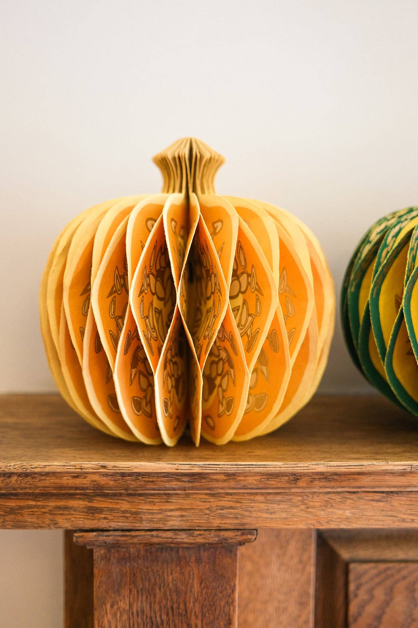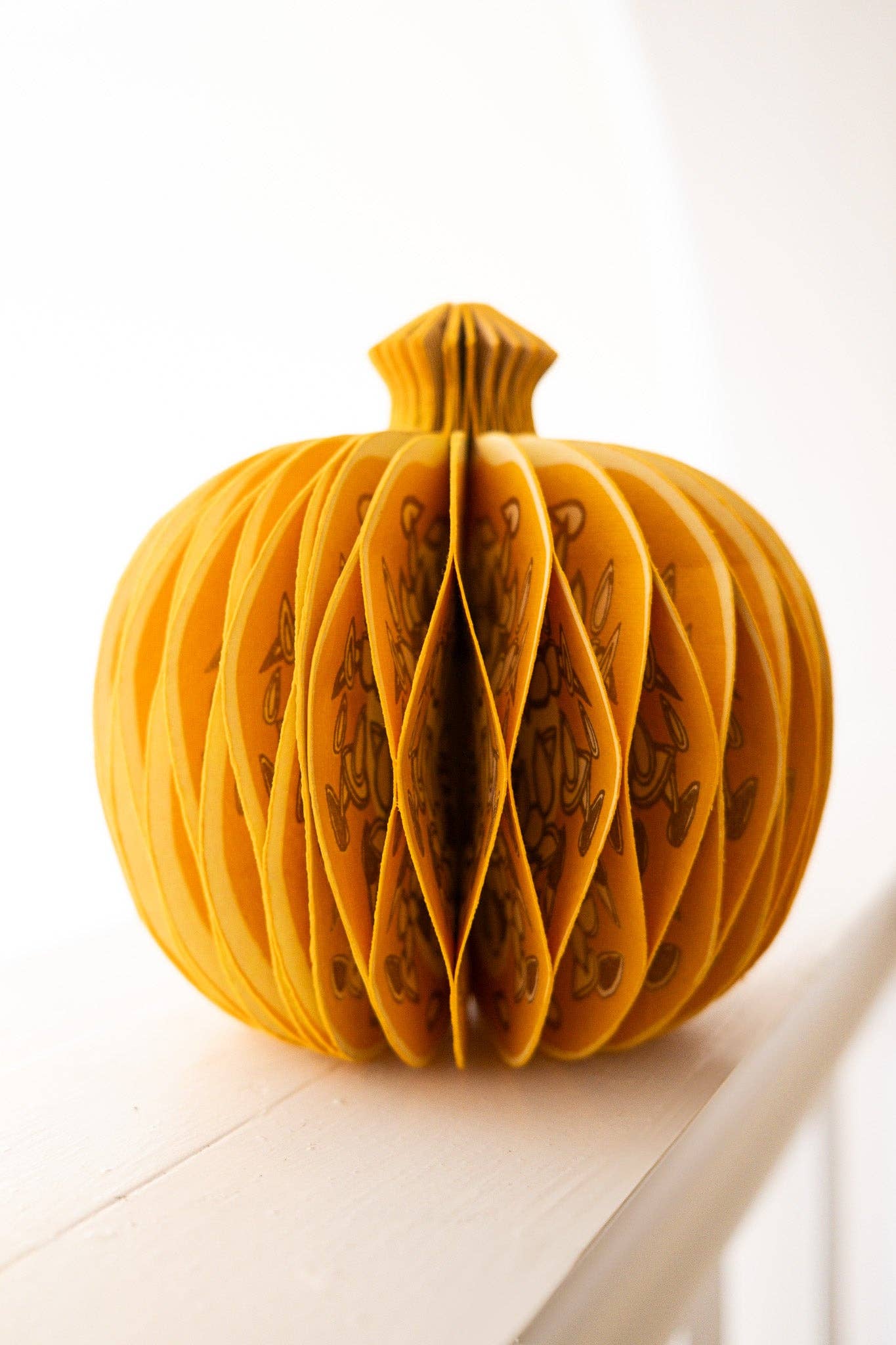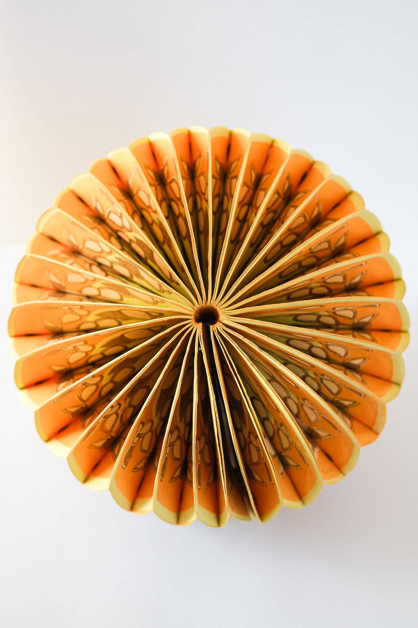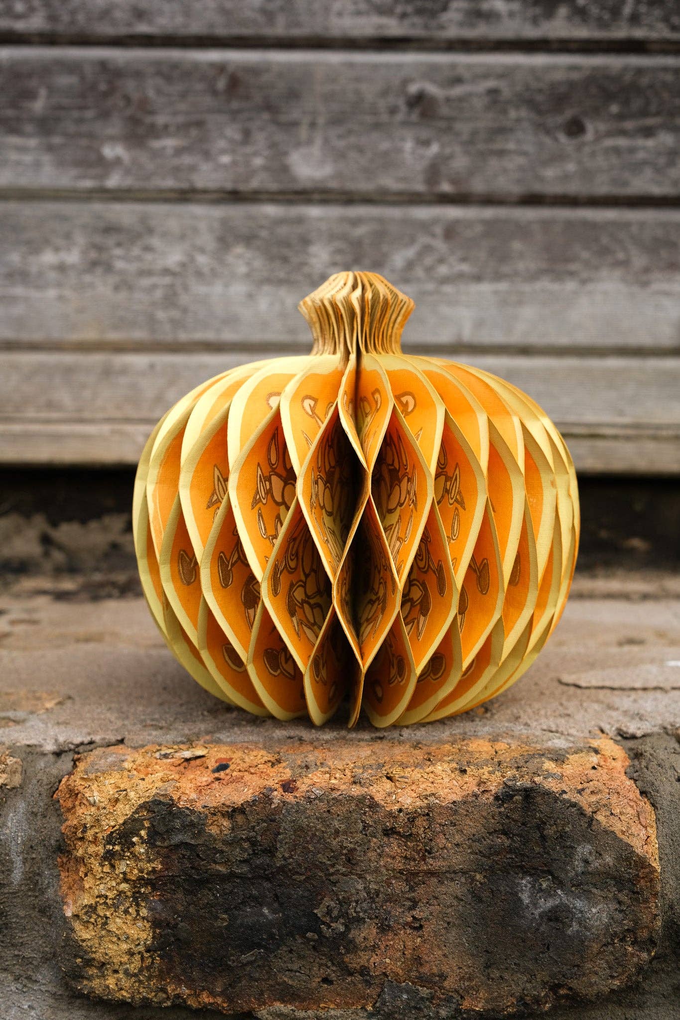 Composed of intricate layers of recycled cotton paper, each decoration unfolds to reveal a three-dimensional pumpkin honeycomb. Minimum order: 6 - One pumpkin-shaped paper ornament with a cotton hanging loop - Each secured with a magnet - Screen printed by hand by talented artisans in Jaipur - Sustainably made from recycled materials Disclaimer: this item is not a toy, and contains magnetic components. The many layers of our honeycomb decorations are assembled by hand. When freshly opened, they may need a little bit of gentle encouragement to expand and for the ends to stick together with the magnet. As the layers loosen with time after being tightly packed, this should become easier.