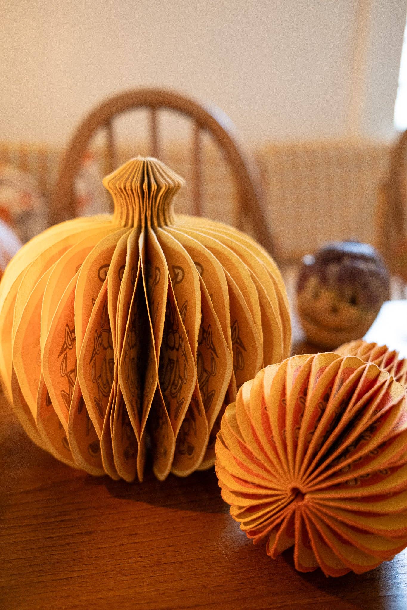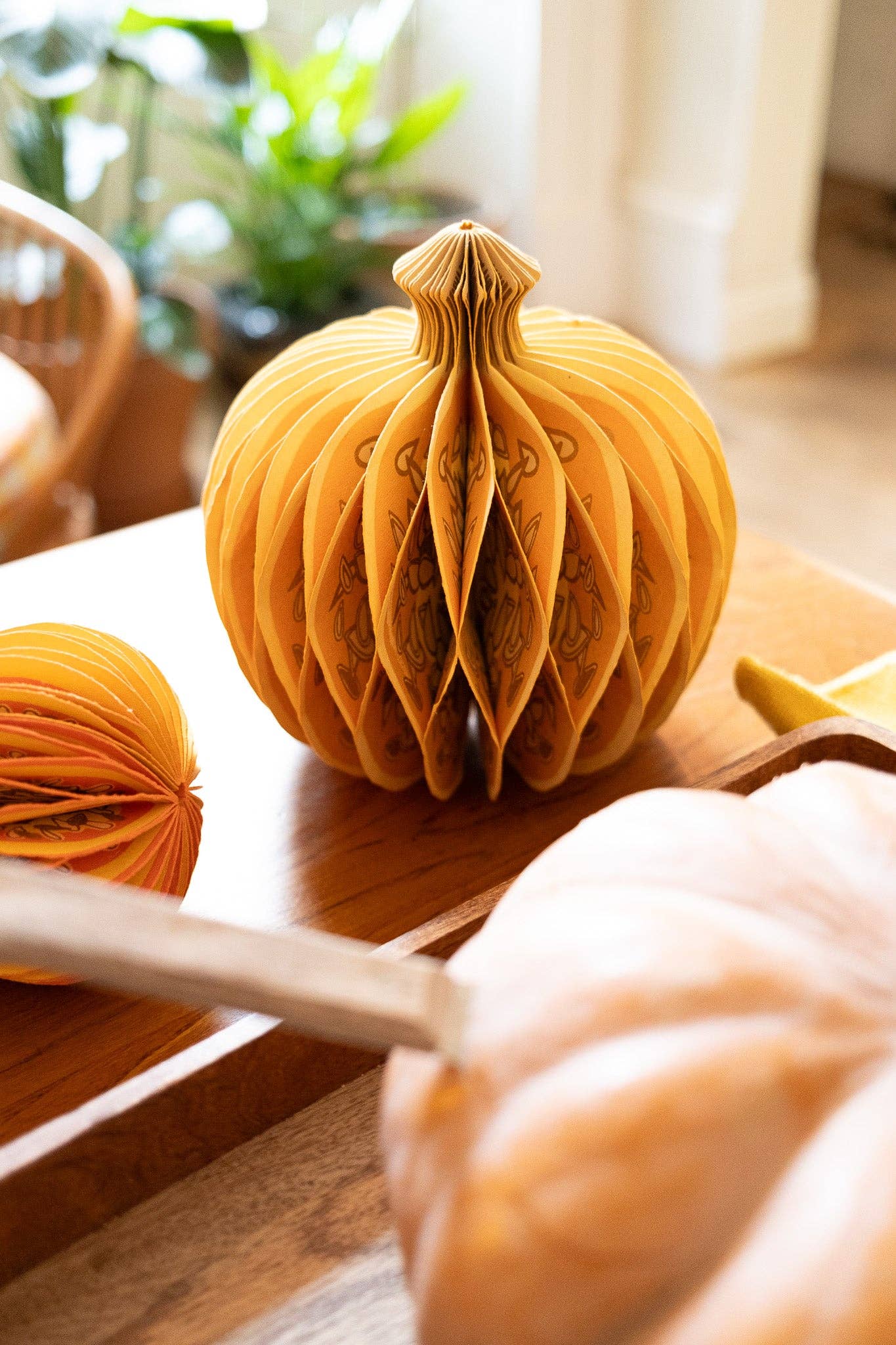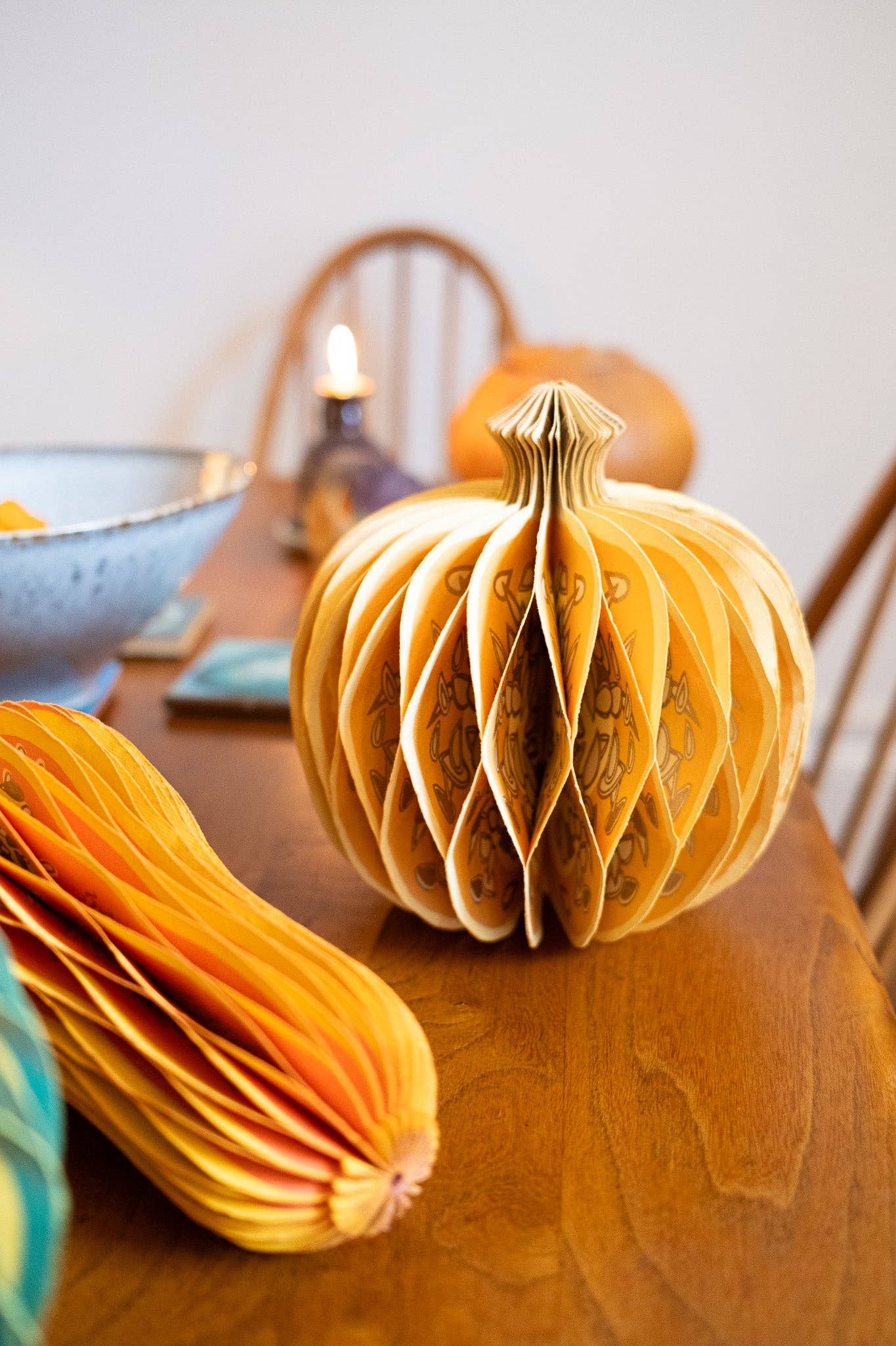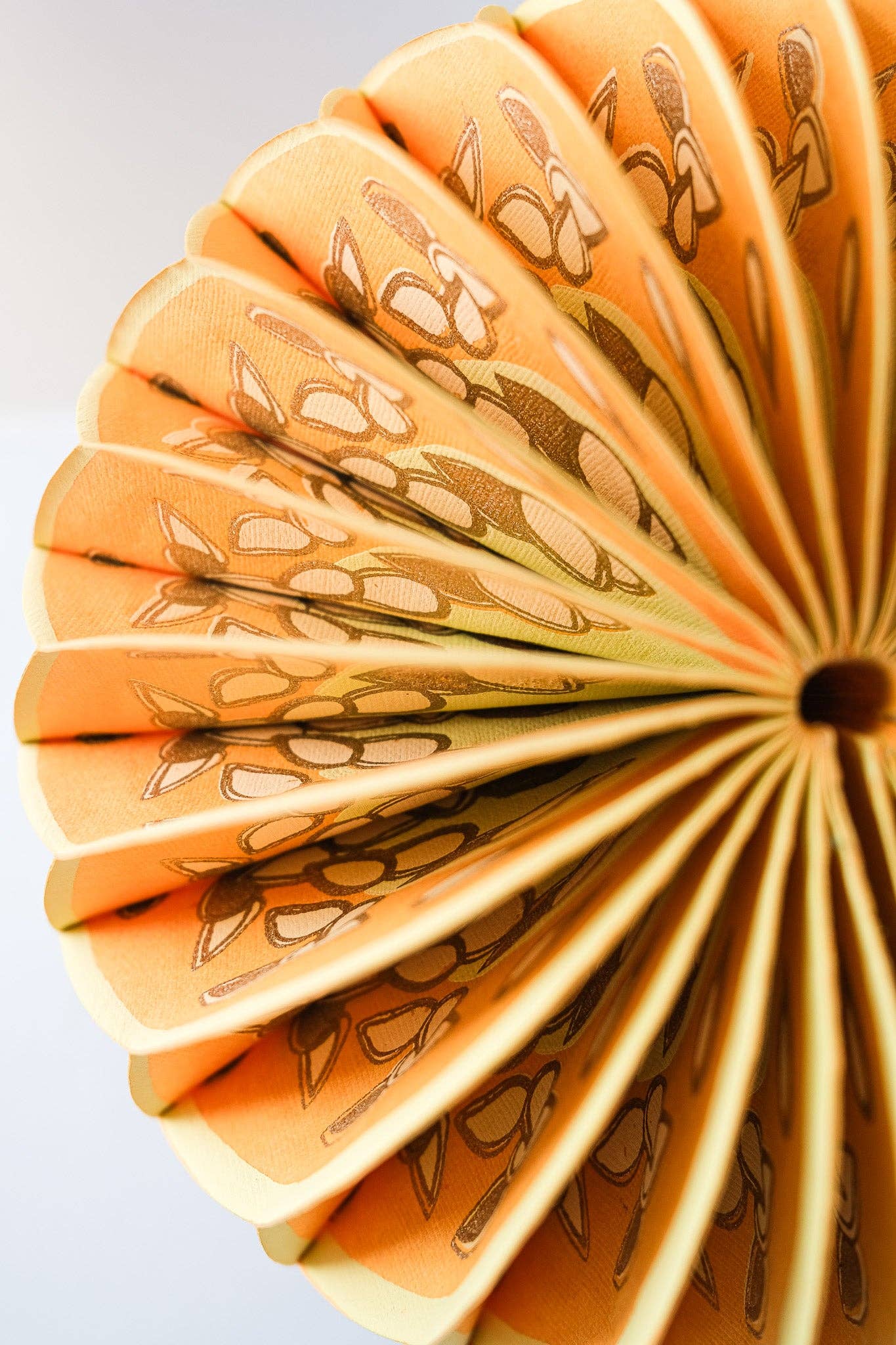 Composed of intricate layers of recycled cotton paper, each decoration unfolds to reveal a three-dimensional pumpkin honeycomb. Minimum order: 6 - One pumpkin-shaped paper ornament with a cotton hanging loop - Each secured with a magnet - Screen printed by hand by talented artisans in Jaipur - Sustainably made from recycled materials Disclaimer: this item is not a toy, and contains magnetic components. The many layers of our honeycomb decorations are assembled by hand. When freshly opened, they may need a little bit of gentle encouragement to expand and for the ends to stick together with the magnet. As the layers loosen with time after being tightly packed, this should become easier.