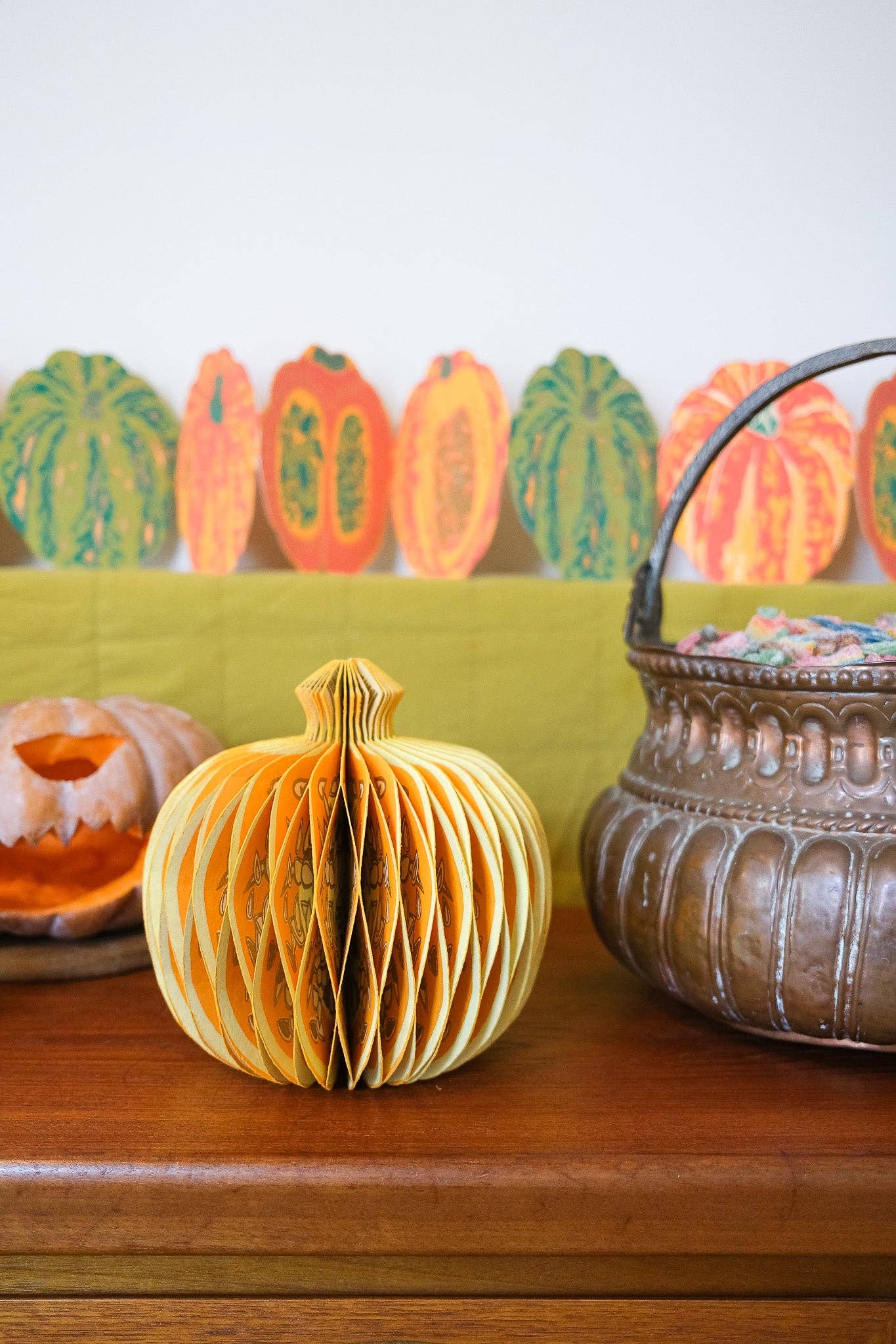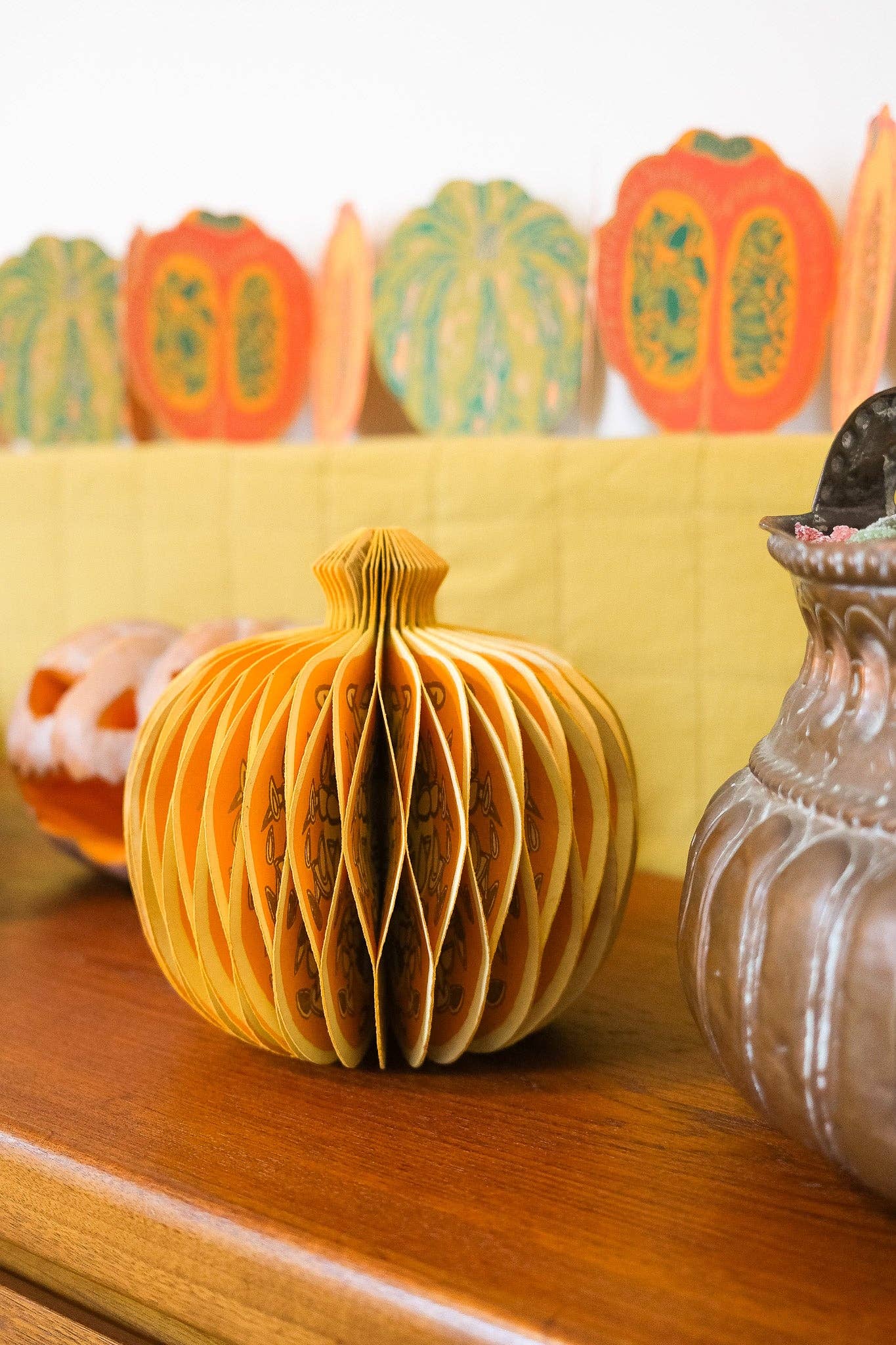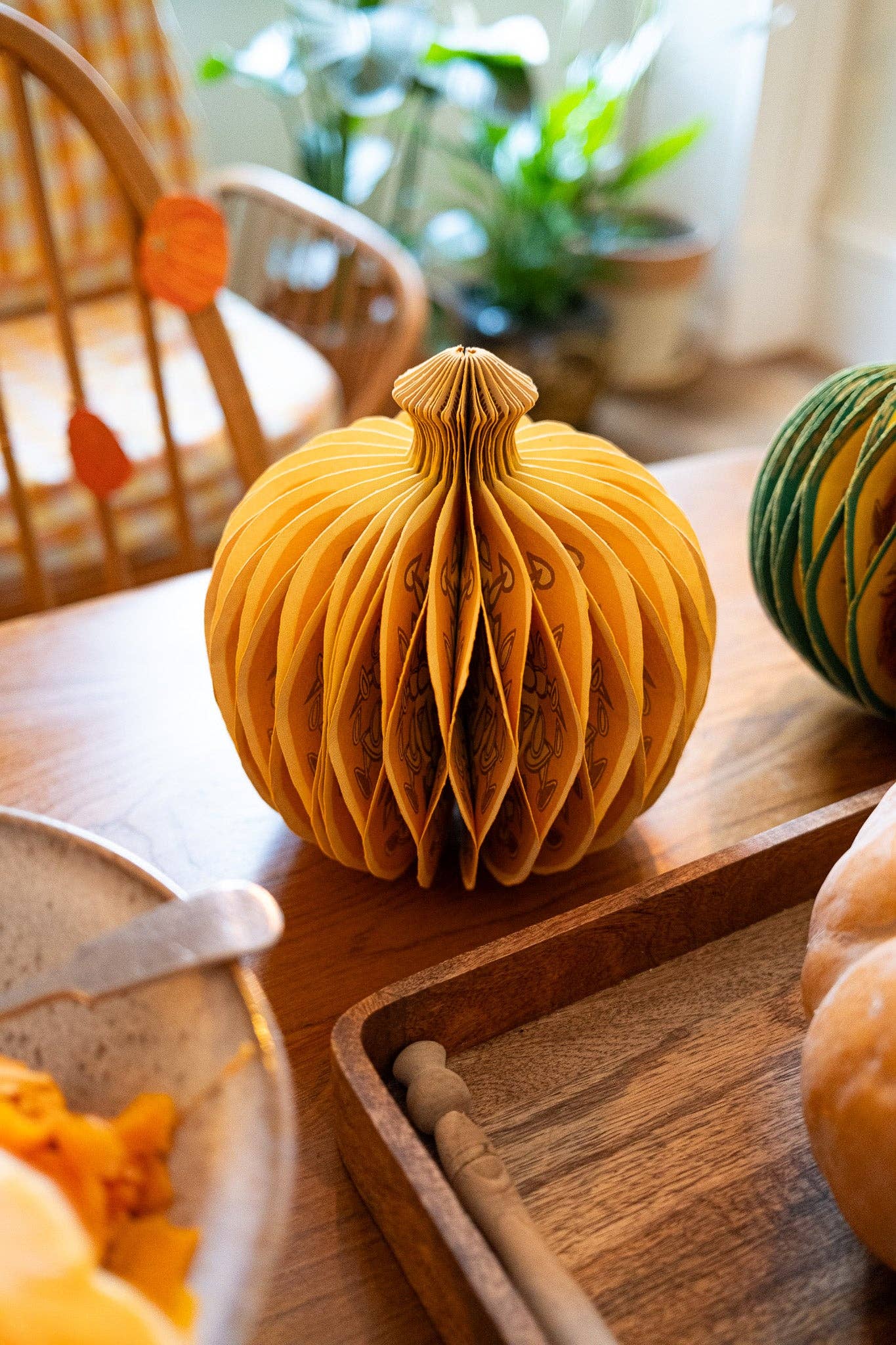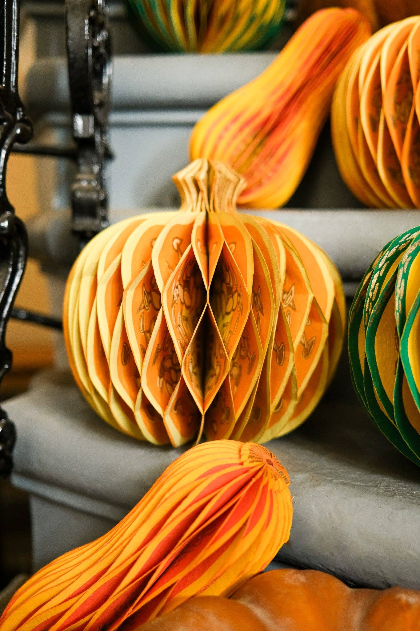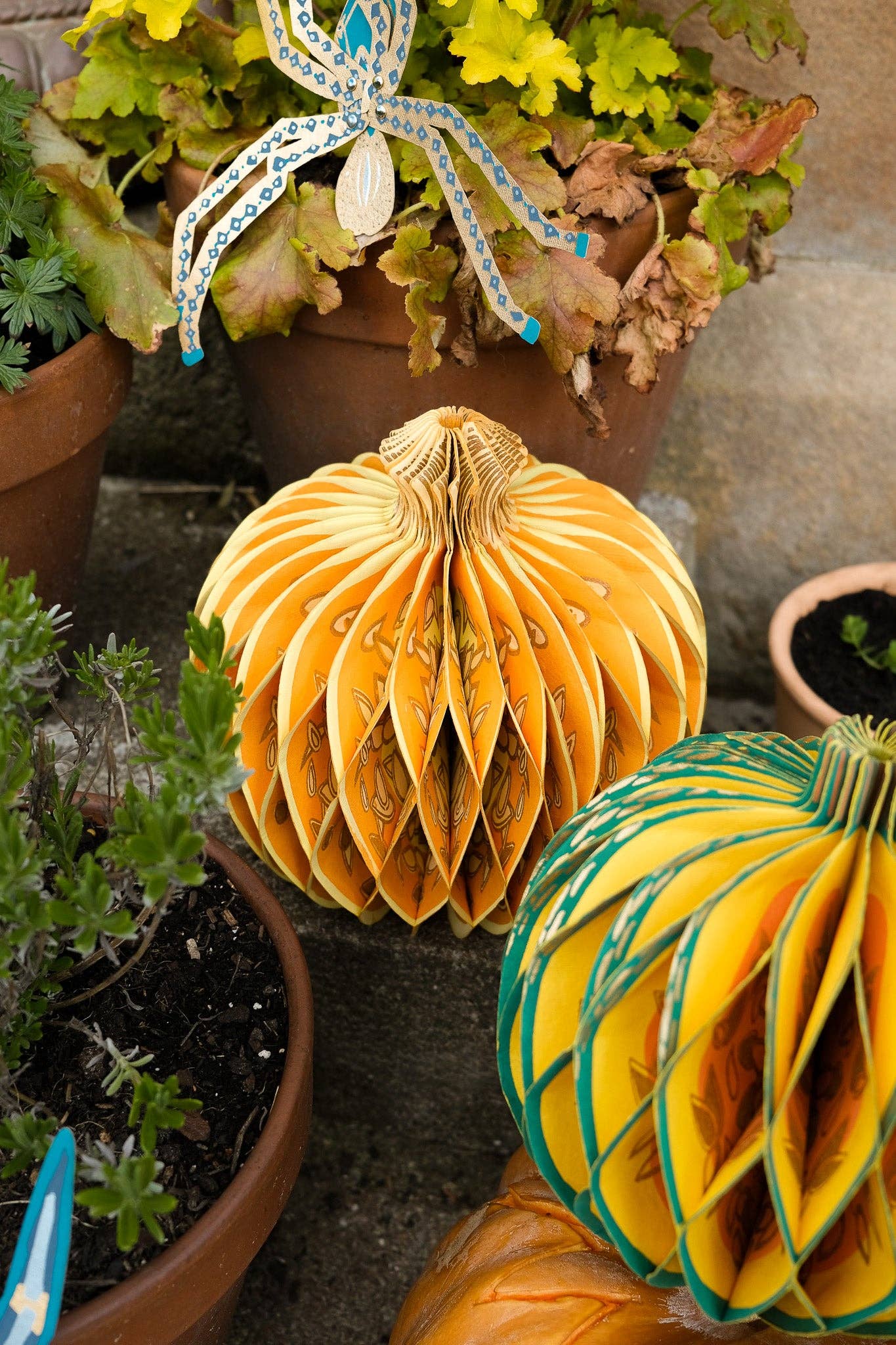 Composed of intricate layers of recycled cotton paper, each decoration unfolds to reveal a three-dimensional pumpkin honeycomb. Minimum order: 6 - One pumpkin-shaped paper ornament with a cotton hanging loop - Each secured with a magnet - Screen printed by hand by talented artisans in Jaipur - Sustainably made from recycled materials Disclaimer: this item is not a toy, and contains magnetic components. The many layers of our honeycomb decorations are assembled by hand. When freshly opened, they may need a little bit of gentle encouragement to expand and for the ends to stick together with the magnet. As the layers loosen with time after being tightly packed, this should become easier.