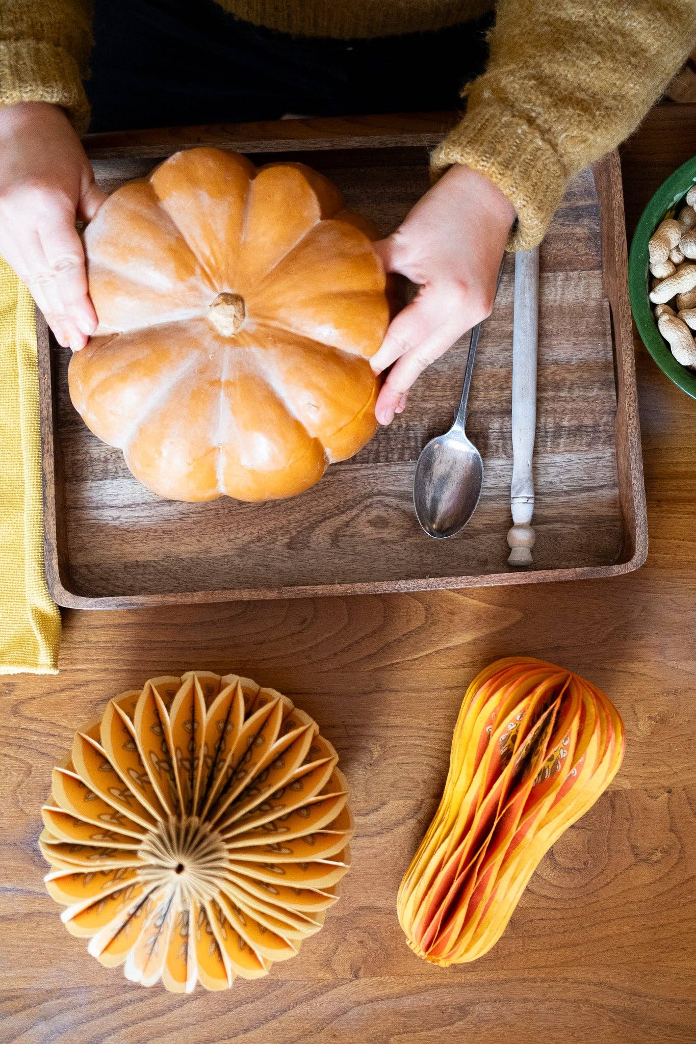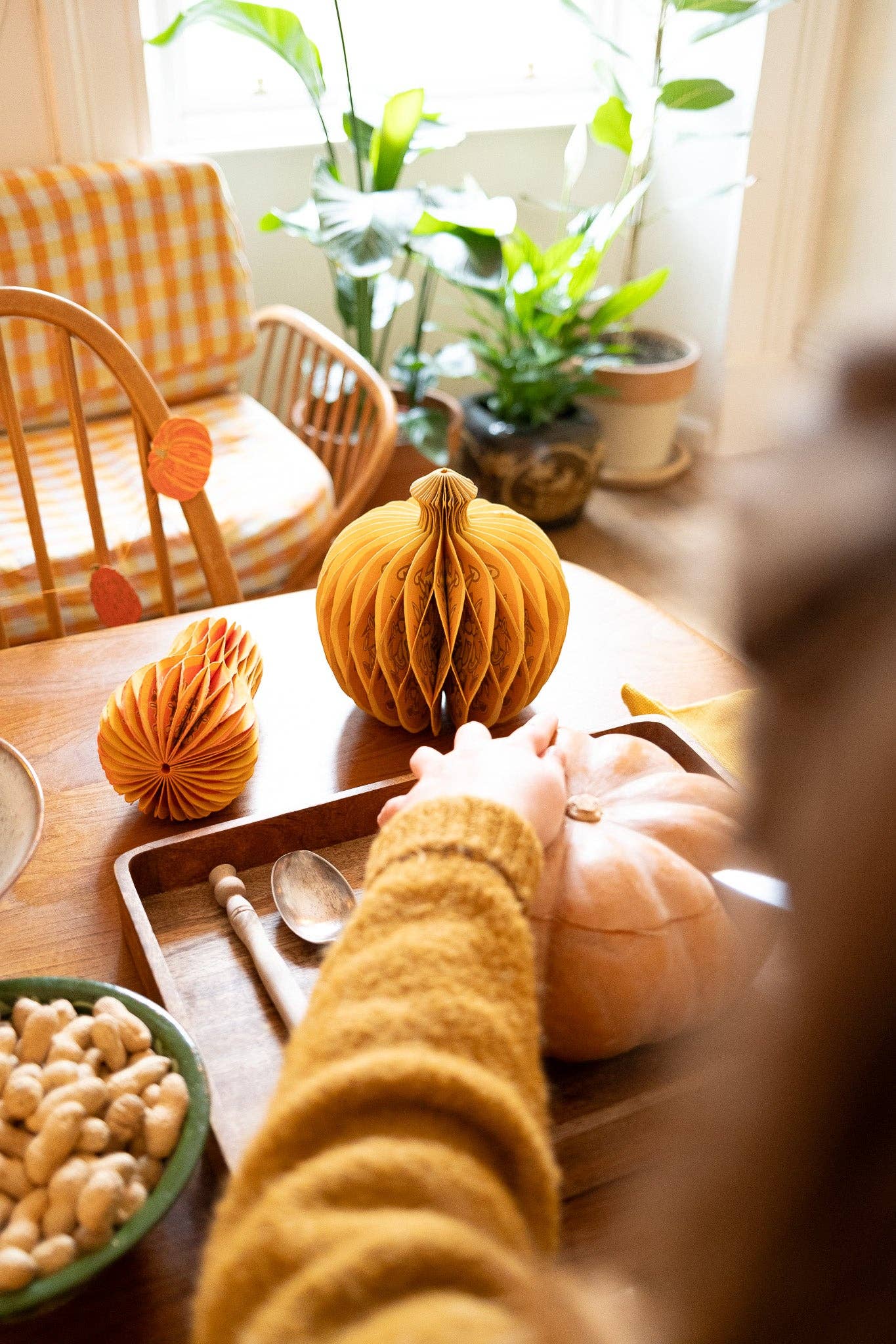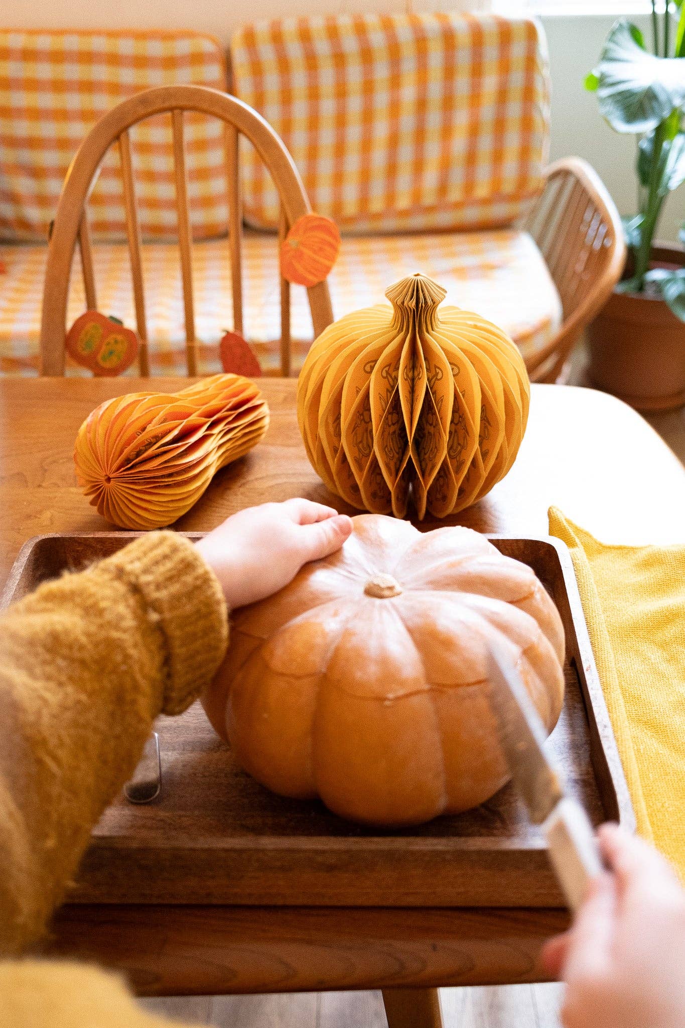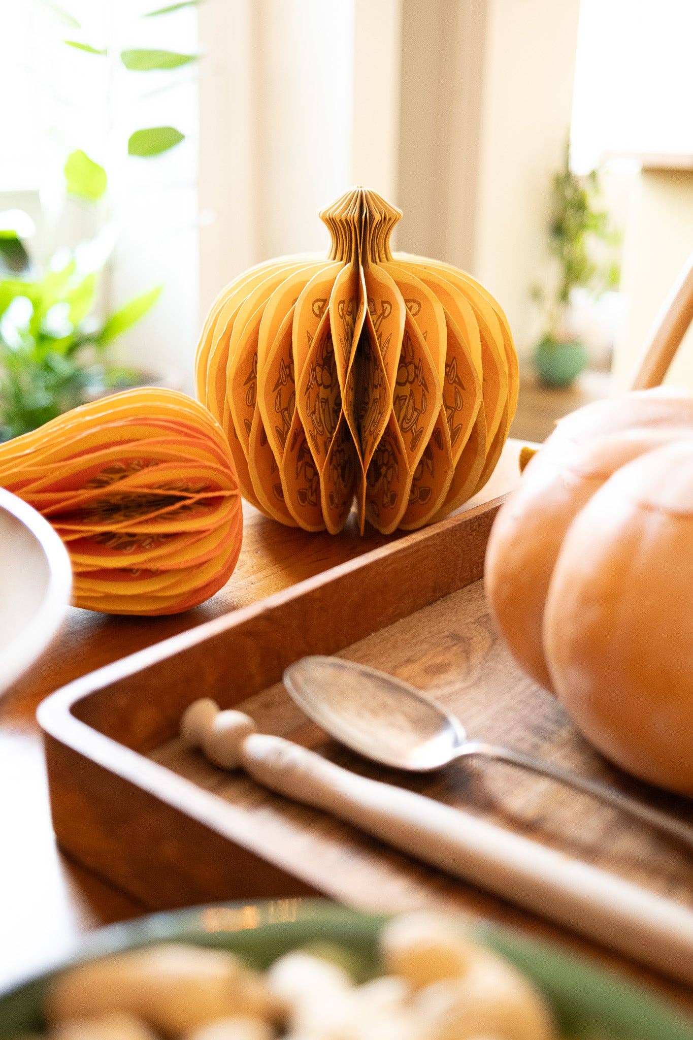 Composed of intricate layers of recycled cotton paper, each decoration unfolds to reveal a three-dimensional pumpkin honeycomb. Minimum order: 6 - One pumpkin-shaped paper ornament with a cotton hanging loop - Each secured with a magnet - Screen printed by hand by talented artisans in Jaipur - Sustainably made from recycled materials Disclaimer: this item is not a toy, and contains magnetic components. The many layers of our honeycomb decorations are assembled by hand. When freshly opened, they may need a little bit of gentle encouragement to expand and for the ends to stick together with the magnet. As the layers loosen with time after being tightly packed, this should become easier.