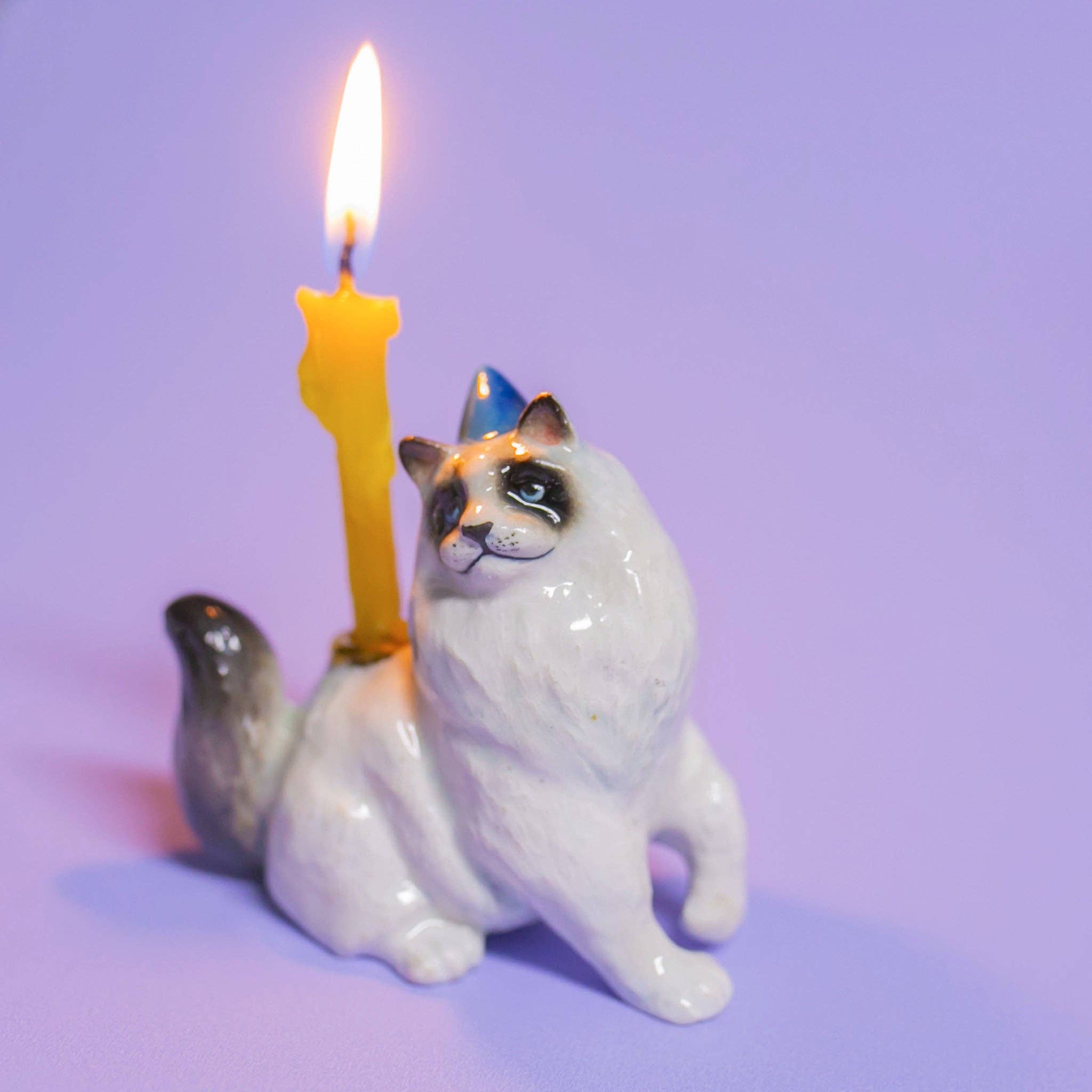 The Ragdoll Cat Cake Topper from Camp Hollow is a perfect addition to any celebration. This charming topper showcases a beautifully detailed Ragdoll cat wearing a festive party hat, sitting beside a lit candle. Made from high-quality, food-safe materials, it ensures both safety and durability. Ideal for birthdays, cat-themed parties, and special occasions, its intricate design and lifelike features make it a memorable keepsake. Add a whimsical touch to your event with this adorable cake topper.