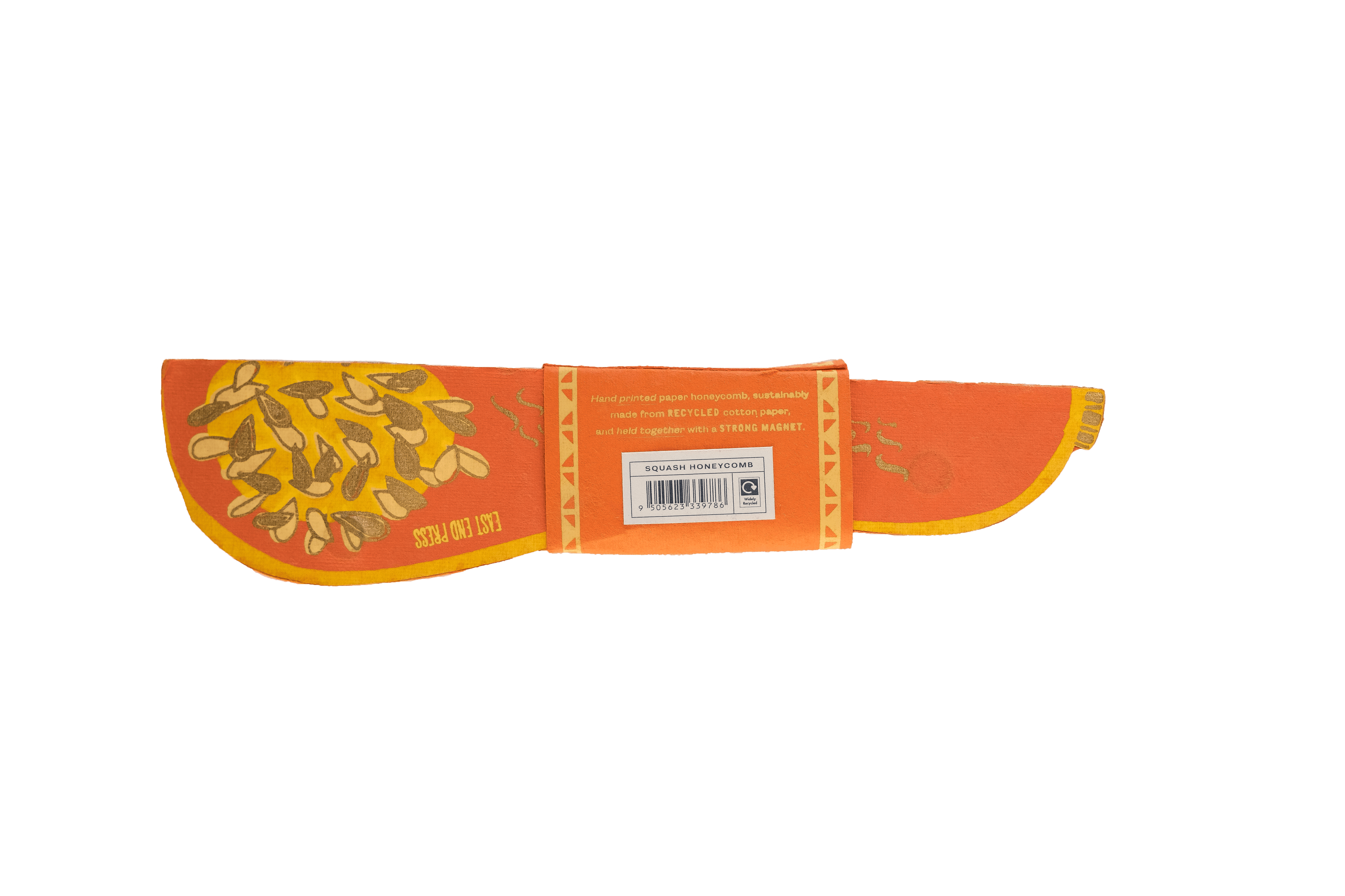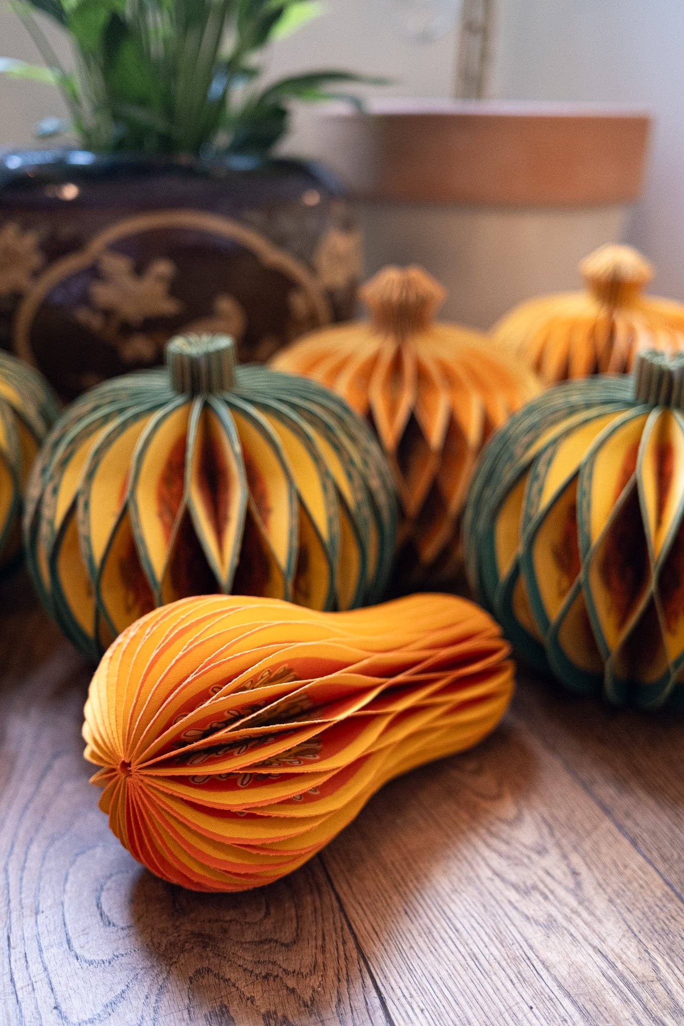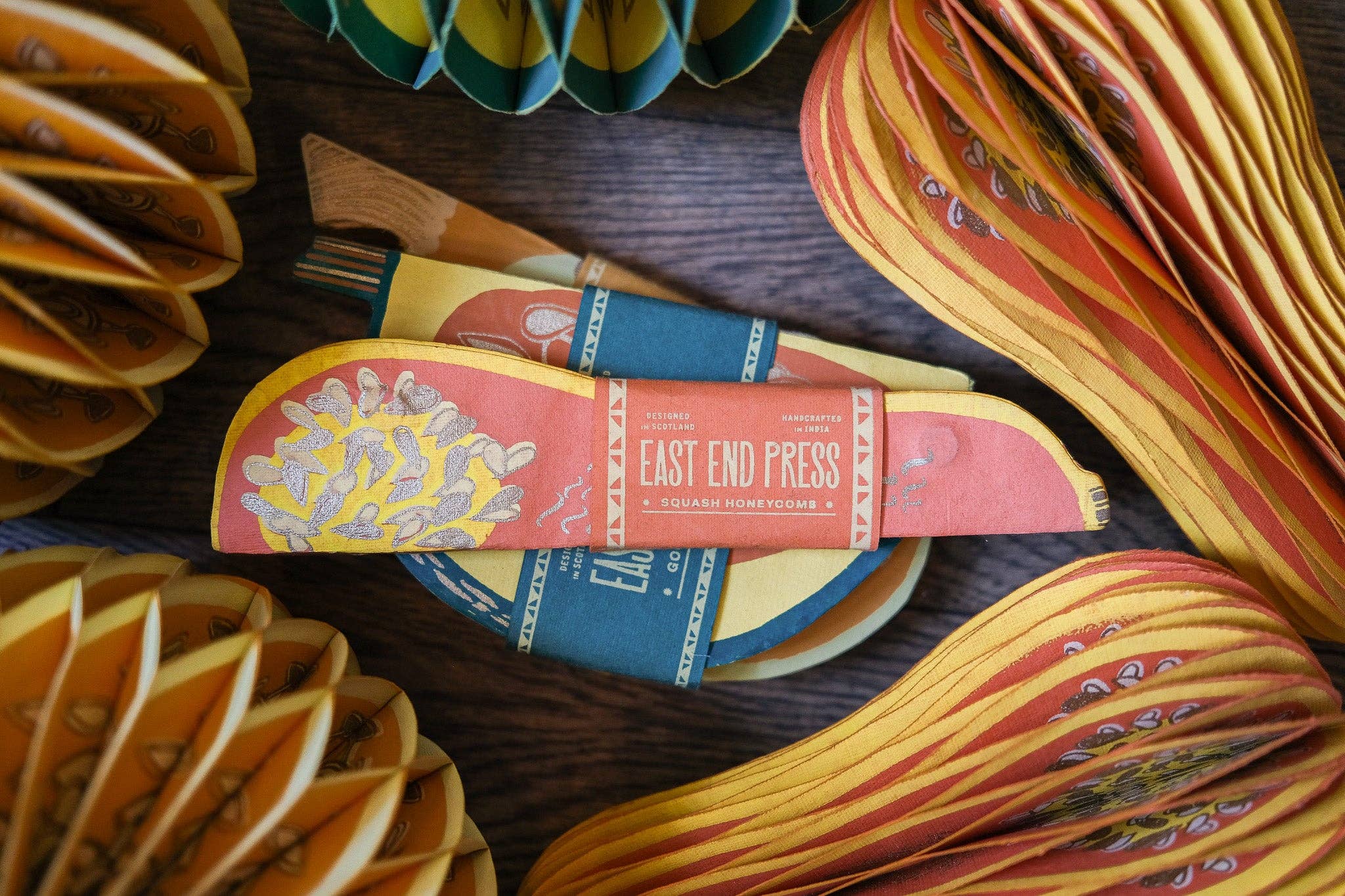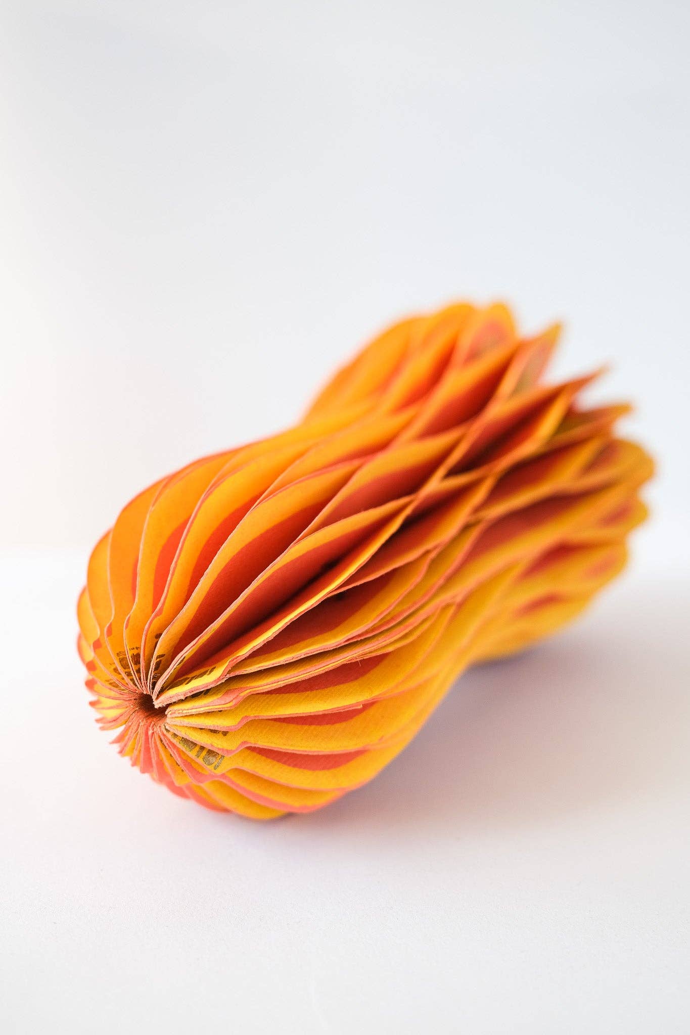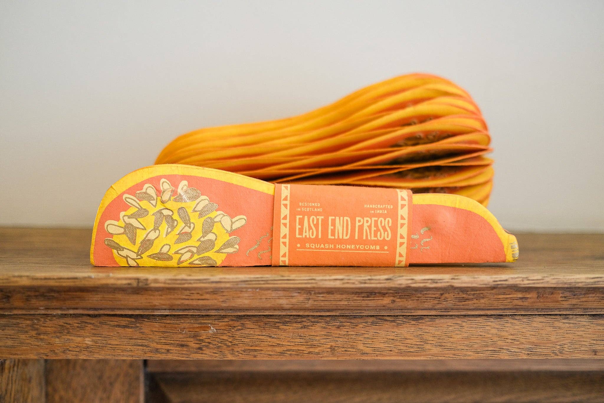Composed of intricate layers of recycled cotton paper, each decoration unfolds to reveal a three-dimensional squash honeycomb.