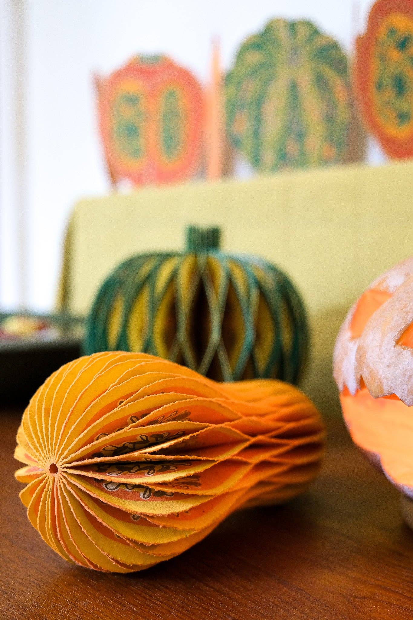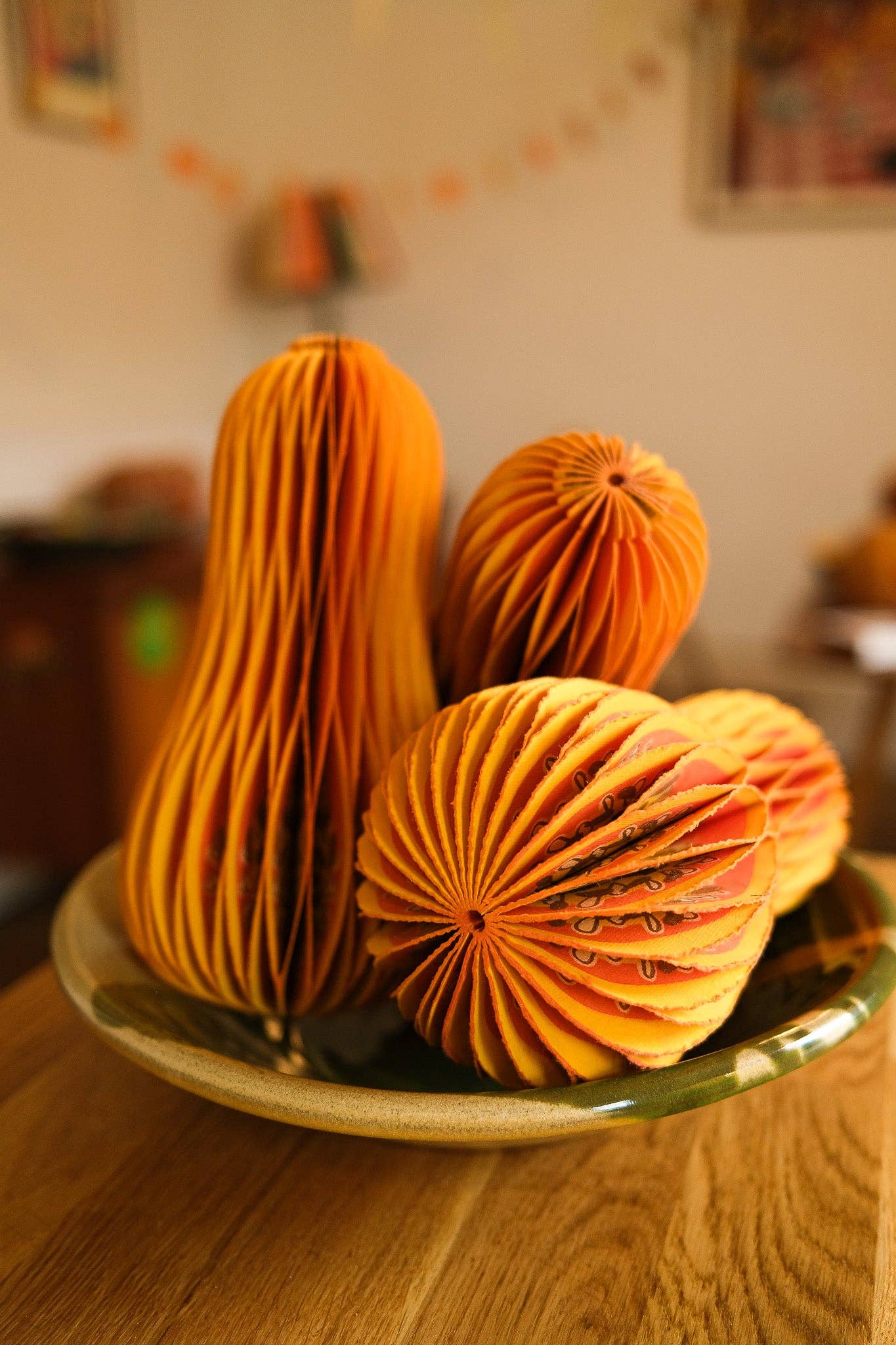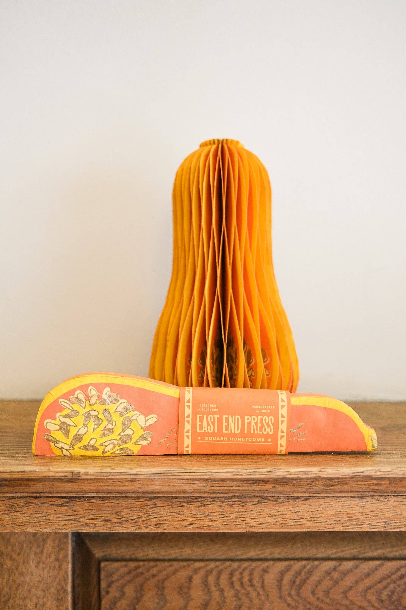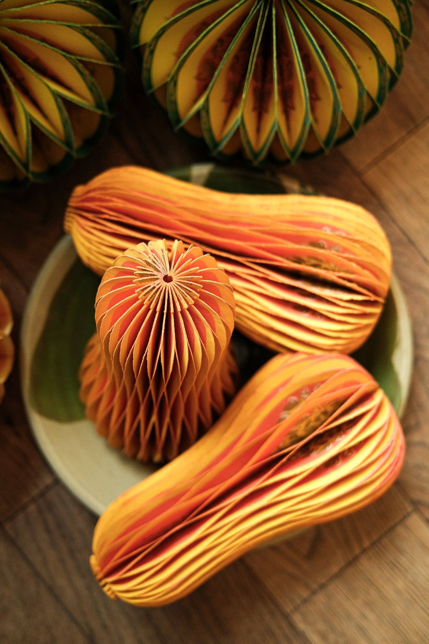 Composed of intricate layers of recycled cotton paper, each decoration unfolds to reveal a three-dimensional squash honeycomb.
