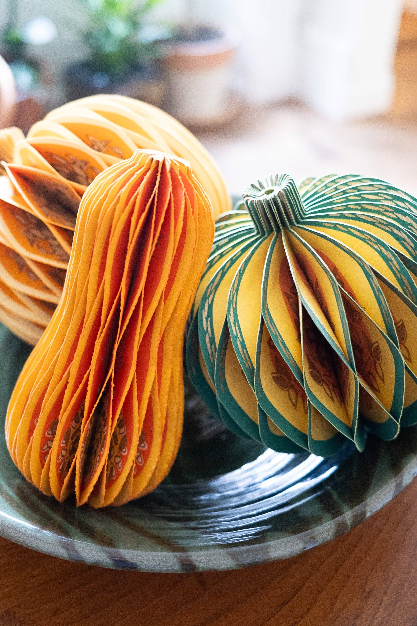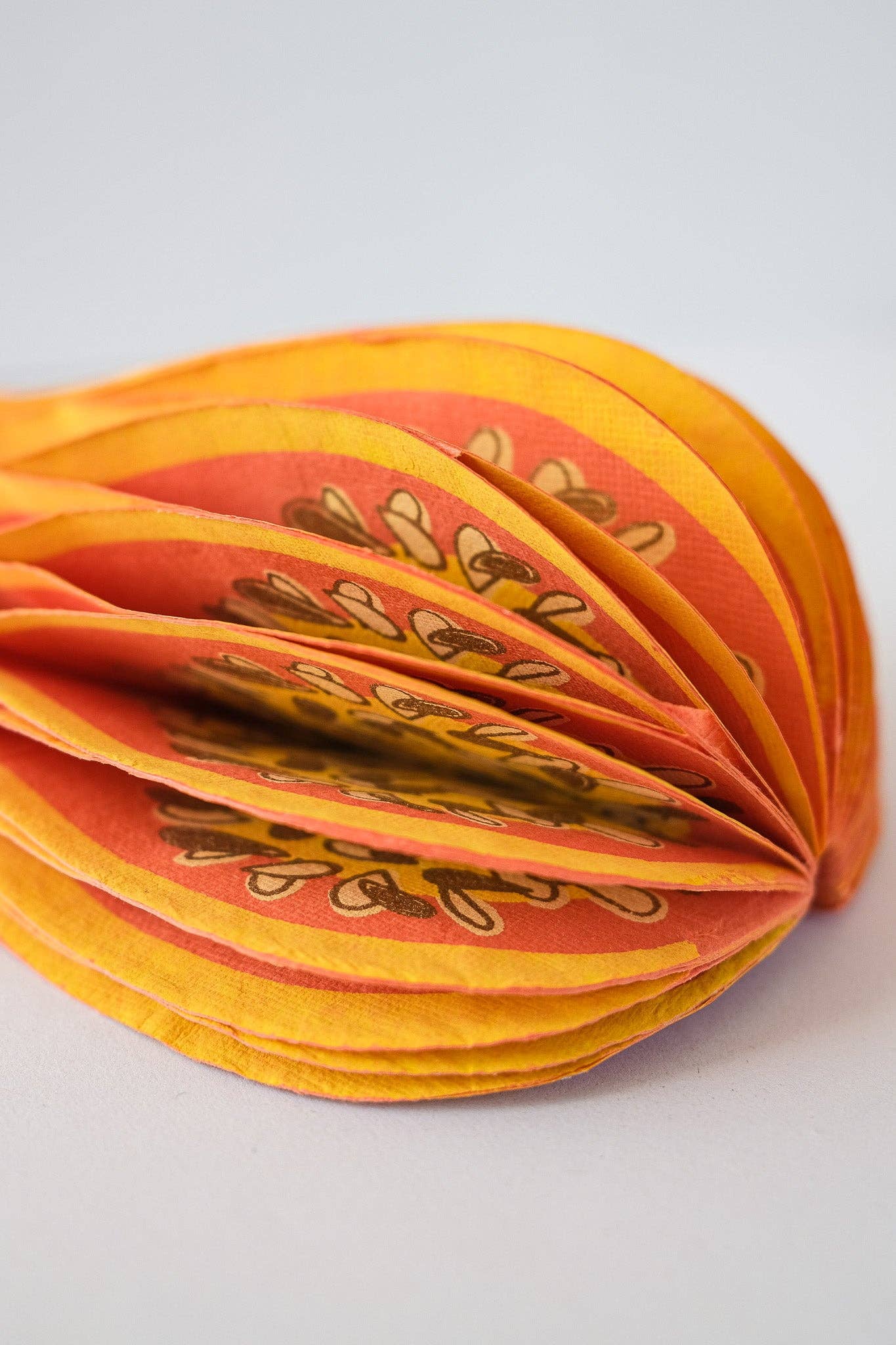 - One squash-shaped paper ornament with a cotton hanging loop - Each secured with a magnet - Screen printed by hand by talented artisans in Jaipur - Sustainably made from recycled materials