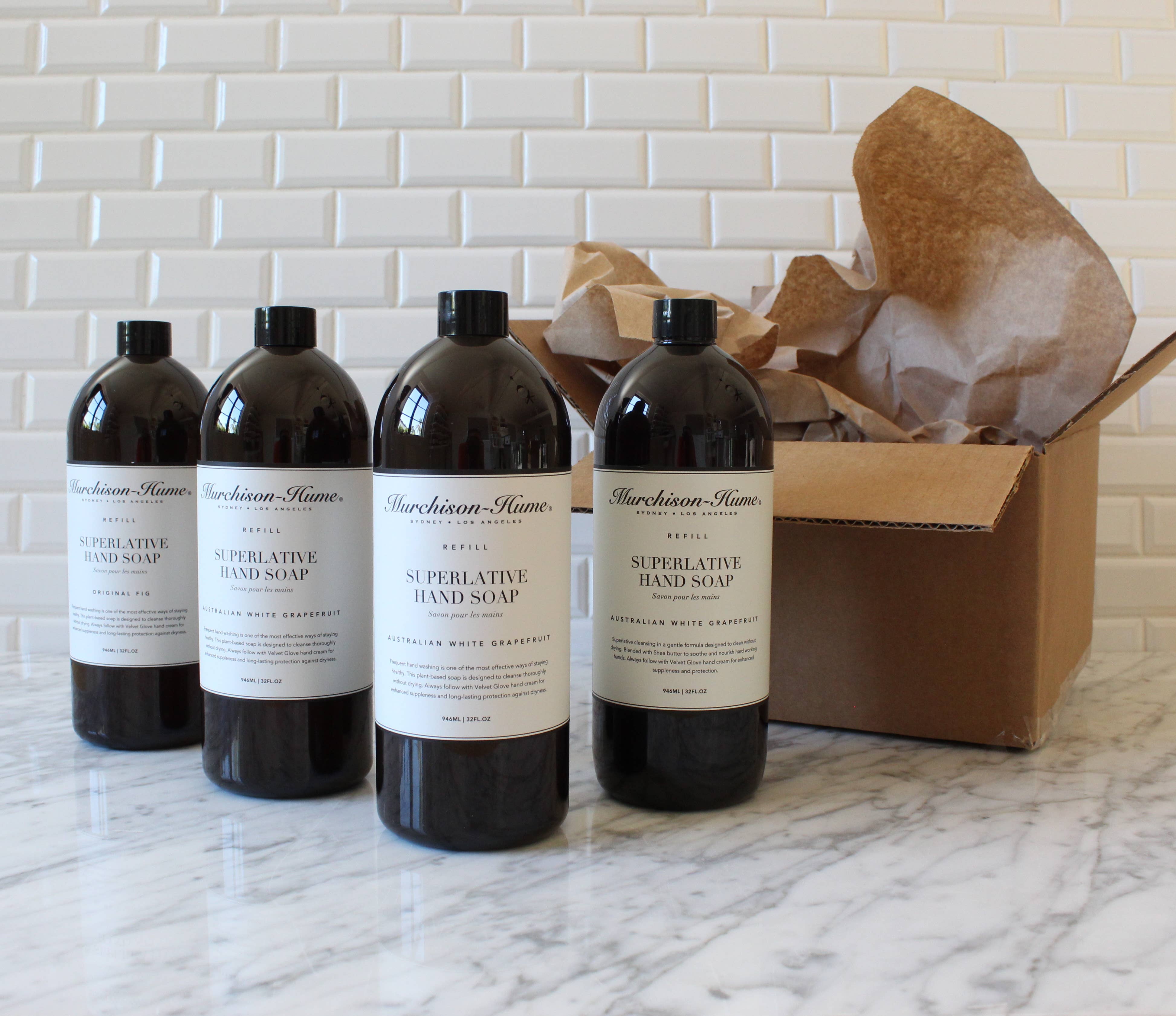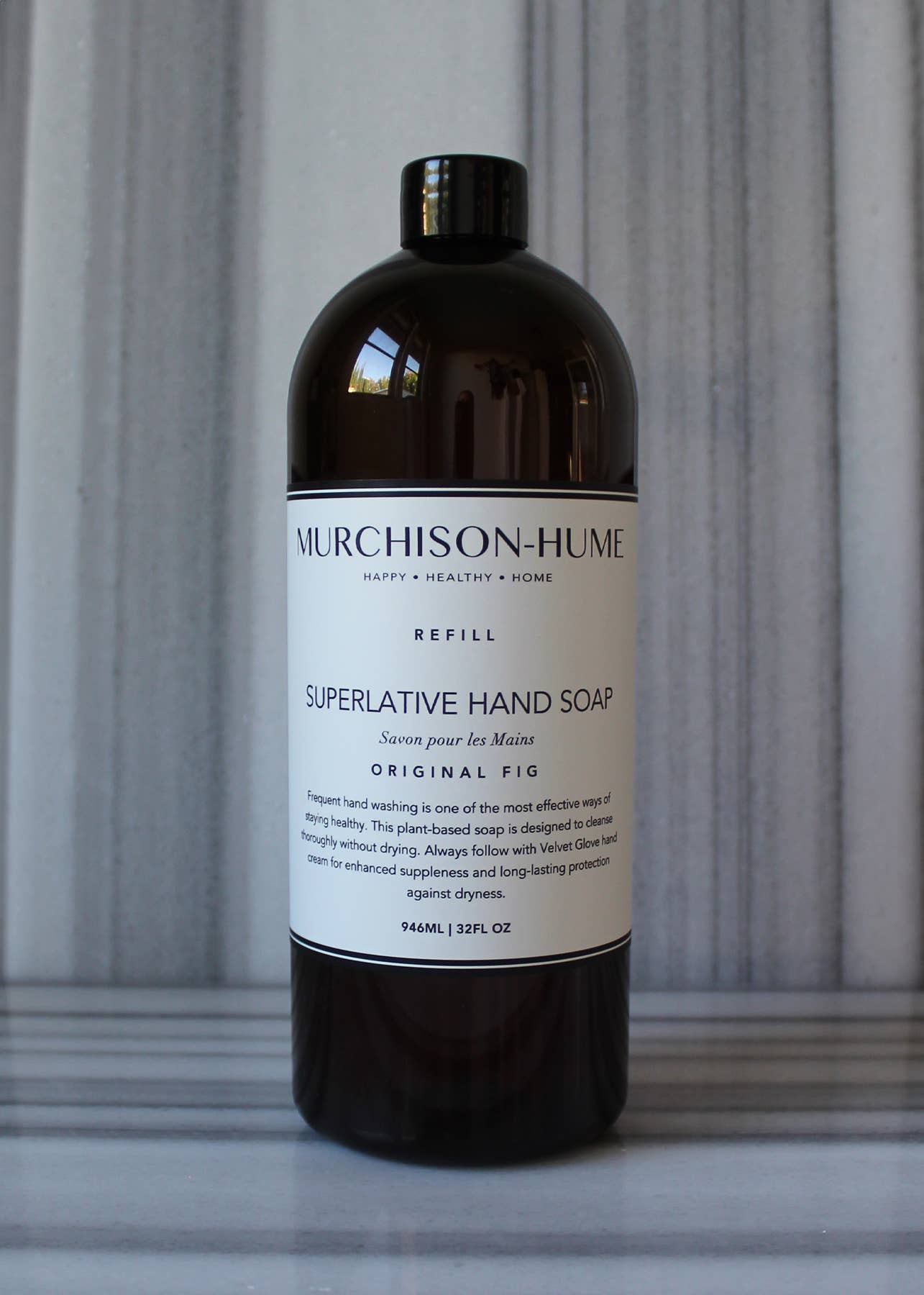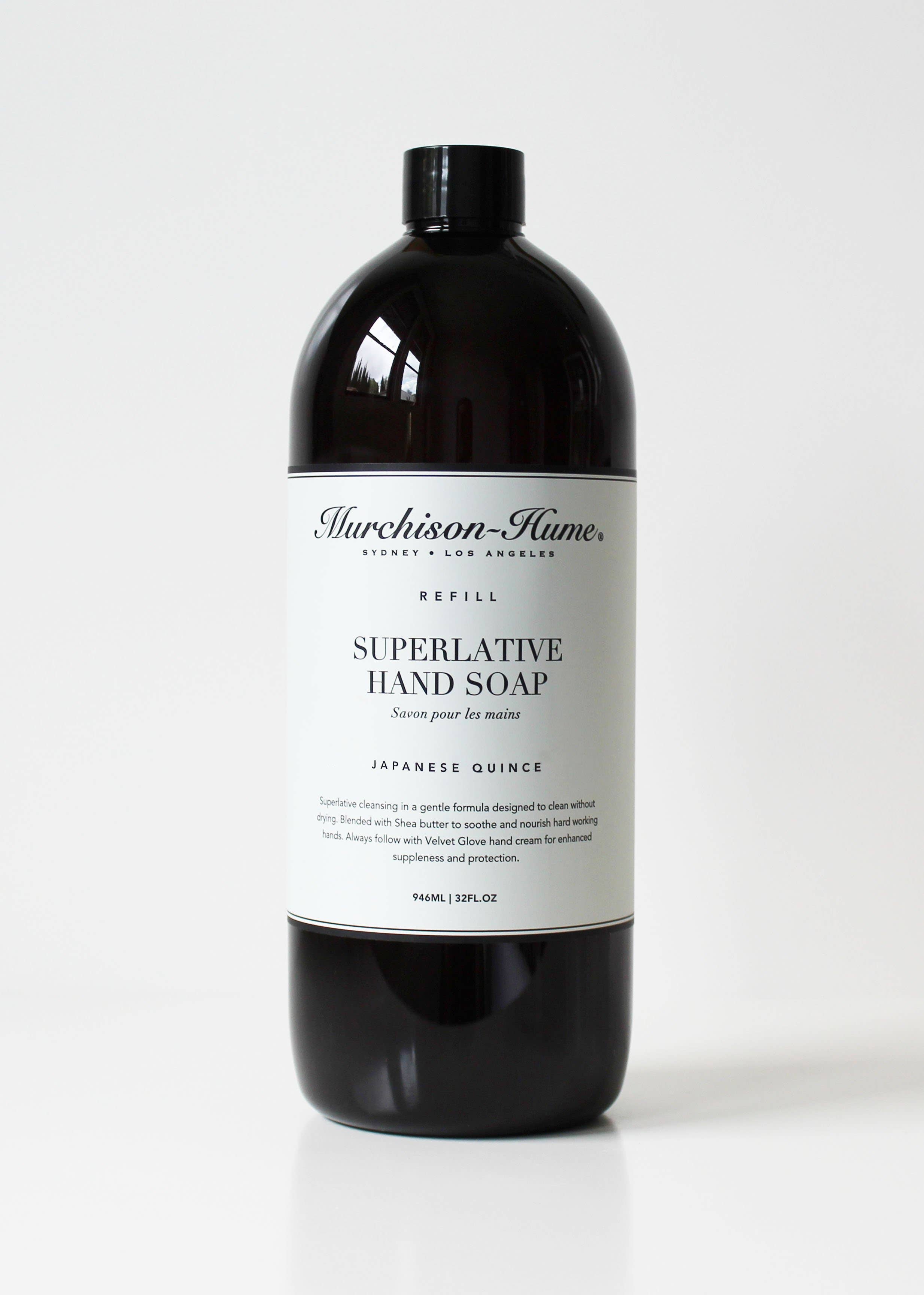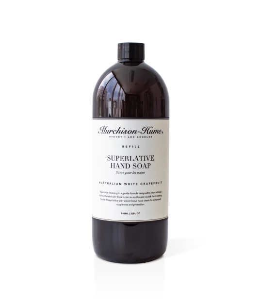 This 32oz bottle will refill two of our standard pump bottles. Our Superlative Hand Soap really lives up to its name. This gentle formula is designed to clean without drying. Blended with Shea butter and chamomile to soothe and nourish hard-working hands. You deserve it!